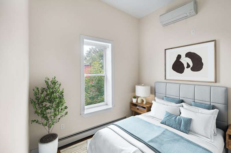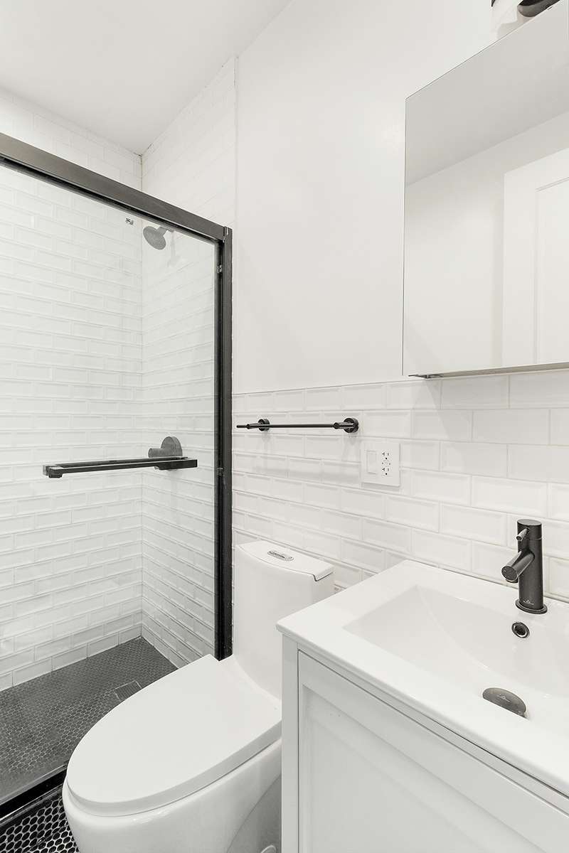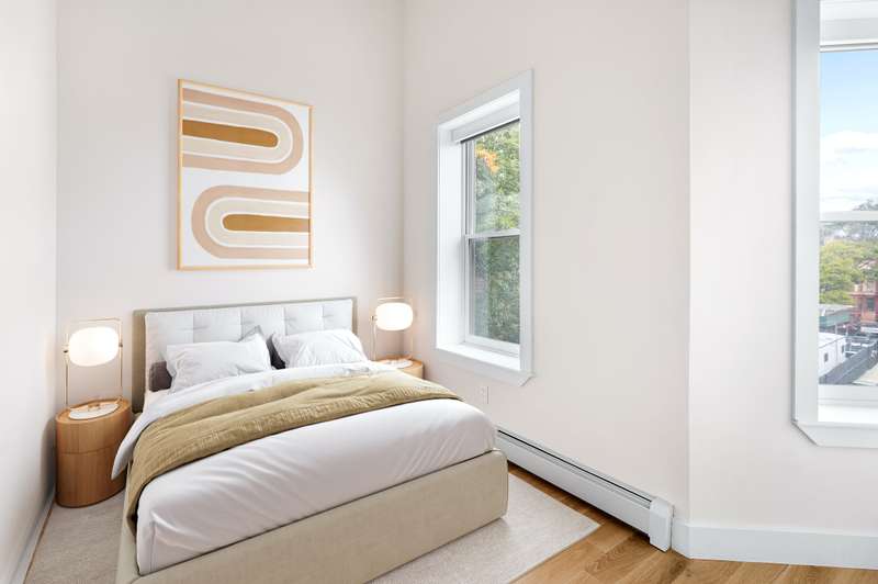 There are two bedrooms that sit perpendicular to each other, one facing north and one facing east. Each well-lit bedroom includes ample closet space. The full bath is located in the center of the apartment, complete with modern fixtures and under-sink storage.