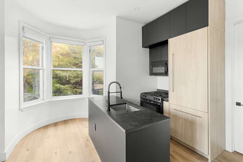 This unit enjoys northern and eastern light, a renovated kitchen, and an open plan living and dining area. The apartment's living room is welcoming and bright, featuring a large bay window facing east. A fully anointed kitchen with Caesarstone countertops, black cabinetry, and full size appliances including a paneled dishwasher is nicely separated from the living area by the breakfast bar.