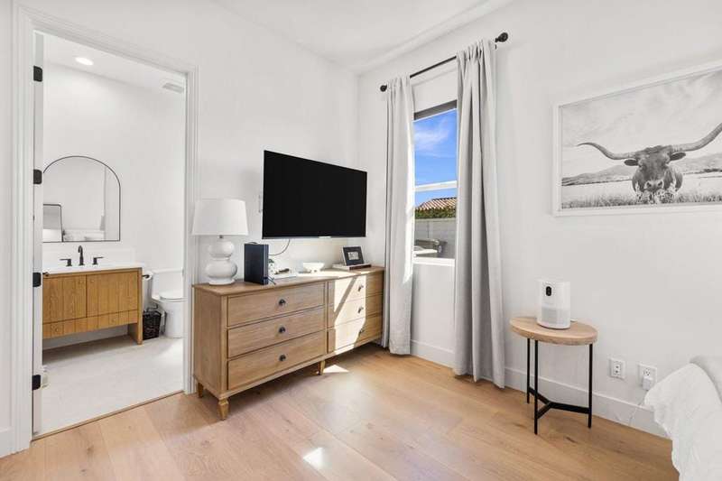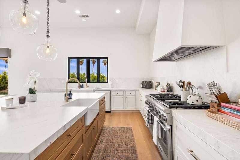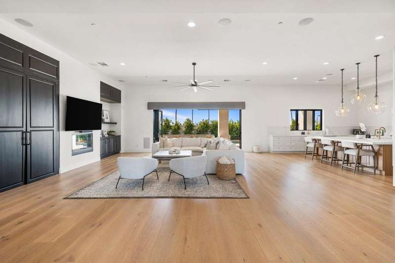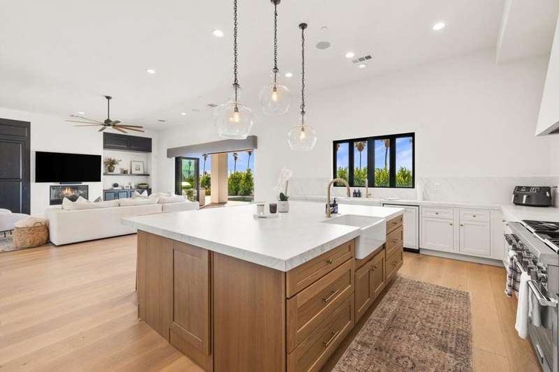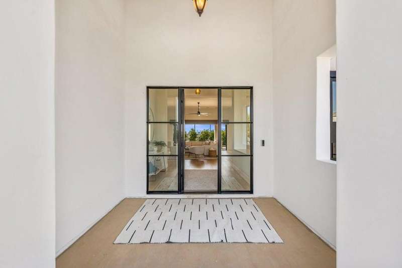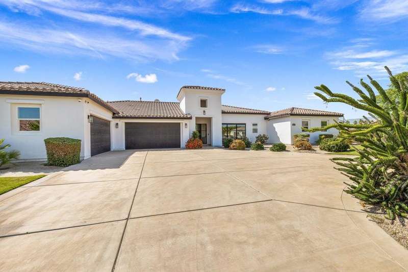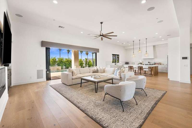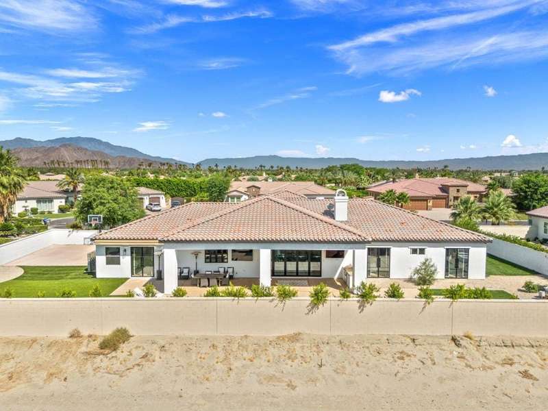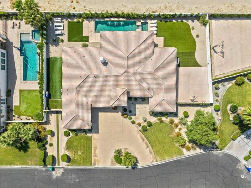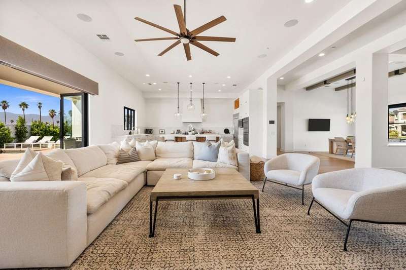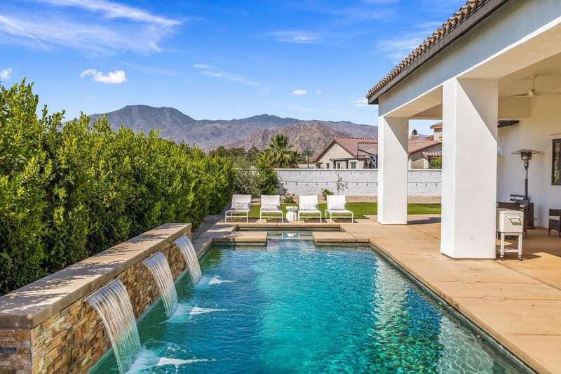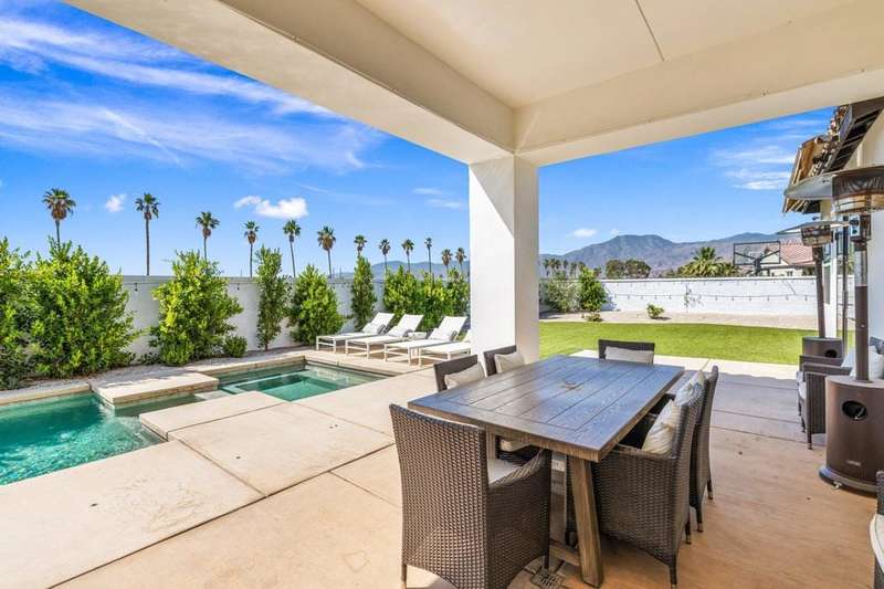 Welcome to your private desert sanctuary--a fully reimagined, design-forward escape just minutes from Old Town La Quinta, El Paseo, and walking distance to Coachella and Stagecoach. Taken down to the studs and rebuilt with purpose, this expansive single-level modern home seamlessly blends architectural sophistication with ultimate indoor-outdoor living.Inside, soaring ceilings and oversized black-framed pocket doors flood the space with natural light. The open-concept layout flows across wide-plank engineered white oak floors into four spacious en-suite bedrooms. The oversized primary suite is a true retreat, featuring spa-quality finishes, dual vanities, and direct patio access.Outfitted with a state-of-the-art Crestron smart system, the home offers effortless control of lighting, audio, climate, and media. With 8 smart TVs, zoned sound, and high-speed Wi-Fi, every space is designed for both relaxation and connection.The heart of the home opens to a resort-style outdoor living space with a custom pool and elevated spa, expansive built-in fire pit under the desert sky.Built-in BBQ for seamless al fresco dining. Private half basketball court for play or morning workoutsWhether you're entertaining or simply unwinding, this property offers the perfect balance of privacy, technology, style, and location. Just minutes from La Quinta Resort, world-class golf, and scenic desert trails--this is desert living, redefined.