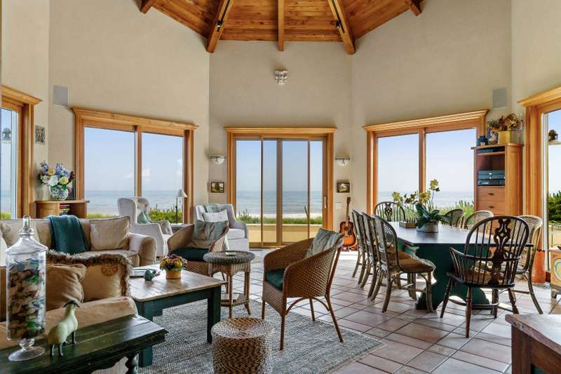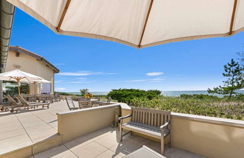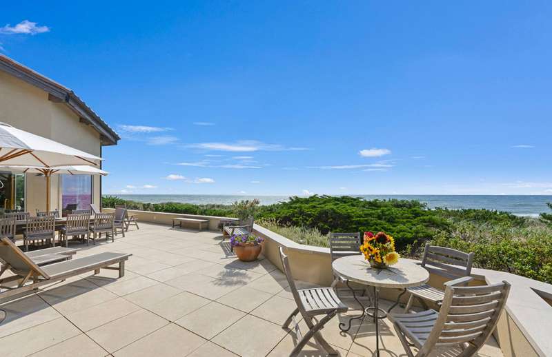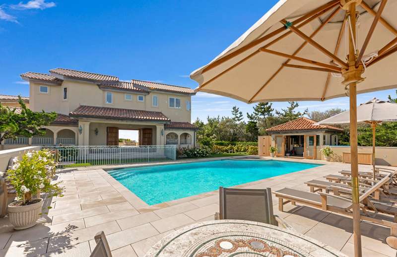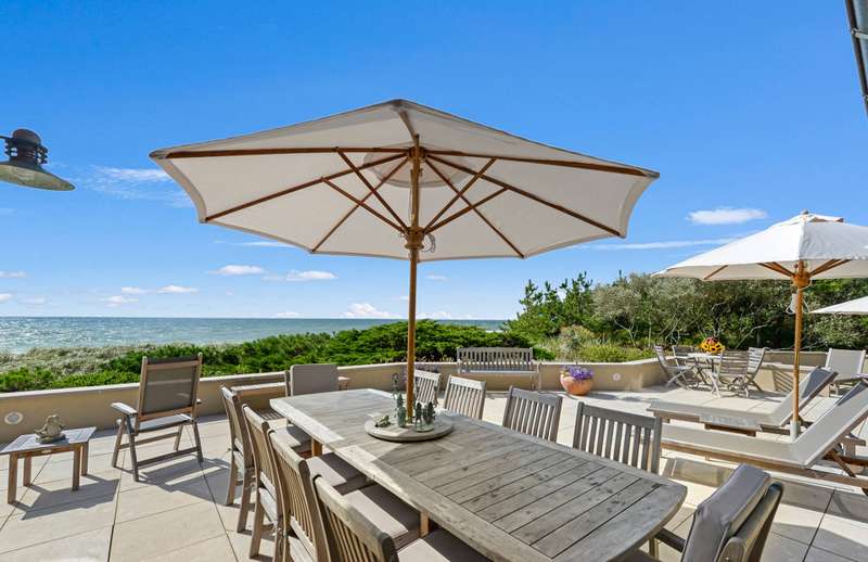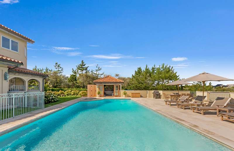 Rental Registration #24-873. Available two weeks in June 2026. A rare oceanfront home, with large heated pool and Jacuzzi, sits just steps to a beautiful Amagansett beach. With 5 bedrooms (all with TV's) and 5 1/2 baths, this Mediterranean style palacio is ideally suited for indoor/outdoor summertime living at its best. The oceanfront terrace provides endless clear views stretching up and down the coast and over the ocean beyond. The gorgeous pool area with built in spa offers an expansive entertaining space with a Pool House w/ TV, Kitchenette, Powder Room and outdoor shower. Two additional dens offer TV rooms. Sonos sound inside and out. The generous one acre +/- property with 220 feet of oceanfront is beautifully landscaped and also offers a private community tennis court. Ideally located approximately 1 mile from the Village of Amagansett and its shops and restaurants. Bask in summer's glory. Listing ID: 735911