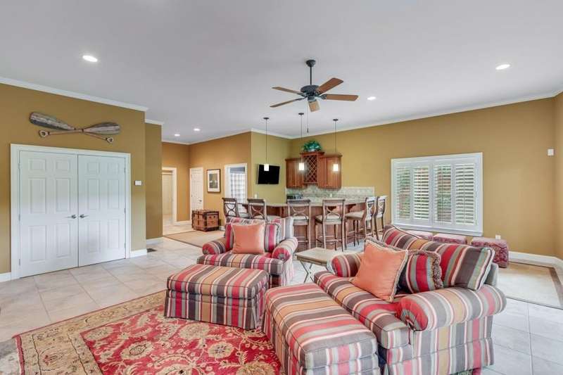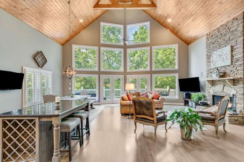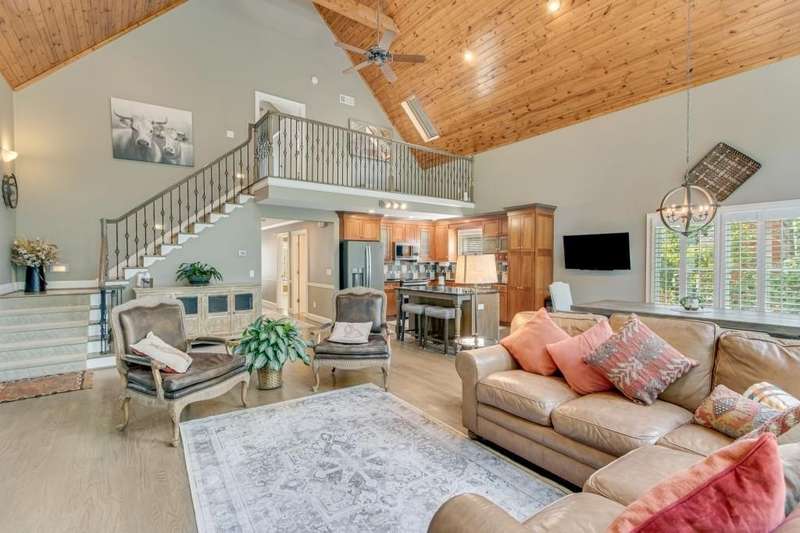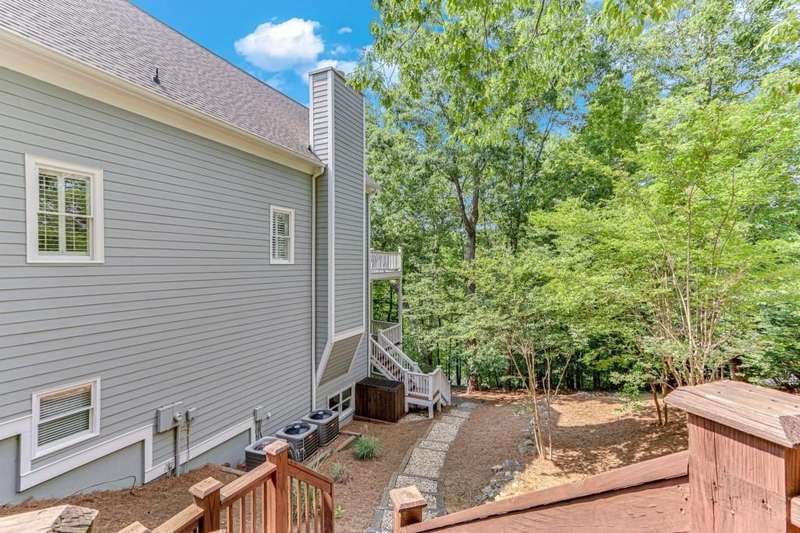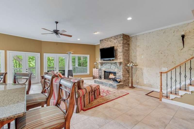 Discover the perfect blend of charm and functionality in this spacious craftsman home on Lake Lanier, offering plenty of room for family and friends! Thoughtfully designed with a resort-style feel, this property features two great rooms with stone fireplaces, two kitchens, and four covered porches ideal for entertaining in every season. Located in a prime Dawsonville spot just 30 minutes north of Atlanta and 15 minutes south of the Dahlonega wineries and fall festivals, this home is nestled in a secluded Lake Lanier neighborhood. Tucked away behind gates in a private three-home enclave, it sits just steps from the water on a protected deep-water cove. Enjoy easy lake access from your private twin-slip dock with a party deck perfect for sunbathing and gatherings, with calm waters ideal for swimming and floating. Inside, the main level features an open floor plan with a two-story vaulted ceiling and stone fireplace, hardwood floors, a spacious kitchen with an island, two bedrooms, and a full bath. The upstairs owner's suite includes a loft sitting area, ideal for a reading nook or office space, and offers serene views. The finished terrace level mirrors the main level layout, complete with a second kitchen, two bedrooms, and a full bath perfect for guests or multi-generational living. The unfinished daylight basement offers even more potential for game rooms, storage, or lake toys. A detached two-car garage with an upstairs storage room adds extra flexibility. With ample parking for trailers and visitors, the shared gated driveway serves just three homes. No HOA, but residents share annual maintenance costs (approximately $600-700 per year) for the gate and common landscaping. Ideal for full-time living or Airbnb potential, this home offers a unique opportunity to enjoy the best of lake life!
