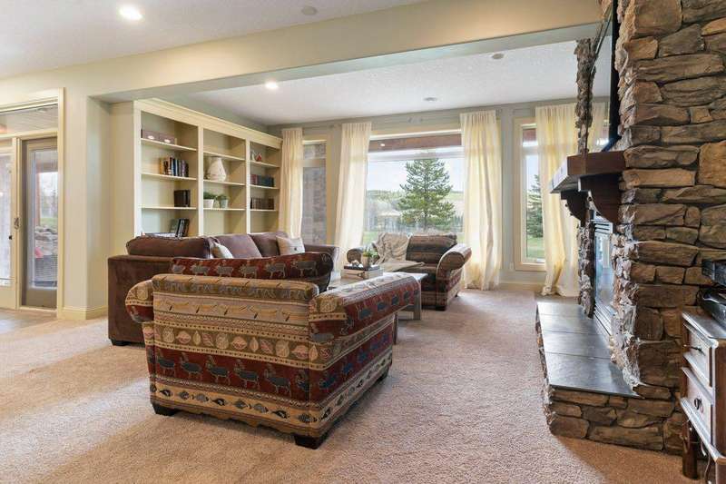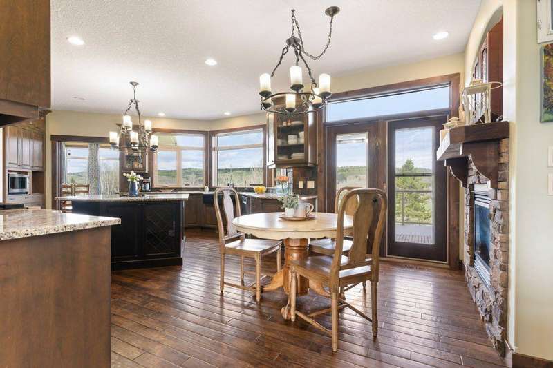 Nestled in the prestigious Priddis Creek Estates, this exceptional timber frame-style, walk-out bungalow offers the perfect blend of rustic charm and modern luxury. As you approach the residence, you'll immediately note the striking architectural details and thoughtful design that harmonizes with the surrounding natural landscape. Step inside to discover soaring ceilings and hand-hewn hickory floors that create a warm, inviting atmosphere throughout the main level. The open concept living space is anchored by one of four magnificent fireplaces found throughout the home, providing both ambiance and comfort. Expansive windows and strategically placed skylights bathe the interior with natural light while framing picturesque views of the surrounding countryside. The gourmet kitchen flows into dining and entertainment areas, ideal for both intimate family gatherings and larger social events. Custom built-in bookcases and clever storage solutions maintain the home's elegant aesthetic while providing ample space for organization. A sophisticated office loft offers a quiet retreat for working from home, while the walkout lower level features high ceilings, creating bright, airy spaces that defy the typical basement feel. The lower level continues the home's commitment to luxury with additional fireplaces and seamless access to the gorgeous outdoor space. Modern conveniences include energy-efficient in-floor heating, a recently upgraded boiler (3 yrs), comprehensive water treatment system, and on-demand hot water for ultimate comfort and efficiency. The triple garage provides abundant space for vehicles and storage, with room for recreational equipment for all your mountain adventures. Priddis Creek Estates offers an exceptional community lifestyle with its inviting clubhouse, riding arena and network of walking/biking paths. Enjoy the serenity of country living while maintaining proximity to urban amenities. Golf enthusiasts will appreciate being minutes from the renowned Priddis Greens Golf and Country Club, while outdoor adventurers will treasure the quick access to the majestic Rocky Mountains. This distinctive property represents a rare opportunity to embrace the coveted foothills lifestyle in one of Alberta's most sought-after communities. Experience the perfect harmony of rustic elegance and contemporary comfort in this extraordinary timber frame home. Contact your favourite REALTOR® today for a private showing.