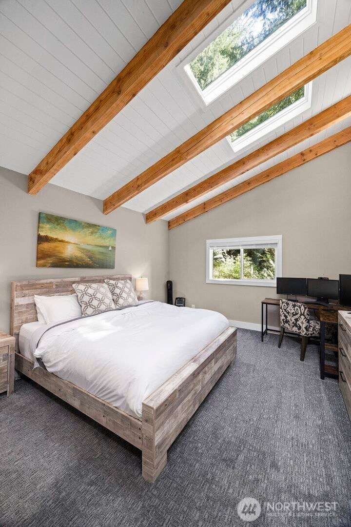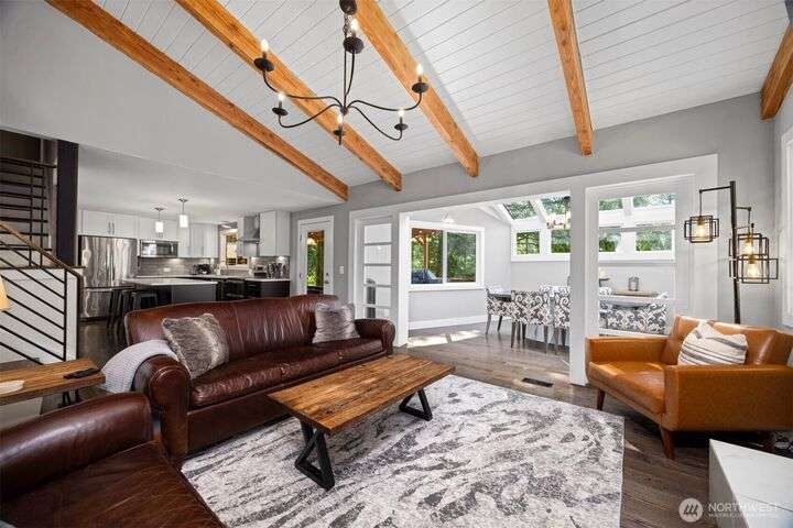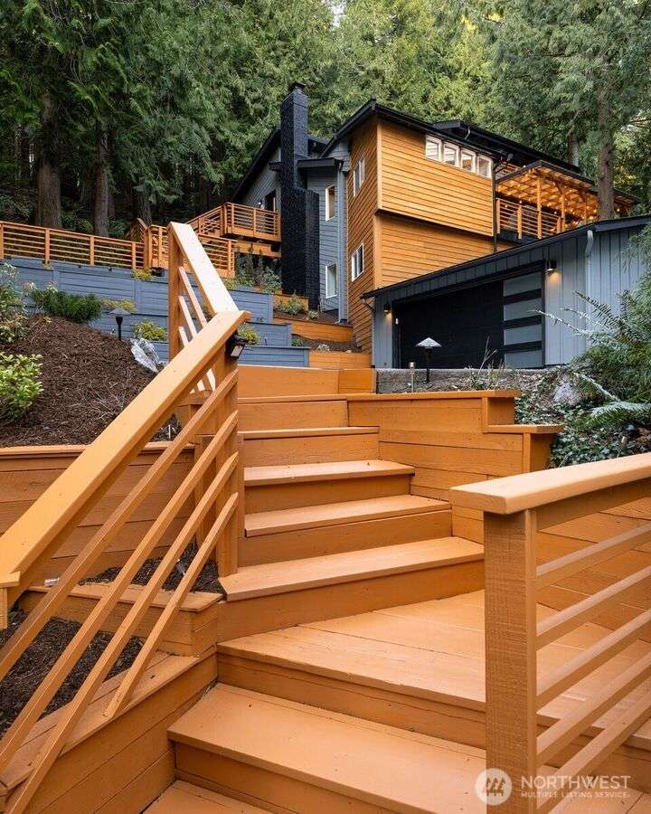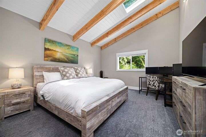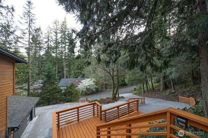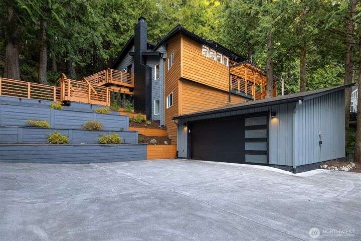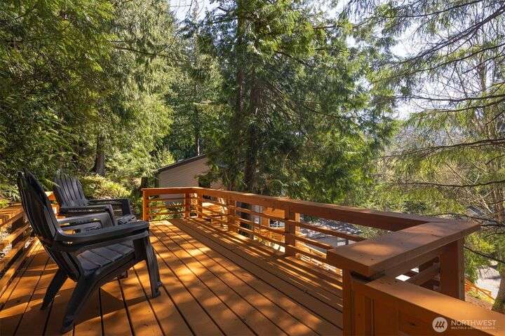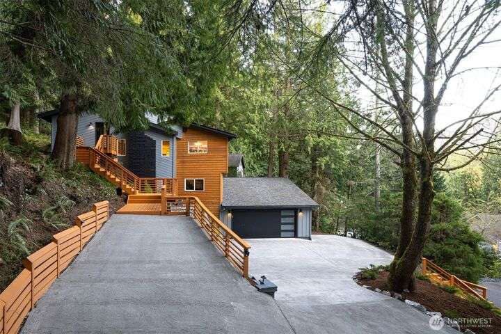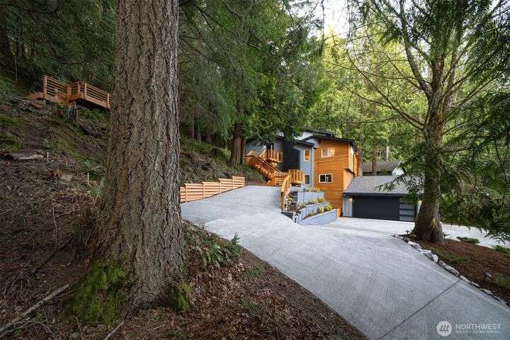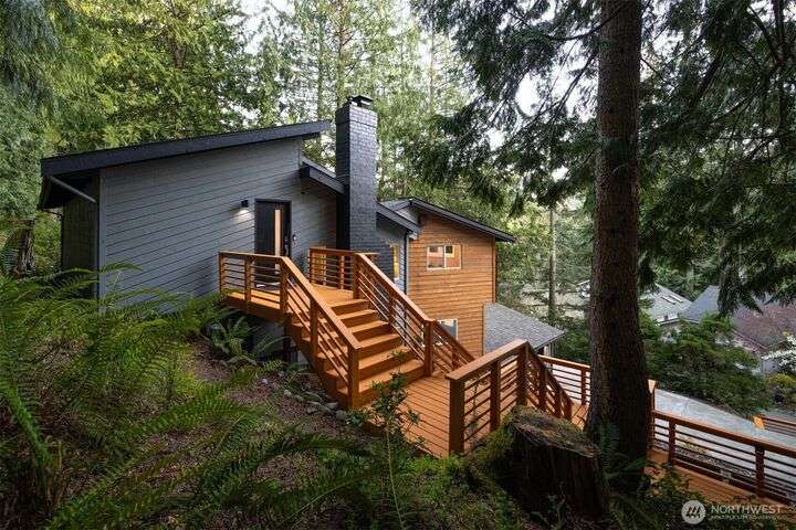 Fully remodeled & stunning, this custom home sits on a private, park-like double lot w/mature trees & privacy. Distinctive architecture fts soaring ceilings, exposed beams, new windows & quality craftsmanship. Kitchen fts quartz counters, SS appliances & sunroom that opens to main living area w/fireplace. Luxe primary suite inclds walk-in closet, double vanity & custom tilework. Second primary upstairs adds flexibility. Downstairs fts bonus BR & full movie theater/4th BR. Extensive outdoor decking, built-in seating & hot tub make entertaining easy. Generous parking & oversized 2-car garage. Proven short-term rental, offered partially furnished as income-generating opportunity or private escape. Access to golf, marina, beaches, trails + more