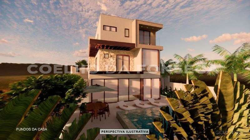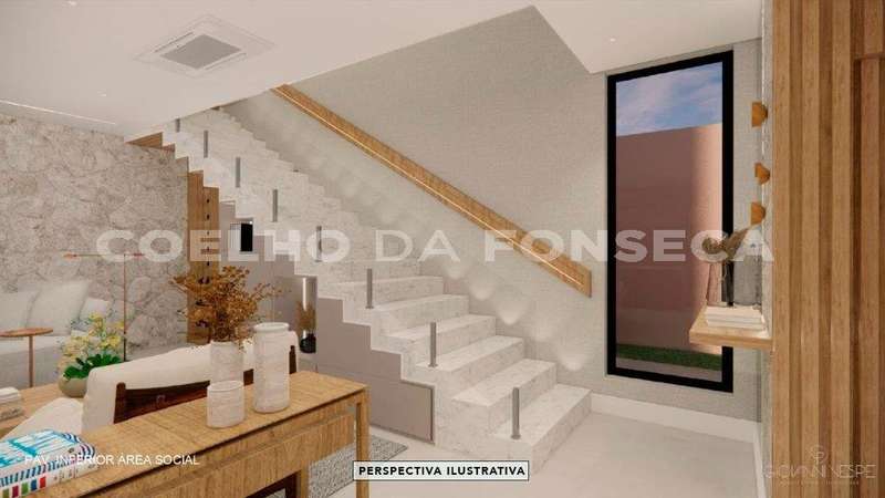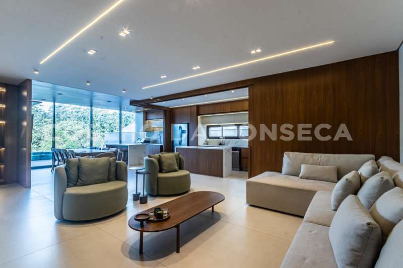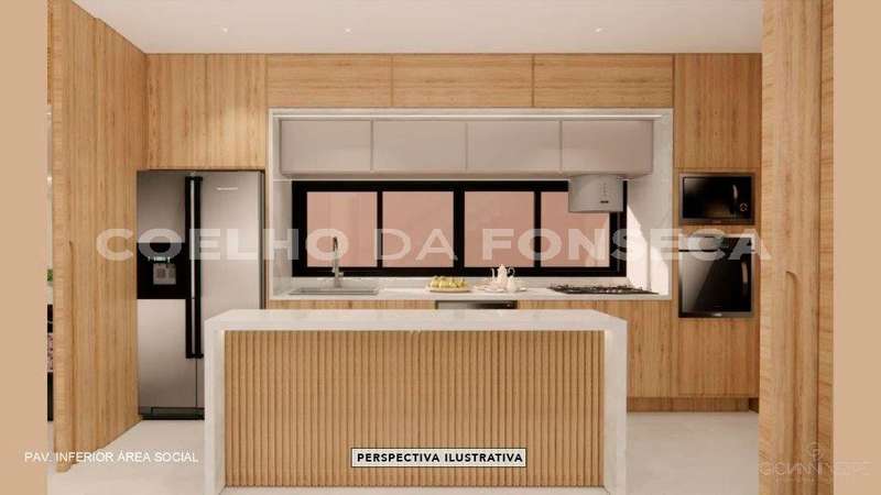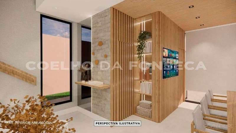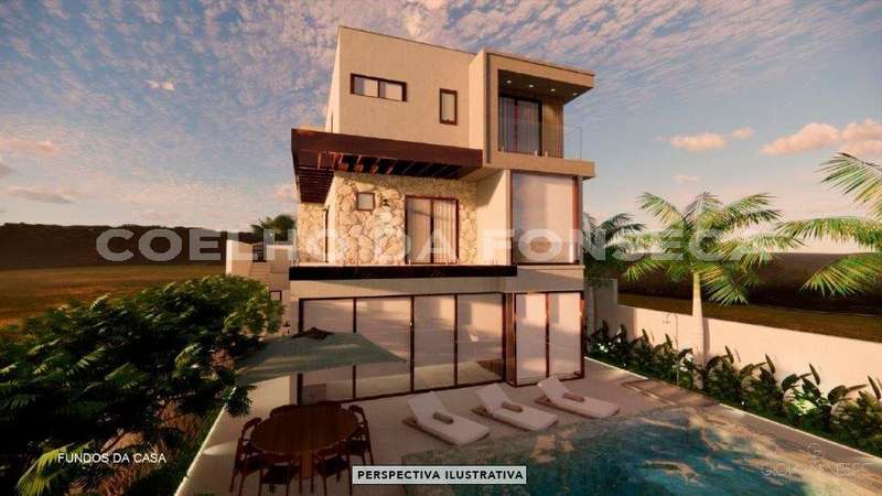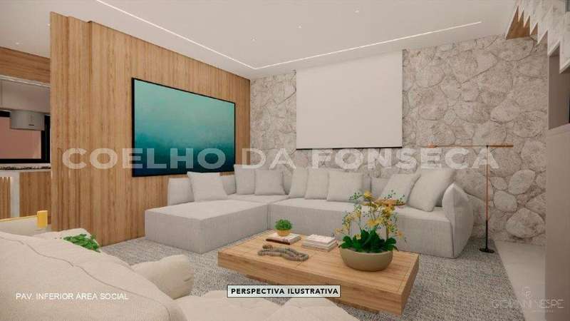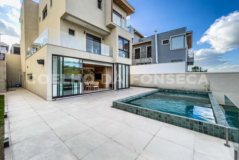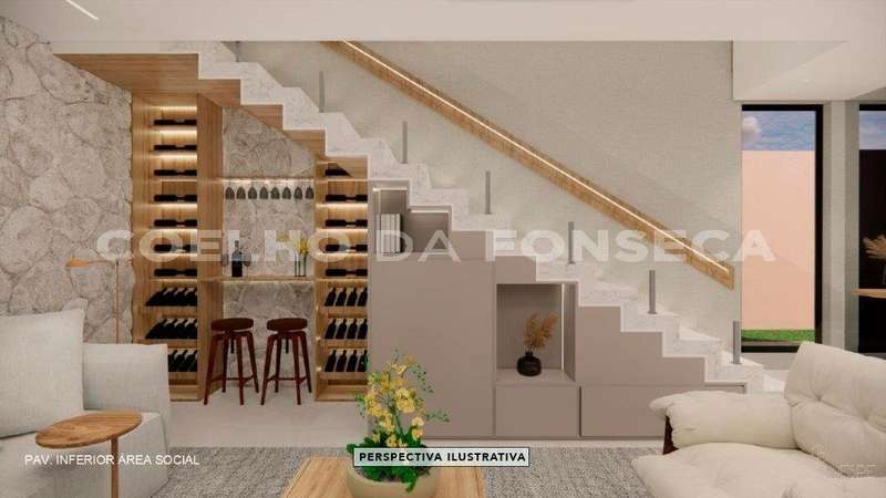 Imóvel de 3 andares, sendo o superior com 2 suítes e 1 suíte master (closet e roupeiro com filtro de água e frigobar). No térreo, 1 suíte, sala de TV, escritório, lavabo, garagem e depósito. No inferior, sala, cozinha, área gourmet (churrasqueira a gás), piscina, lavabo, área de serviço e banheiro completo. Aquecedor híbrido solar/elétrico, energia fotovoltaica estimada 730 kWh/mês, ar condicionado completo, piso porcelanato em todos ambientes (suítes com vinílico), suítes com persiana elétrica. Cozinha com lâmina Sinterizada snow river, lavabos de mármore travertino romano e cuba esculpida; demais banheiros, quartzo branco. Previsão de término: dezembro/23.