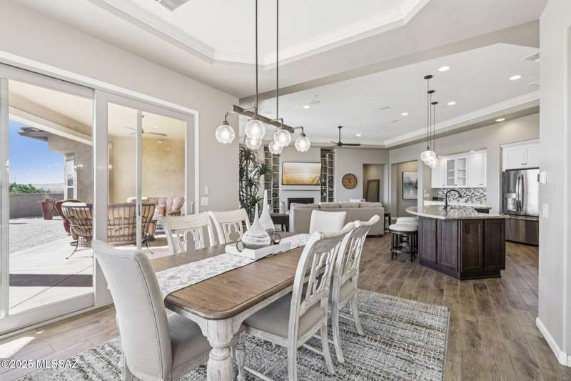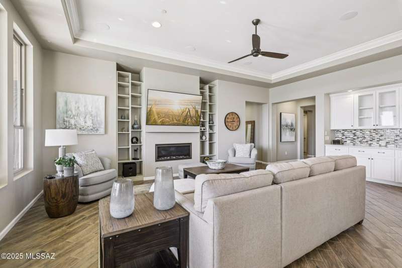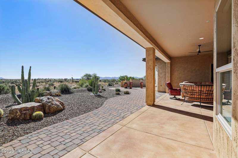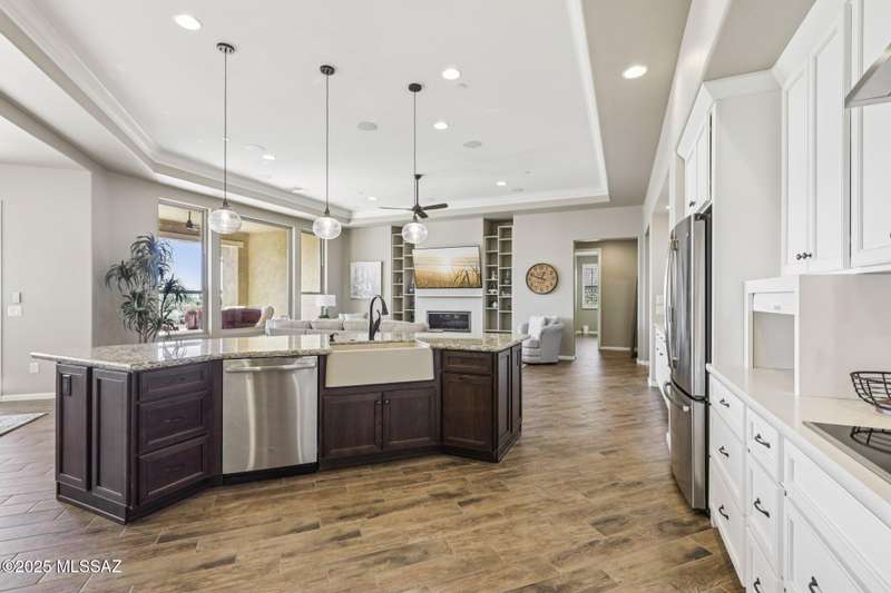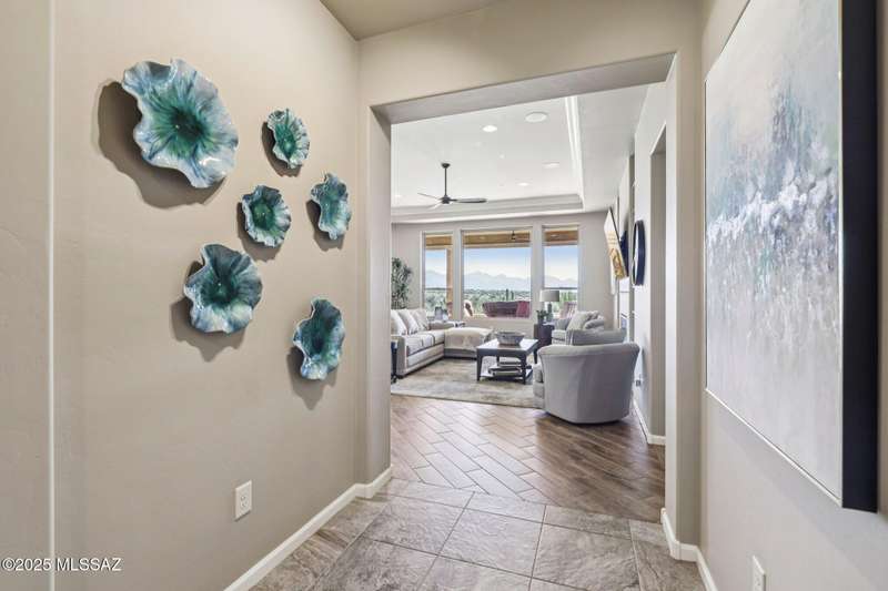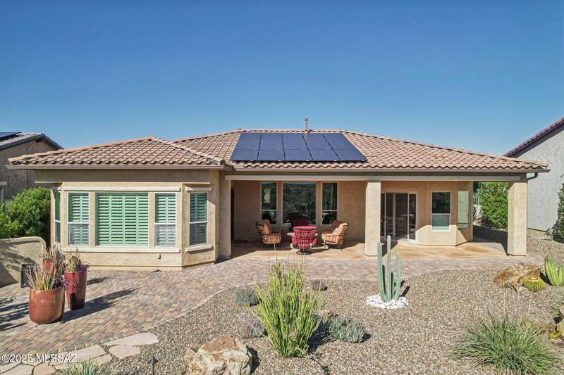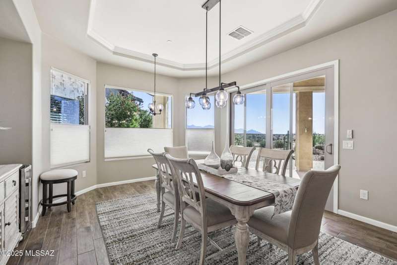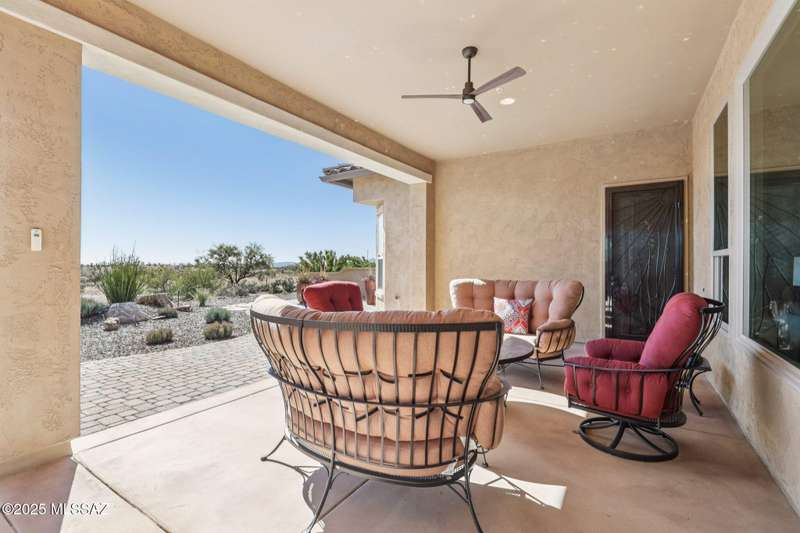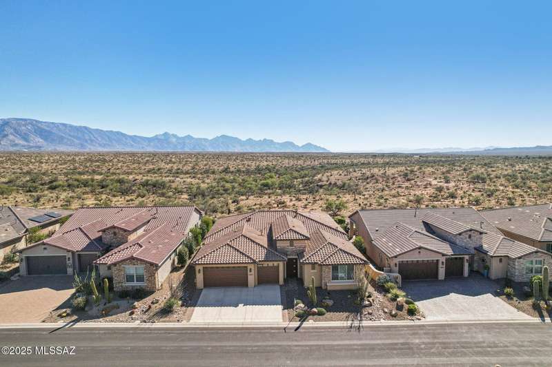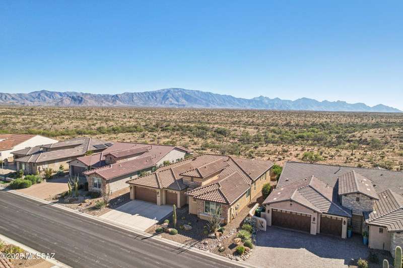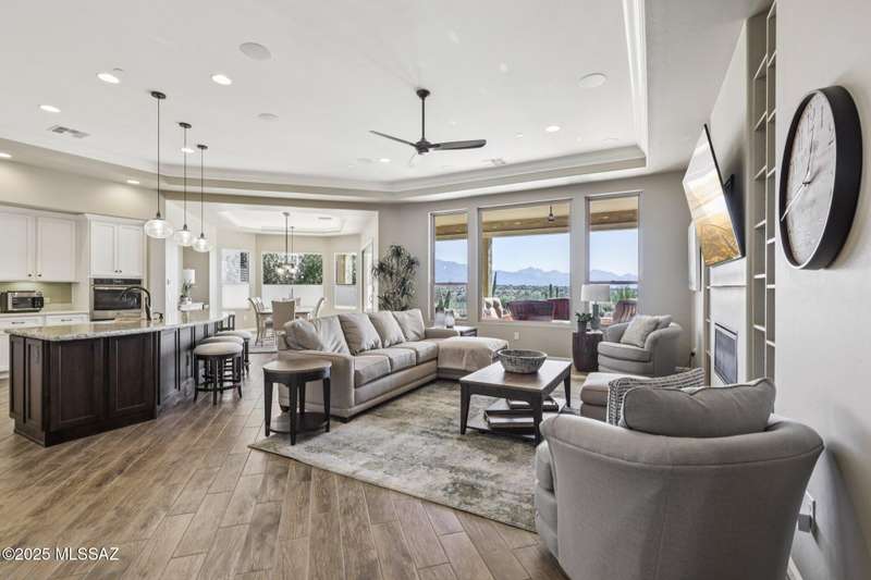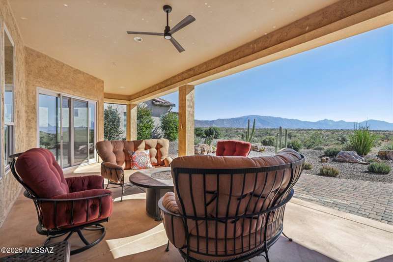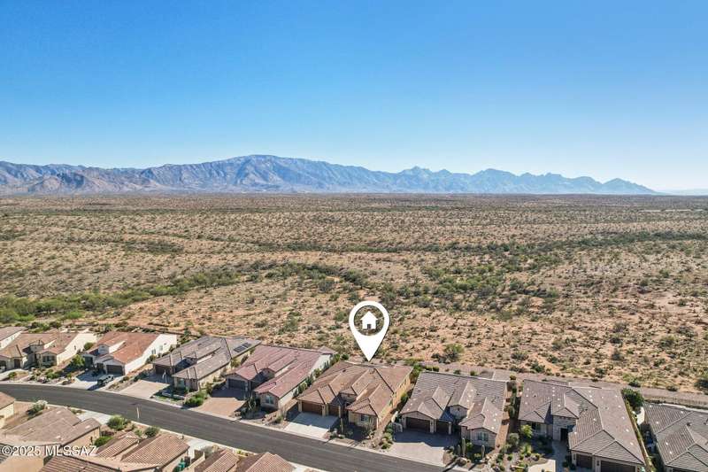 Views Views Views. The moment you step through the front door you are greeted with expansive desert views and unobstructed mountain views beyond. This highly upgraded home features the sought after Solstice floorplan with great room, spacious kitchen, and dining room all open to each other making it perfect for entertaining. Gourmet chef's kitchen features two tone cabinetry, built-in bar area with glass front cabinets, appliance garage, professional s/s appliances incl induction cooktop and microwave drawer. Large curved island with apron front sink, sit up bar and custom pendant lighting. Light and bright great room has contemporary style linear electric fireplace, display shelves, and surround sound system. Large Primary Suite features bay windows allowing for views and tons of natural