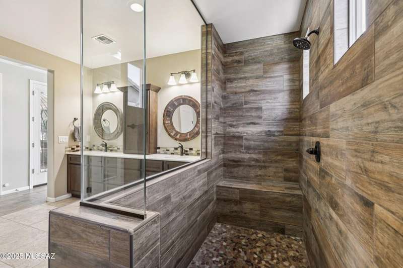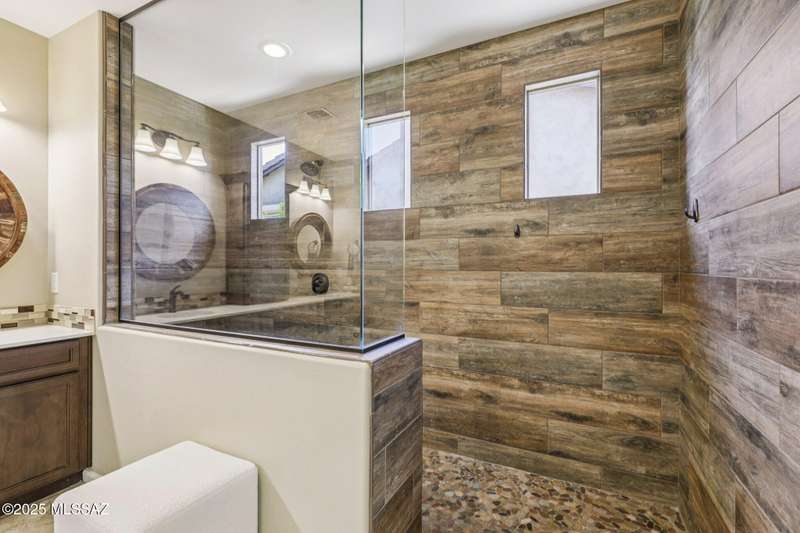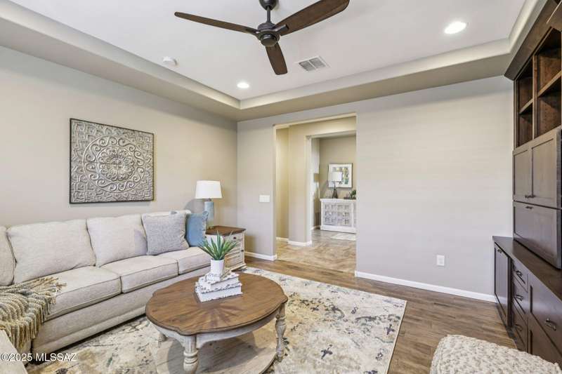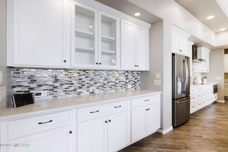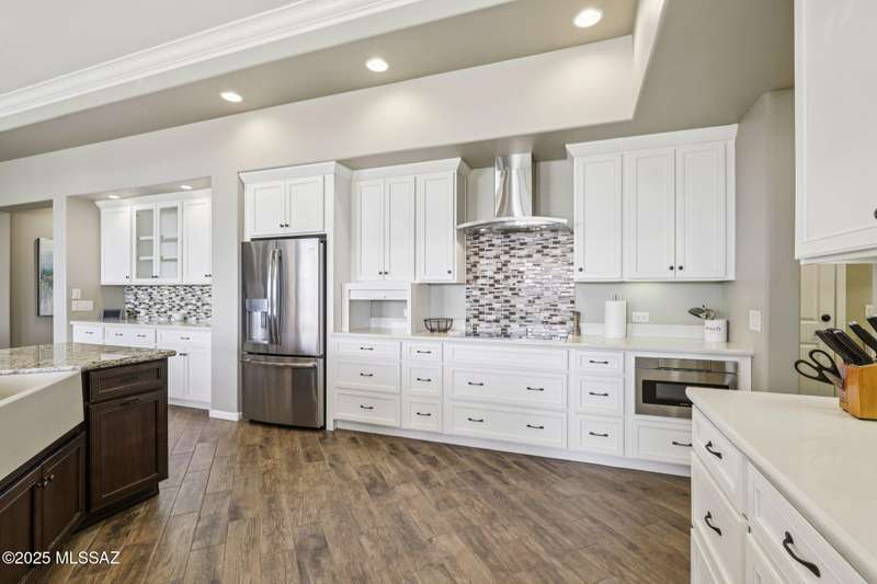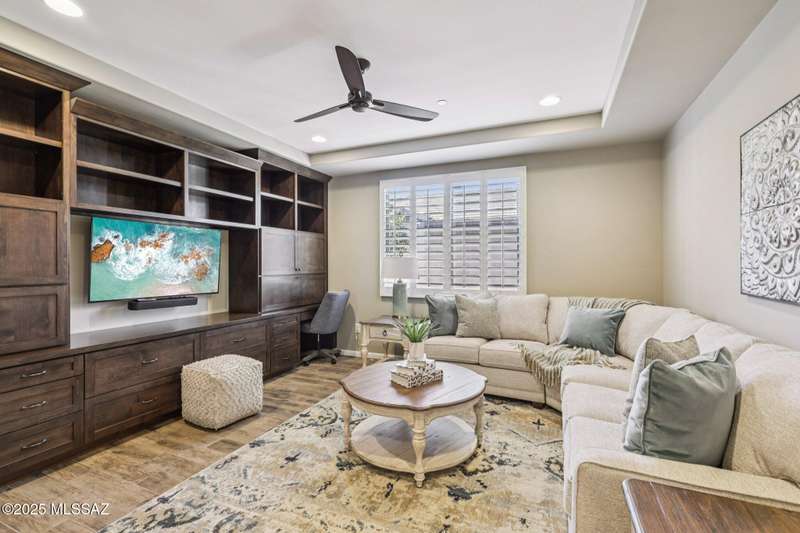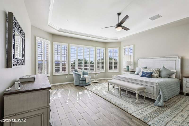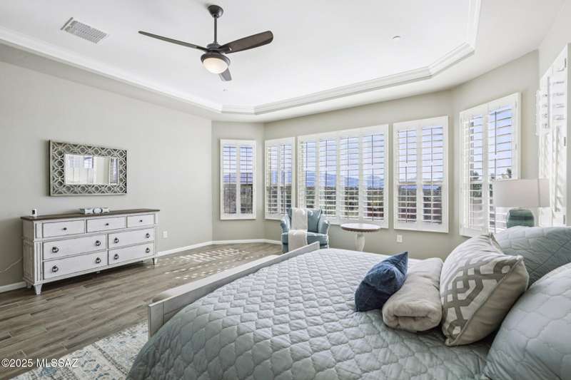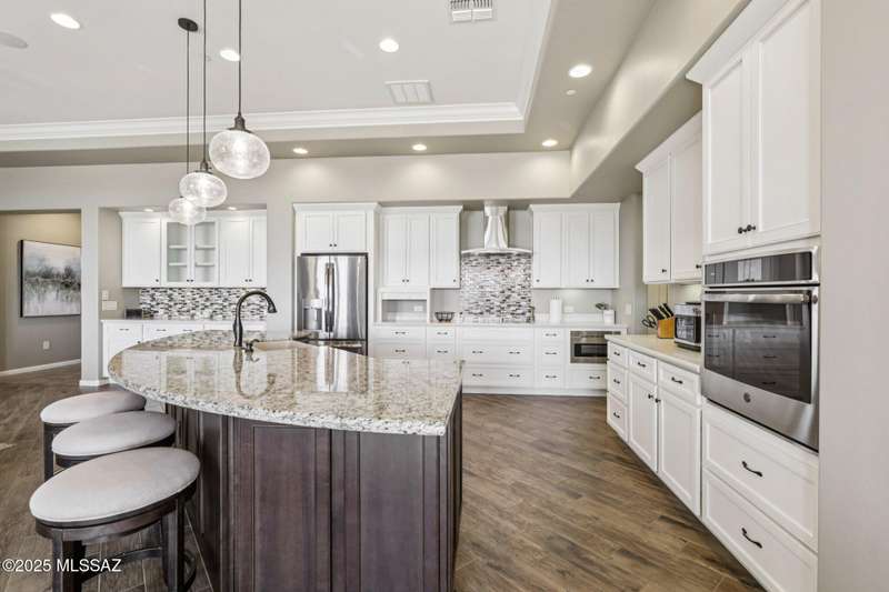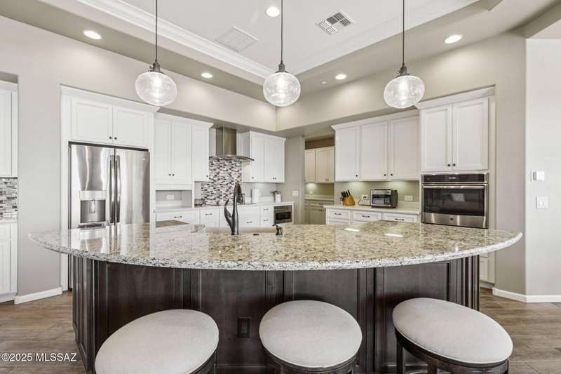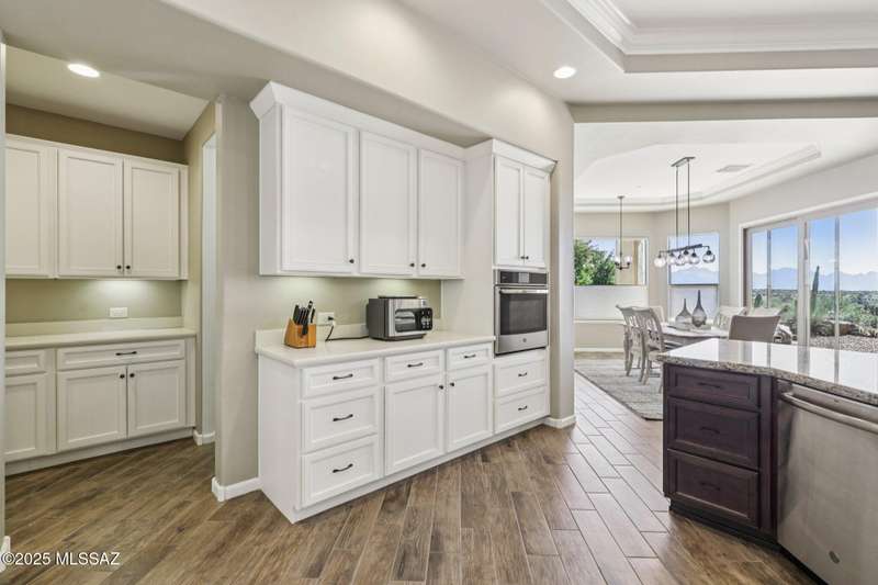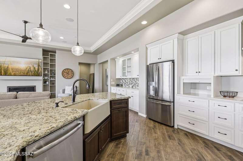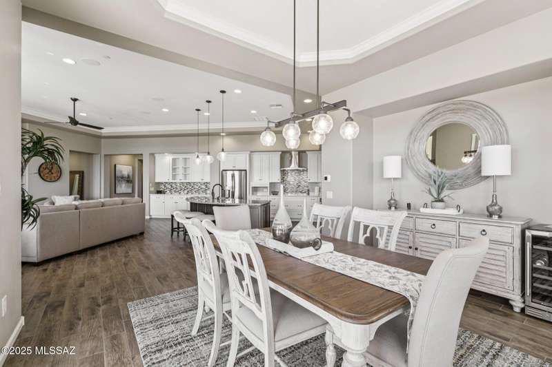 Views Views Views. The moment you step through the front door you are greeted with expansive desert views and unobstructed mountain views beyond. This highly upgraded home features the sought after Solstice floorplan with great room, spacious kitchen, and dining room all open to each other making it perfect for entertaining. Gourmet chef's kitchen features two tone cabinetry, built-in bar area with glass front cabinets, appliance garage, professional s/s appliances incl induction cooktop and microwave drawer. Large curved island with apron front sink, sit up bar and custom pendant lighting. Light and bright great room has contemporary style linear electric fireplace, display shelves, and surround sound system. Large Primary Suite features bay windows allowing for views and tons of natural