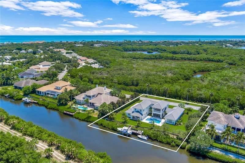 Positioned in the estate section of The Estuary, this 2023 5BR 5.5BA custom home w/ first-floor primary suite epitomizes coastal elegance. Stunning 5,500 sq ft residence showcases custom millwork, European white oak floors, and Thermador/Sub-Zero kitchen with quartz countertops. Striking fireplace is framed by exquisite natural quartzite. Poised on a private 1/2+ acre Intracoastal lot overlooking the tranquil Bee Gum Point bird sanctuary, the outdoor oasis comprised of pool, patio, summer kitchen, and covered porches, embraces seamless Florida indoor/outdoor living. Private dock/lift.
