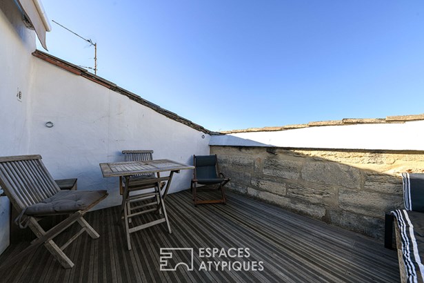 But the real surprise is revealed beyond a French window: an intimate 11 sqm terrace, suspended between sky and stone, offering a poetic view of the rooftops of Uzes and the surrounding nature.