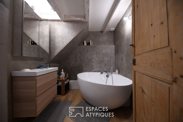 Then, on the top floor, the light becomes softer. A bathroom with bathtub, a 7 sqm dressing room and a cozy living room extended by a mezzanine, ideal for an inspiring office or a spare bedroom.