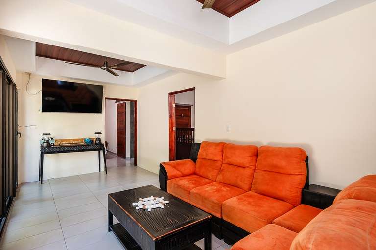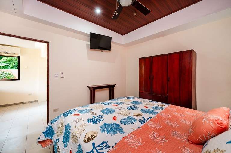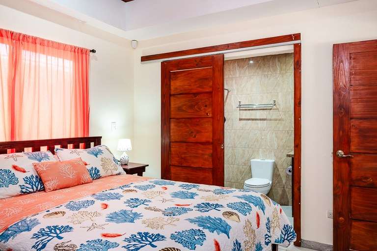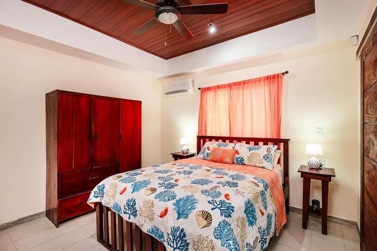 The home features three well-appointed bedrooms, each designed for comfort and tranquility. All include ceiling fans, wardrobes, and tasteful furnishings. The primary suite includes a spa-like en-suite bathroom with a ceiling light panel that brings in natural light, while a second full bathroom serves the additional bedrooms, offering both privacy and convenience.