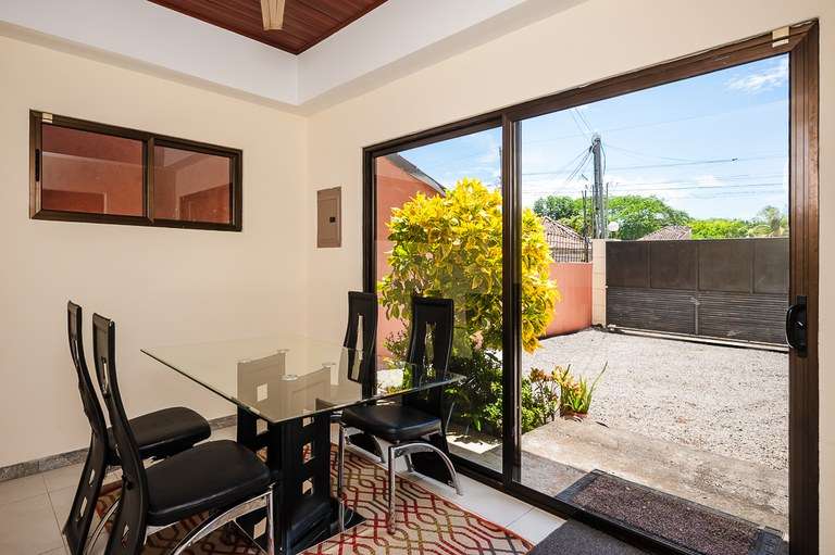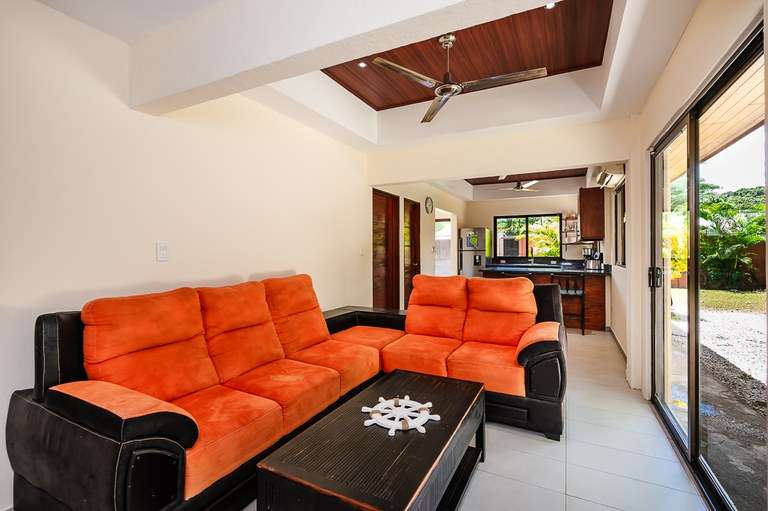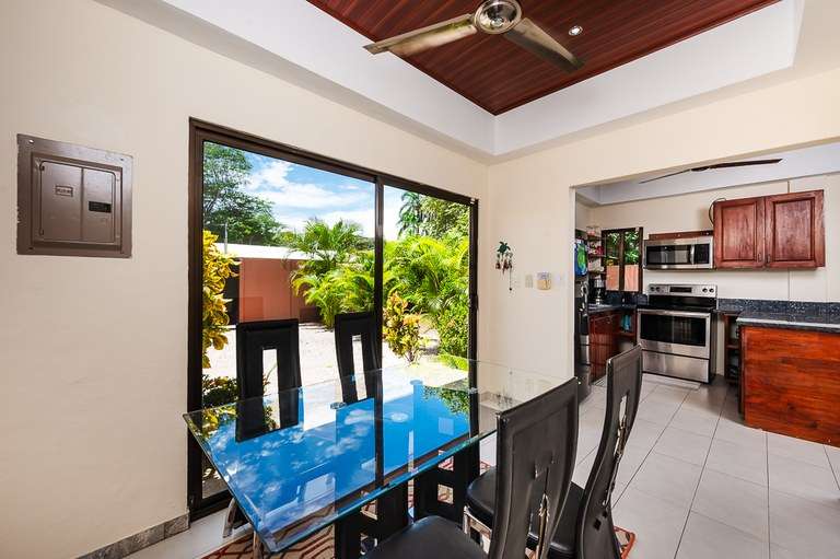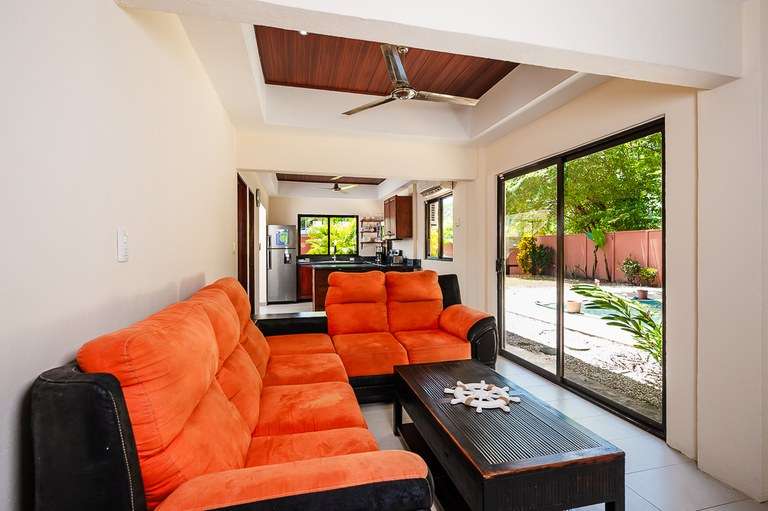 The open-concept living area is bright and airy, with ample room for a large sitting area and direct access to the inviting outdoor space. Double sliding glass doors lead to a covered terrace—ideal for al fresco dining or simply relaxing while taking in views of the lush backyard and sparkling private pool.