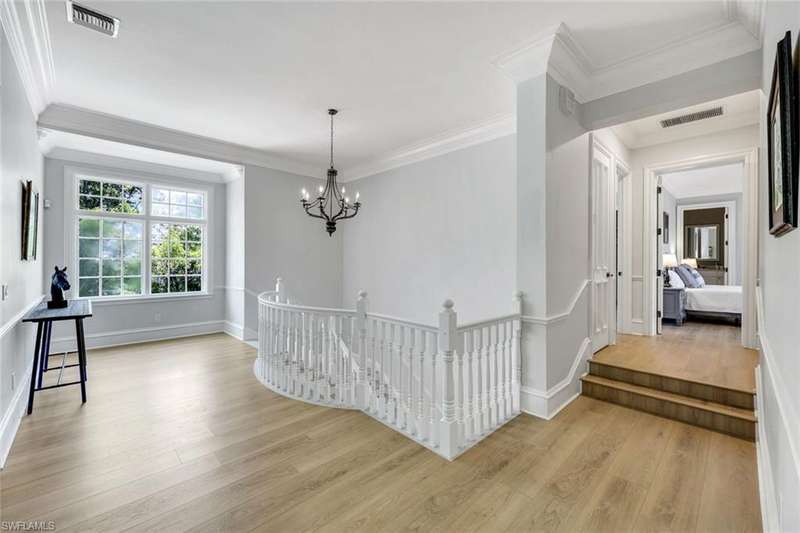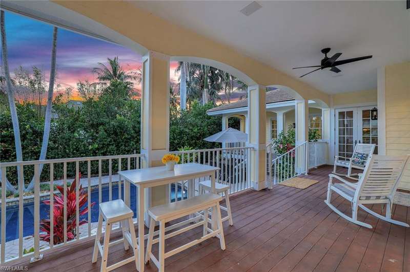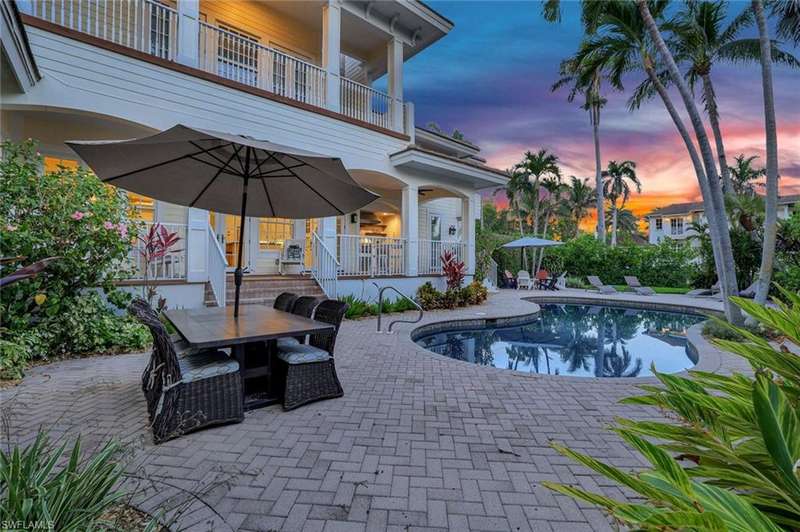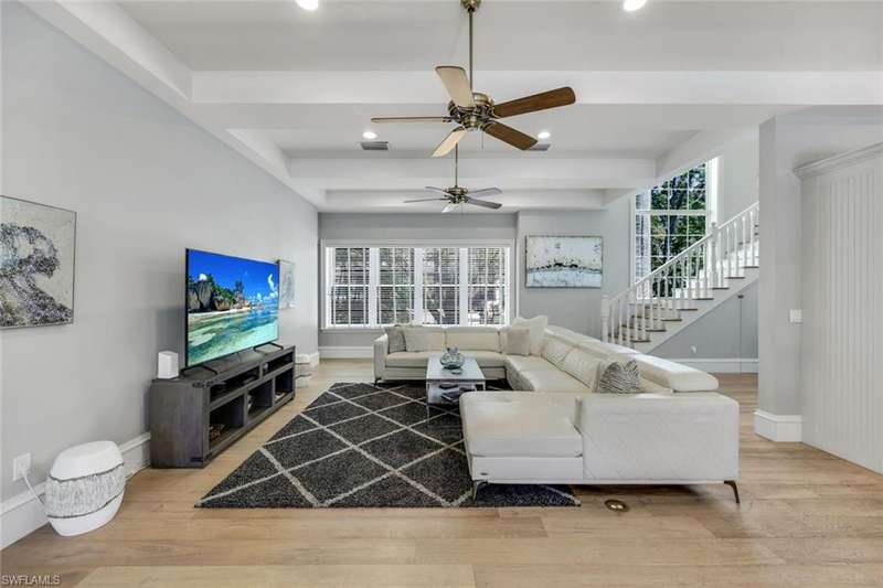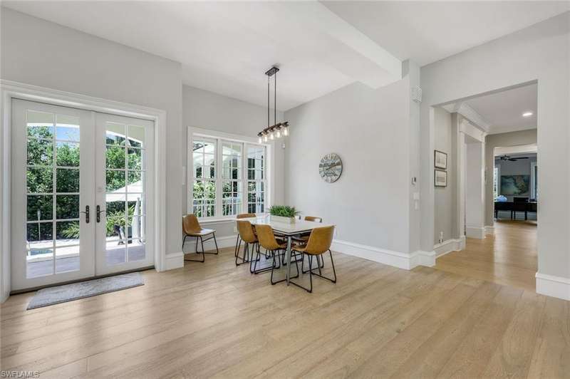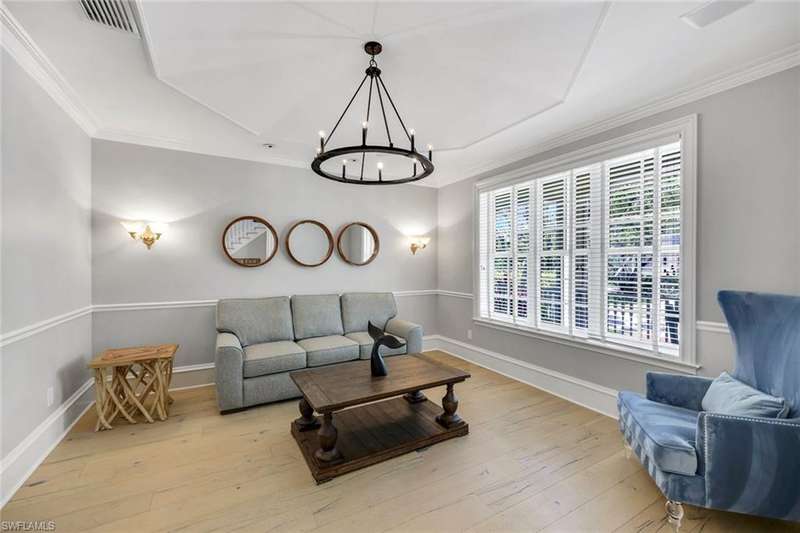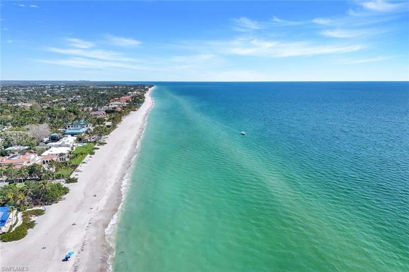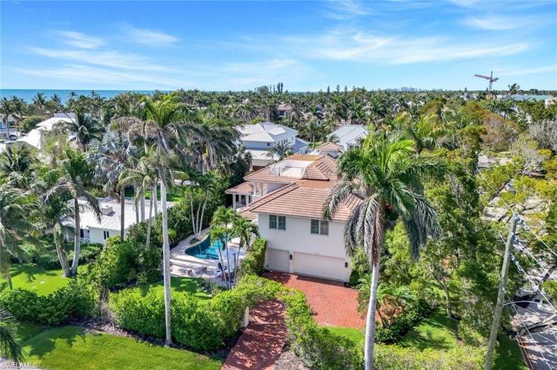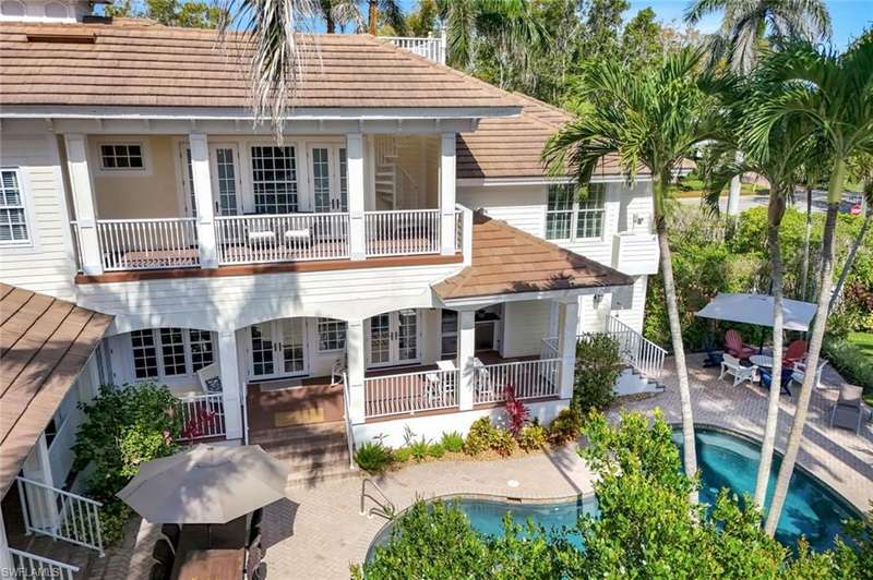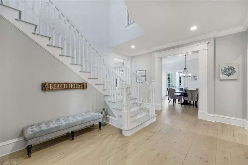 Exceptional value per square foot location, location, location! Recently reduced, now priced among the very lowest per square foot in Aqualane Shores. Perfectly situated just one block from Naples' pristine beaches, this stunning two-story Old Florida residence combines charm, luxury, and convenience. Boasting 5 bedrooms plus a den, 5 full & 2 half baths, and sprawling across 5,368 square feet, this home provides generous living space ideal for families or multi-generational use, featuring owner s suites conveniently located on both levels. Meticulously maintained and resilient, this property has weathered all recent storms flawlessly without damage highlighting its prime location and superior build quality. Inside, discover a thoughtfully designed open floor plan with beautiful wood flooring, a chef s kitchen featuring a gas cooktop, expansive living areas, and intricate ceiling details throughout. The striking staircase leads upstairs, unveiling additional bedrooms, a versatile