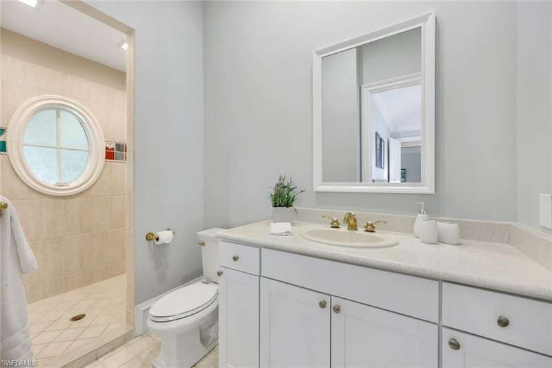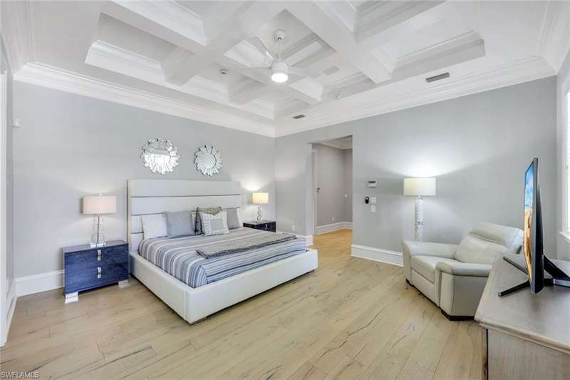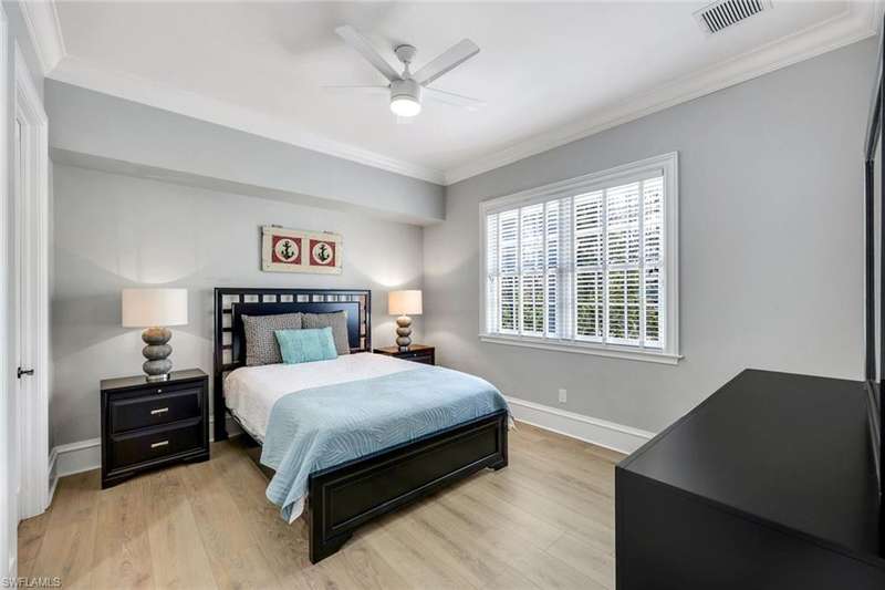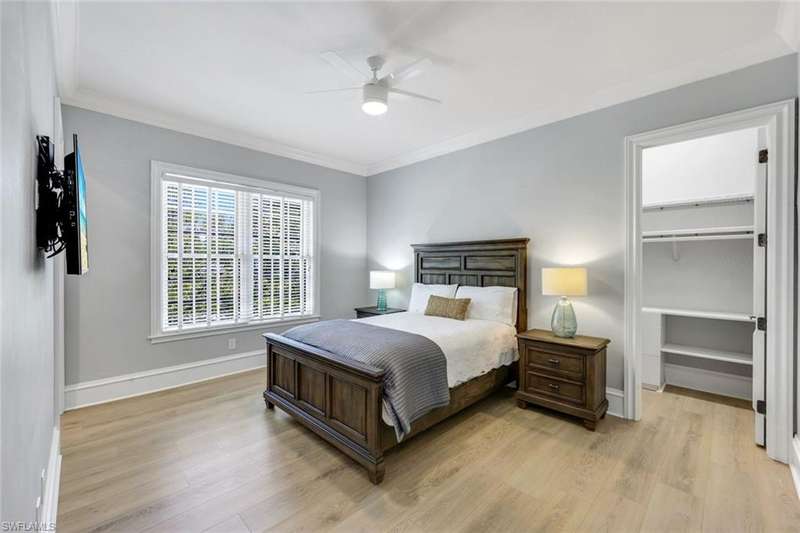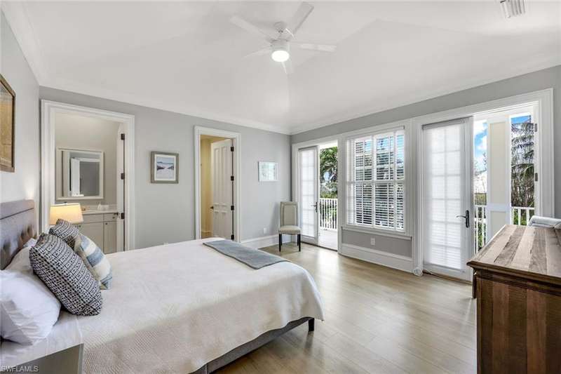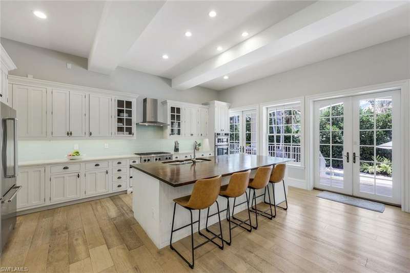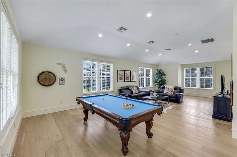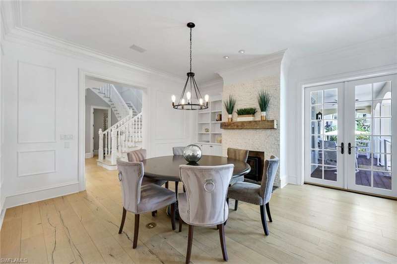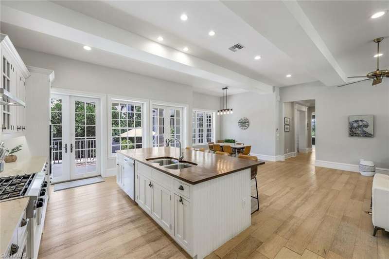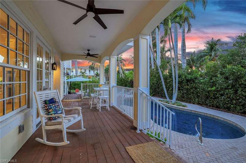 Exceptional value per square foot location, location, location! Recently reduced, now priced among the very lowest per square foot in Aqualane Shores. Perfectly situated just one block from Naples' pristine beaches, this stunning two-story Old Florida residence combines charm, luxury, and convenience. Boasting 5 bedrooms plus a den, 5 full & 2 half baths, and sprawling across 5,368 square feet, this home provides generous living space ideal for families or multi-generational use, featuring owner s suites conveniently located on both levels. Meticulously maintained and resilient, this property has weathered all recent storms flawlessly without damage highlighting its prime location and superior build quality. Inside, discover a thoughtfully designed open floor plan with beautiful wood flooring, a chef s kitchen featuring a gas cooktop, expansive living areas, and intricate ceiling details throughout. The striking staircase leads upstairs, unveiling additional bedrooms, a versatile