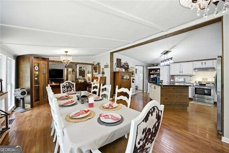 Motivated Seller! Discover the perfect blend of country charm and modern convenience with this beautifully remodeled Manufactured home set on a permanent foundation. Nestled on 26 acres with 200+ Feet of Hudson River Frontage, this property offers privacy, space, and endless possibilities-all just minutes from downtown Commerce and convenient to I-85. Currently operating as a working mini-farm, the property is fully fenced and features multiple barns and outbuildings, a detached garage, and a 4-stall pole barn ideal for large campers, boats, or farm equipment. A natural pond adds to the serene landscape, while a custom outdoor fire pit or the Hand built pier on the pond makes the perfect gathering spot for family and friends. Animal lovers will appreciate the opportunity to continue the legacy of this farm: while livestock is not included, the seller is willing to leave behind two cherished donkeys (a bonded mother and son pair) for the right buyer. Whether you're seeking a private homestead, hobby farm, or a retreat with abundant space for recreation and storage, this property delivers. With gated drive, gorgeous landscape, and river frontage, it's truly a rare find.