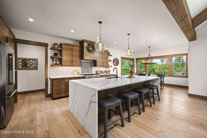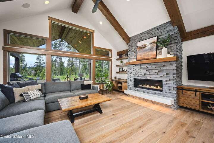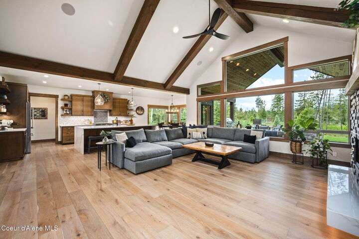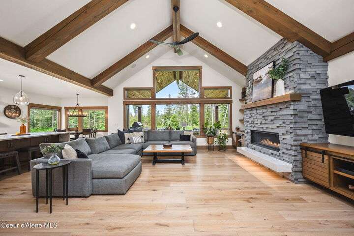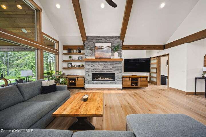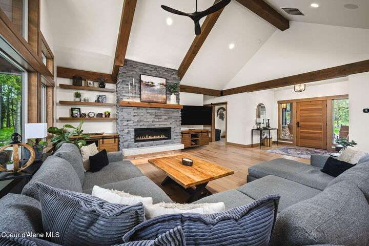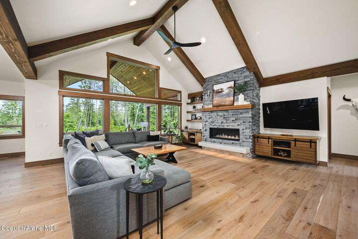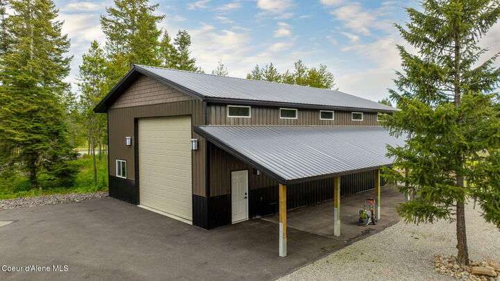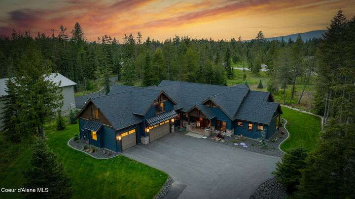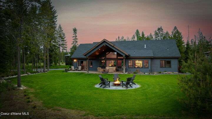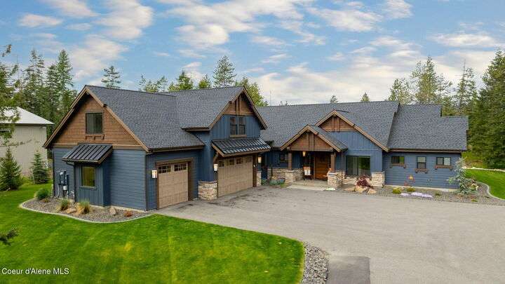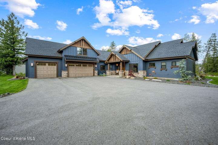 LUXURY 4 BED, 3.5 BATH, 3,290 SQ FT HOME ON 4.57 ACRES WITH STUNNING RATHDRUM MOUNTAIN VIEWS. Spacious & open main-level living with upstairs bonus room room(that doubles as 4th bedroom) + wet bar & full bath. Premium finishes include cedar fascia, timber/shingle accents, masonry exterior, and solid wood entry. Perfect for entertaining, with a chef's kitchen featuring quartz waterfall island, tile backsplash, walk-in pantry, and WiFi-enabled Thermador appliances. Enjoy the linear gas fireplace, hardwood floors, office, powder room, and whole-house audio. Spa-like primary suite with tile shower and soaking tub. Outdoors: covered patio, landscaped yard with bluetooth enabled irrigation system, natural gas fire pit with flagstone surround, paved drive, landscape lighting, and dusk-to-dawn LED exterior lights. Plus: a 30x50 heated shop with 12x30 loft, 12x15 enclosed man cave, and 12x50 lean-to. Fiber Optic internet, 20 minutes to Kootenai Health. THIS HOME CHECKS ALL THE BOXES!