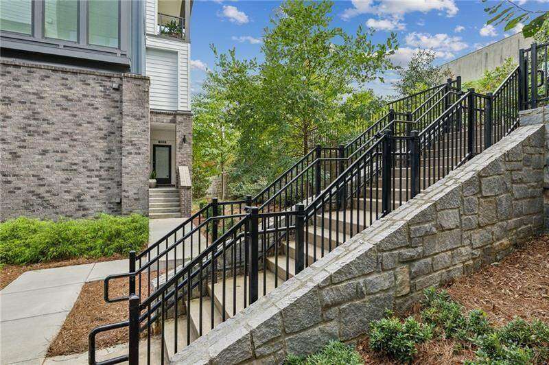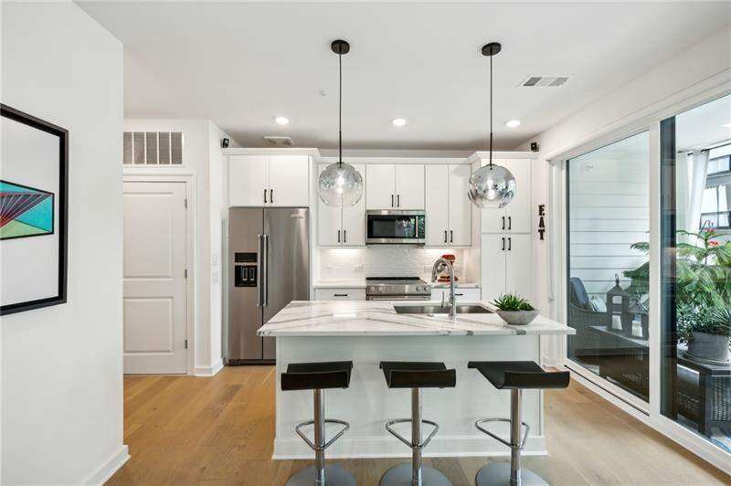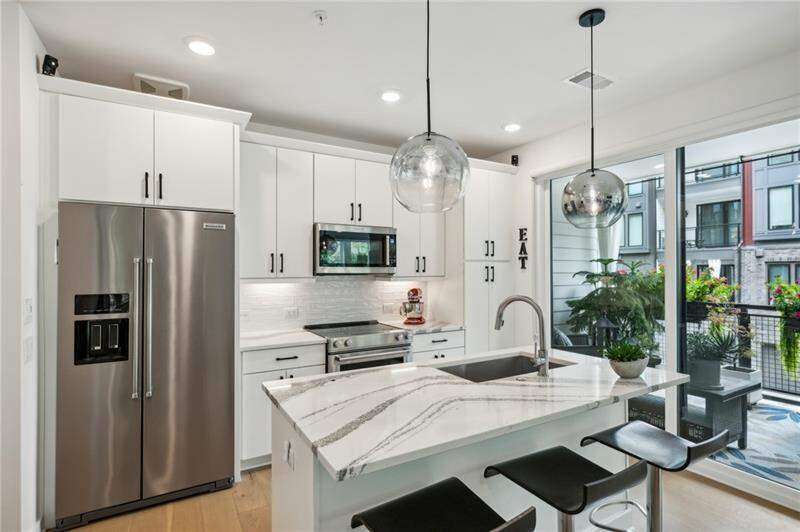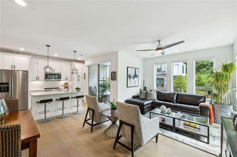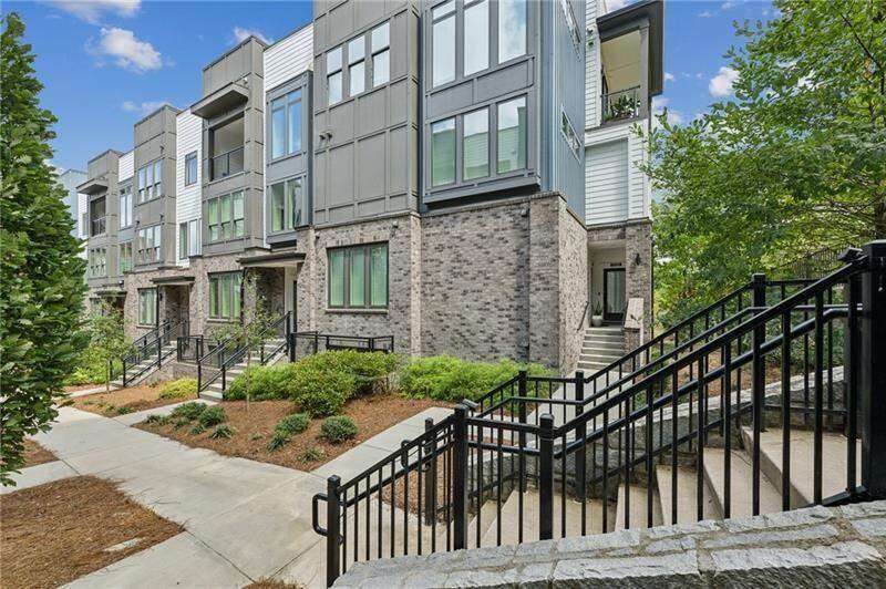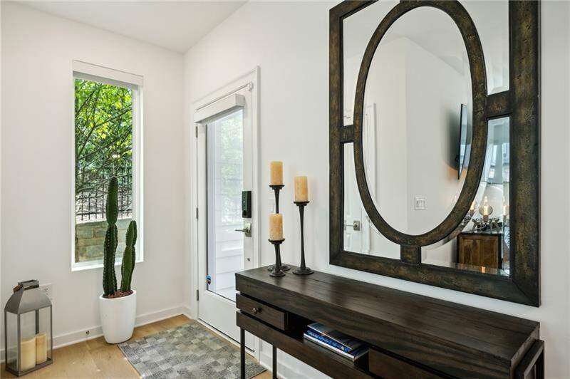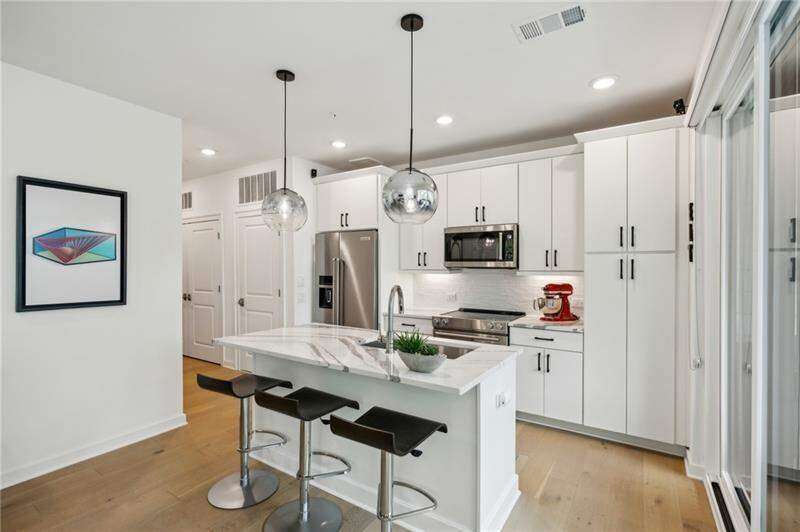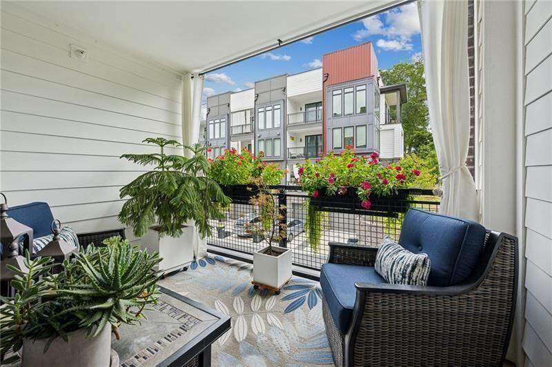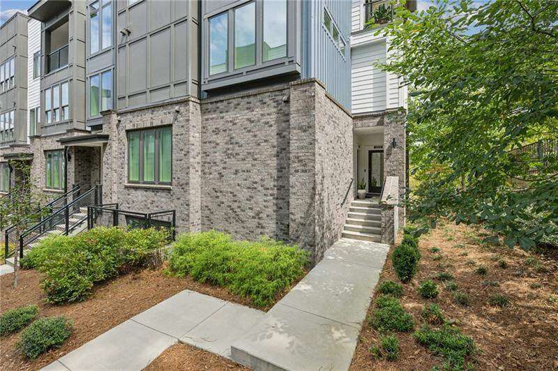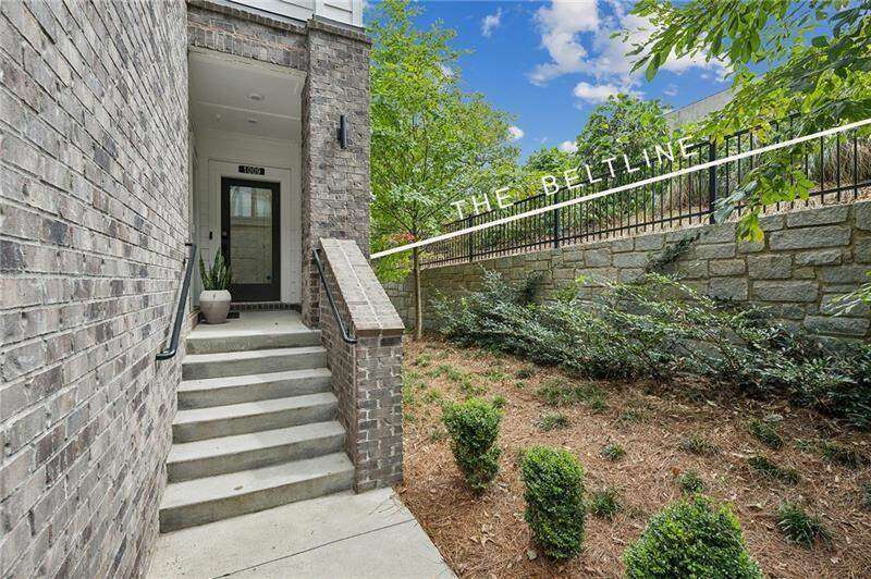 Pratt Stacks - Amazing opportunity to live in historic Grant Park next to the popular Beacon for shopping, dining and entertainment. Better yet, you'll be located in the back of the community directly on the Beltline you can see from your living area. This corner unit is full of natural light and windows galore! Light natural 7" plank hardwoods throughout, open concept floor plan with crisp, white kitchen with quartz counters, subway backsplash, high-end KitchenAid appliances, pantry, center island, sliding doors to charming covered porch, laundry closet fits side by side W/D with cabinetry storage, coat closet, two walls of windows in the living room, over-sized primary suite with large custom designed closet with hamper and shoe shelves, primary bath w/ huge walk-in shower, water closet, linen niche and double vanities with quartz and custom mirrors. Spacious guest bedroom with walk-in closet and triple windows. White guest bath with shower and penny tile. Extra storage closet under the stairs. Single car garage w/ large storage room, remote controlled rolling shades throughout, WIFI dimmers, NEST thermostat, one of the few units with a FULL DRIVEWAY that will fit another car. Impeccably taken care of and improved - shows like a model home!