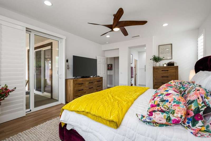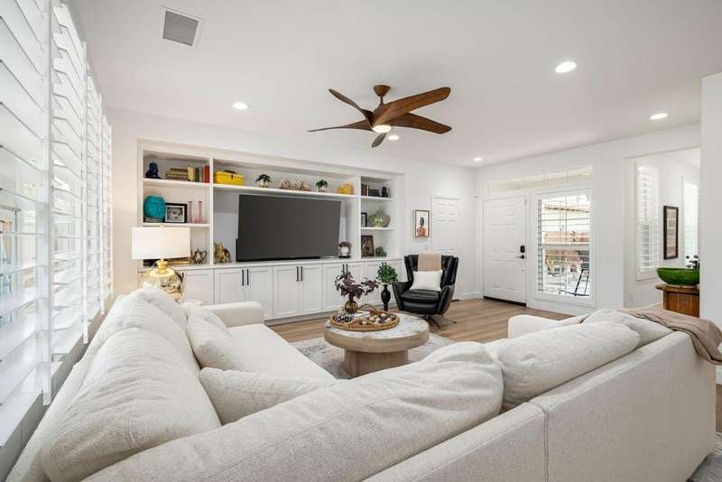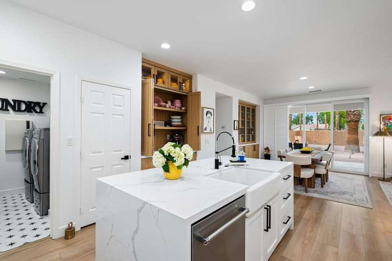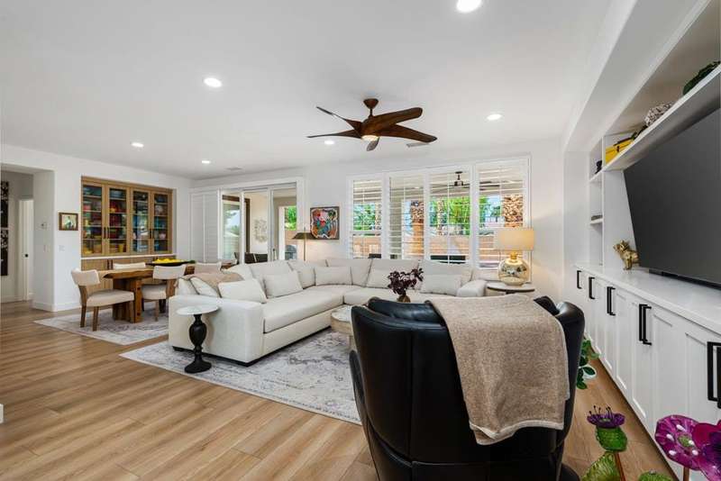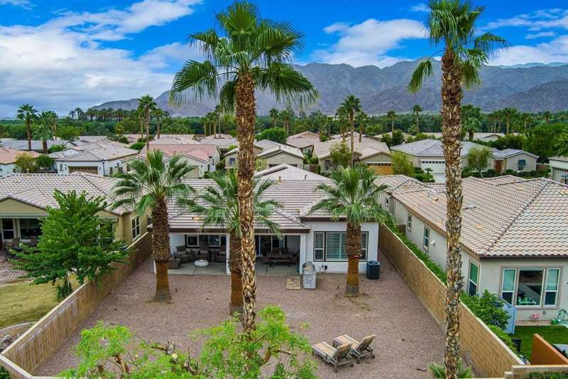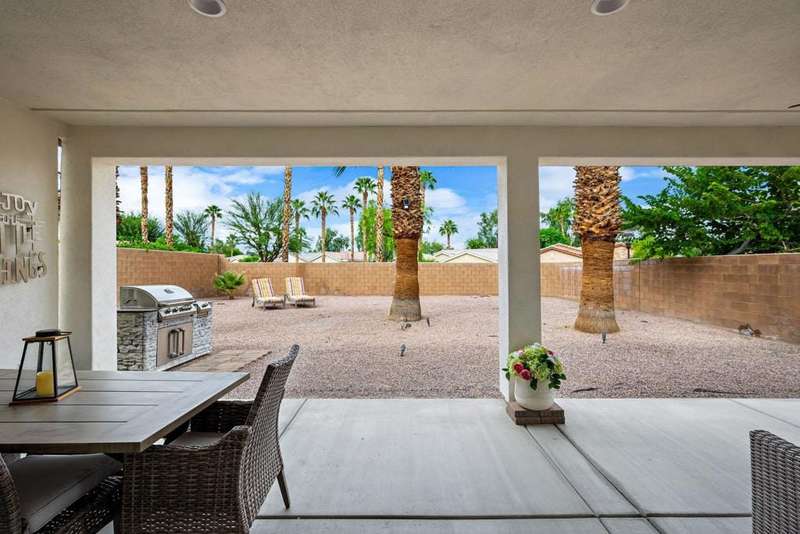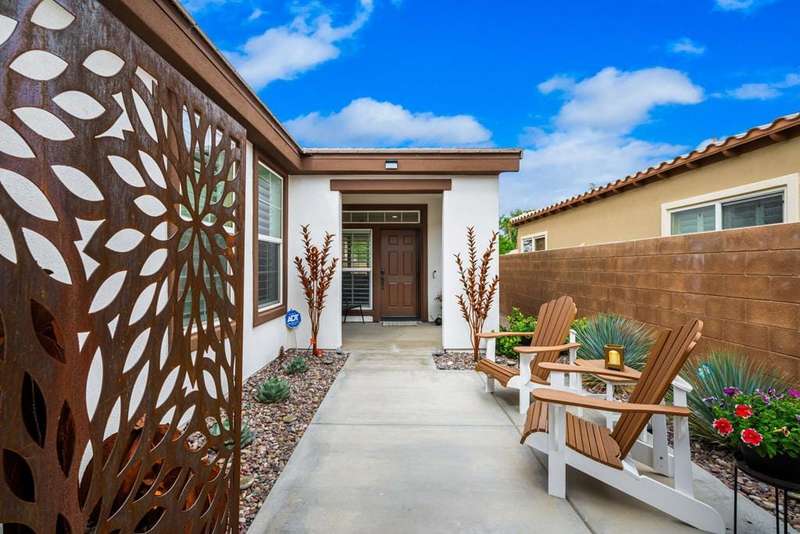 Absolutely stunning and meticulously upgraded, this sought-after Oasis plan is perfectly positioned on an oversized 8,276 sq. ft. homesite within the prestigious Trilogy La Quinta, a premier 55+ resort community. Featuring 3 bedrooms and 3 baths, this exceptional residence impresses with elegant quartz countertops throughout and a seamless blend of luxury and comfort. A charming Tuscan facade and wrought-iron privacy gate welcome you into a tranquil front courtyard, setting the tone for the refined interiors. Upgrades include all new LVP flooring, new landscaping in front and courtyard, fresh interior paint, paver path on side of home, all new window screens, added 21 can lights throughout and all new ceiling fans, including exterior. The great room showcases panoramic rear yard views, plantation shutters, custom built-in entertainment center, and stylish plank flooring, creating an inviting space for relaxation and entertaining. The gourmet kitchen is a showstopper, boasting stainless-steel appliances, white shaker cabinetry, waterfall-edge quartz island, designer backsplash, and custom coffee/beverage station with folding doors, farm sink, and illuminated glass uppers. The primary suite offers a peaceful retreat with bay window, patio access, and a spa-inspired bath featuring floor-to-ceiling tiled shower, dual vanities, and a generous walk-in closet. Guests will love the attached casita, complete with beverage center, mini-split A/C, built-in workstation, and private bath. Additional highlights include a four-foot extended garage with epoxy flooring, ample storage, and mini-split A/C. The expansive rear yard features an extended covered patio, concrete decking, and endless potential to create your own private pool or outdoor sanctuary--all while enjoying access to Trilogy's renowned Santa Rosa Clubhouse amenities. This home is a true desert gem--schedule your private tour today!