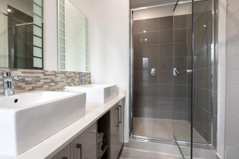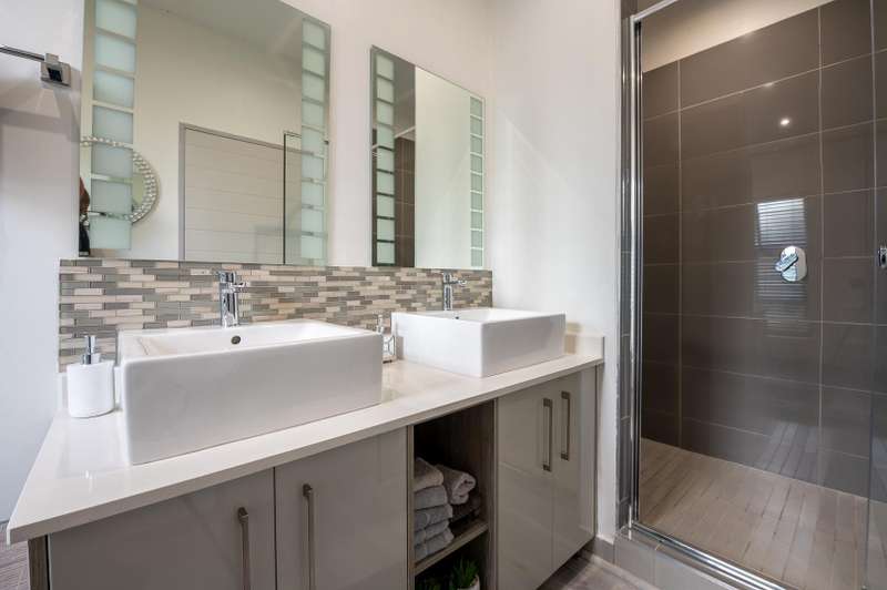 The main bedroom hosts an en-suite bathroom with dual vanities and a large shower, while the second bathroom is equipped with a bath/shower combo with retractable door, catering to ones preference.