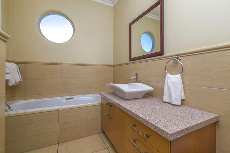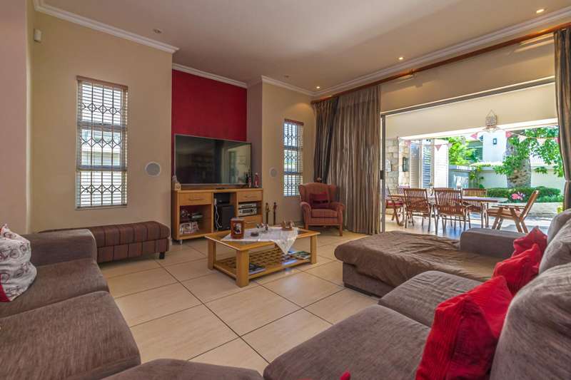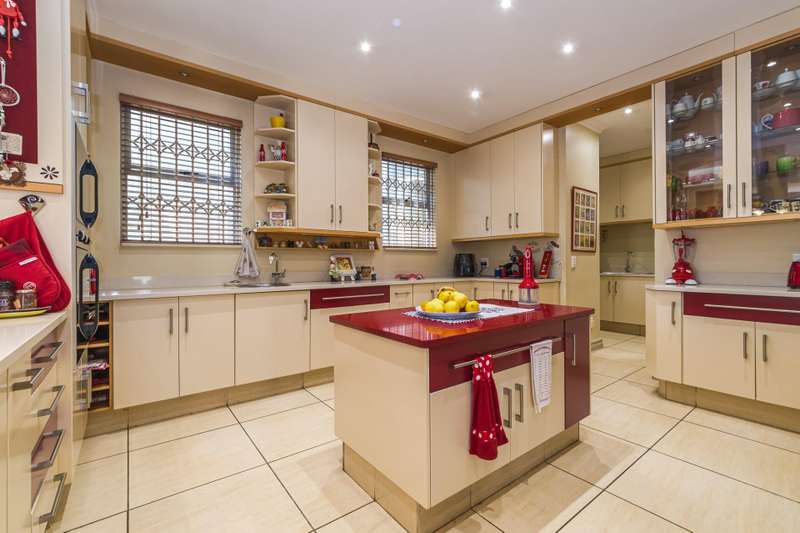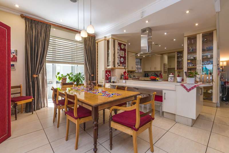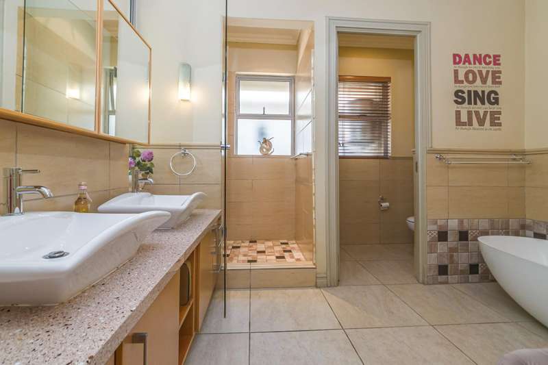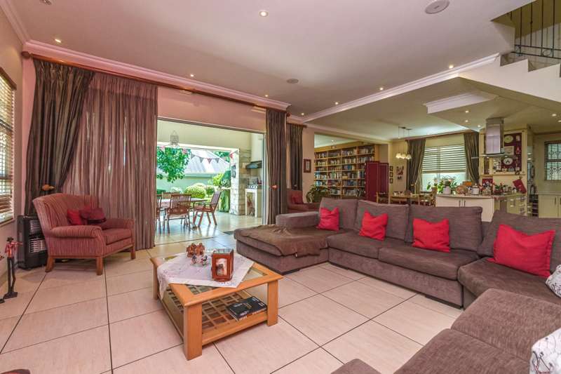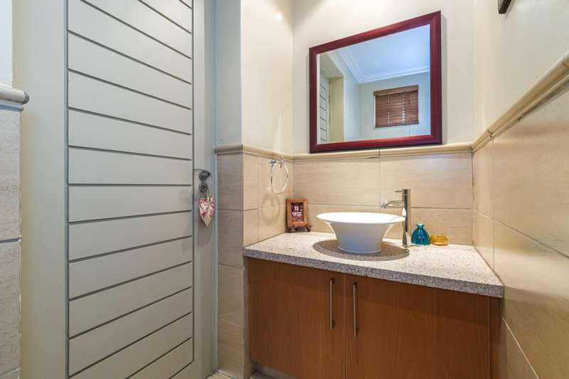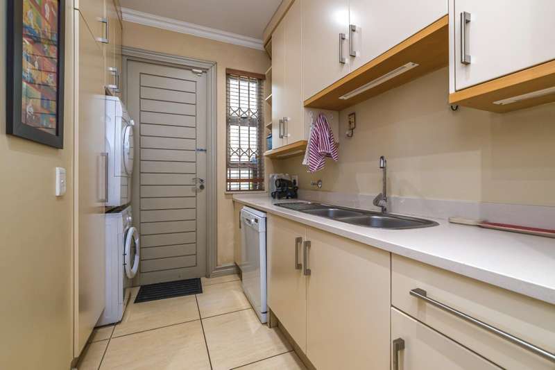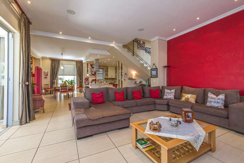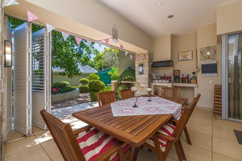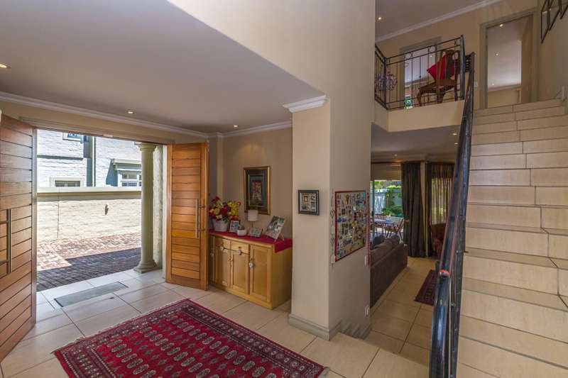 The downstairs area comprises an entrance hall, guest cloakroom, 2 living rooms, a dining room, an extremely well designed & spacious kitchen, enclosed patio with American shutters and a built in braai. The North facing entertainment space opens out onto a well manicured garden. The continuity of the tiled flooring on the lower level ensures a good flow.