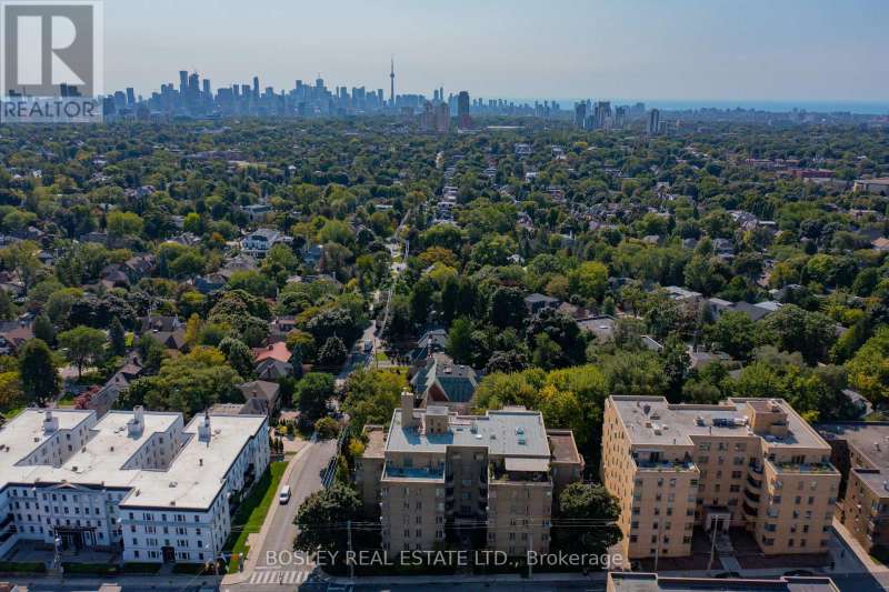 WELCOME TO THE ROYCROFT! In the last years of the Art Deco period, prominent Architect John Edward Hoare designed The Roycroft (1939). A New York style co-ownership Art Deco building at Eglinton & Old Forest Hill Rd. The minute you step into the lobby you know this isn't just any building. The elevator requires you to "open the door when the light comes on". This Art Deco treasured Penthouse is a corner suite (only 4 per flr) nearly 1200 SF interior living space with an expansive open concept living & dining area, oversized windows & walk-out to a splendid 653 SF terrace overlooking a canopy of Forest Hill homes, parks and our City's skyline, it's breathtaking! The separate kitchen is tucked to one side with lots of natural light thx to the skylight & a swinging door to the dining area. A true testament to Art Deco of the 20s & 30s! The oversized primary bdrm boasts a large window w/beautiful north view and a walk/in closet. The 2nd bdrm is also a good size with wall-to-wall closets and a window. This room was used as dual purpose home office/bdrm and includes built-in bookshelves. The Roycroft is a short walk to the shops, services & restos of "theeglintonway.com". The soon to be Chaplin subway station is a 5 min walk & there's a bus right at the front door. Financing is more readily available for co-ownerships than co-ops see attached reference material. The monthly maintenance fees cover all utilities including cable/internet and property taxes. This suite comes with parking & locker. These large PH suites rarely come on the market and the buyer for this incredible part of history may want to renovate it while maintaining the integrity of its art deco charm or go with a custom decor. A similar sized PH was totally renovated and sold in its sister building The Crofton for just under $2.5M in 2022!
