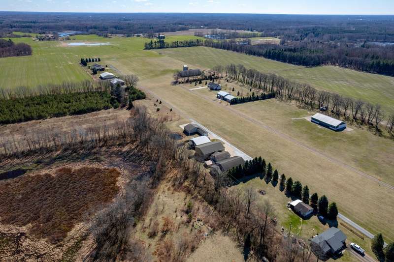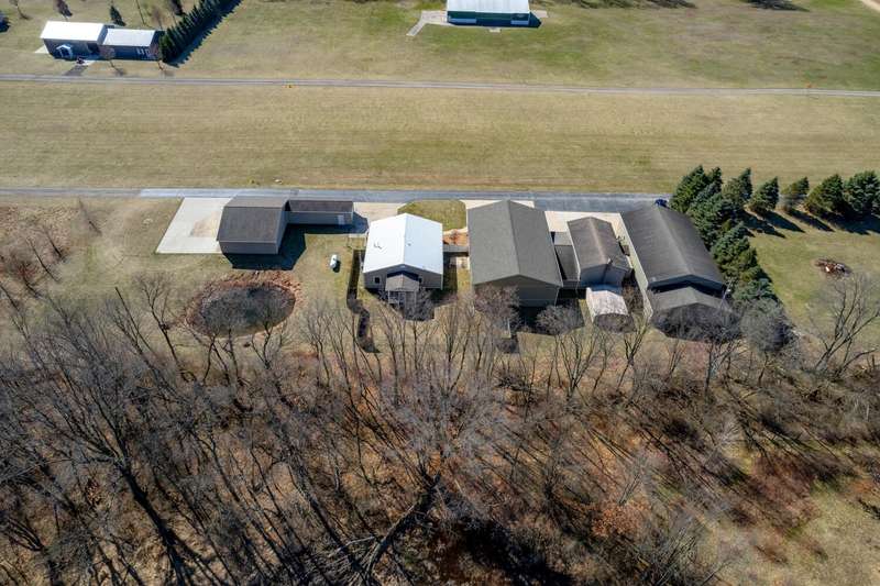 Welcome to Fairplains Airpark, a unique opportunity not only for pilots, but this would also be an ideal setup for auto enthusiasts, large scale hobbyists, collectors, artists or simply a great place to live while keeping all of your big toys safely stored indoors. We start with a sophisticated 2 bedroom, 2 full bath, ranch style home, built in 2005, with 8.59 acres, fenced backyard and a private pond. In front of the home is a 2000 foot grass runway that is shared with a very small group of neighbors. Inside, you'll find a large kitchen with an abundance of cabinets and storage. The kitchen is open to a dining area with fireplace and an enclosed porch. Entertainers will love the bar area that connects the kitchen and living room. The main bedroom has it's own bath, walk in closet and glass door to patio with electric in place for a hot tub. The home has an attached garage and a heated detached garage with attached hanger. On the other side of the home there is a series of 4 buildings. The first building is climate controlled with in floor radiant heat, 14' doors, 16' ceilings and a large loft area. A section of this building was used for indoor gardening. Walk through a short hall to the 2nd building that contains a mechanical shop with an oil change pit, crane beams, paint booth w/ventilation, compressed air system, wood stove, and another loft with a full bathroom and additional laundry. A beautiful office with heat and air connects the workshop to the massive final building. This last building is 41'x60' with a hydraulic scissor door and propane heat. All of these buildings were built to the highest of standards and are way above and beyond average. Just 27 miles from Grand Rapids.
