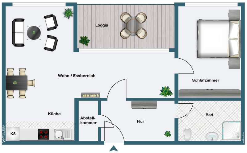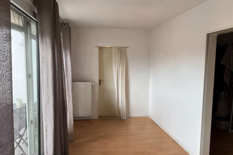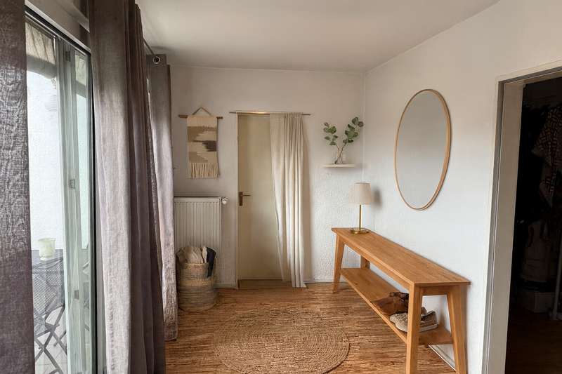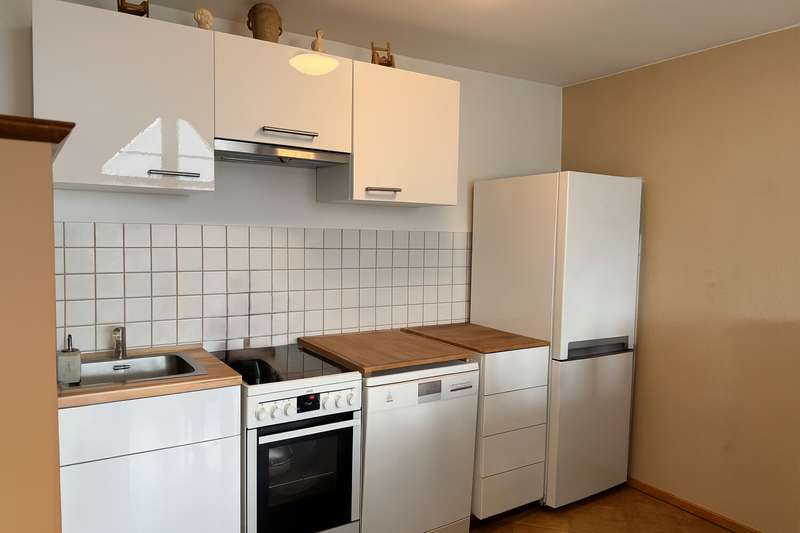 This well-kept top-floor apartment impresses with a successful combination of well thought-out room layout, good furnishings and a cozy living atmosphere. A special highlight is the sunny balcony, which invites you to spend relaxing hours outdoors. The entrance area leads via a small hallway to an interior bathroom, a practical checkroom and a separate storage room - ideal for creating additional storage space. The open-plan living/dining area with integrated kitchen forms the heart of the apartment. Generous panoramic windows here, as in the bedroom, ensure light-flooded rooms and a friendly ambience. The passageway to the bedroom also provides an ideal space for a home office. The bedroom itself offers enough space for a comfortable dressing room - perfect for anyone who values comfort and tidiness. The attractive offer is rounded off by a separate, dry cellar room, a bicycle room and a parking space in the adjacent duplex parking lot. This top-floor apartment combines modern living, bright rooms and practical details - a home to feel good in, which is currently rented out.