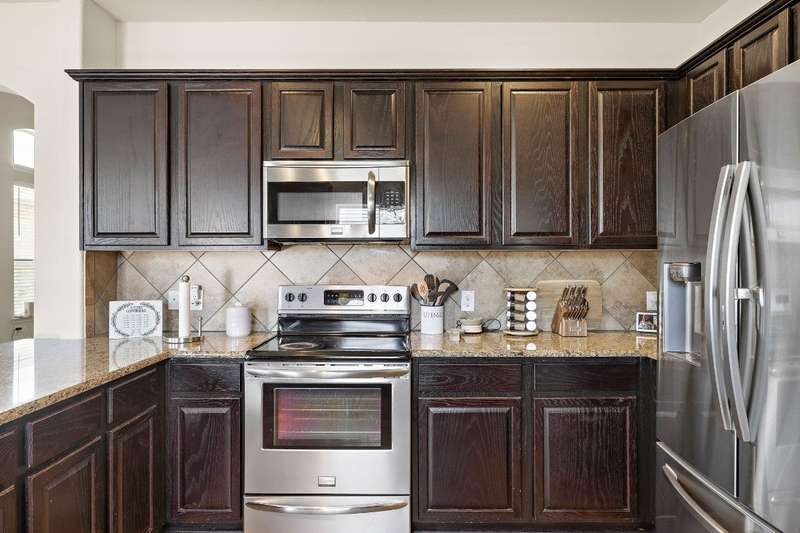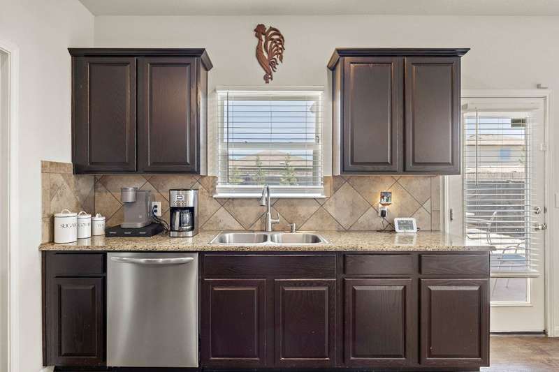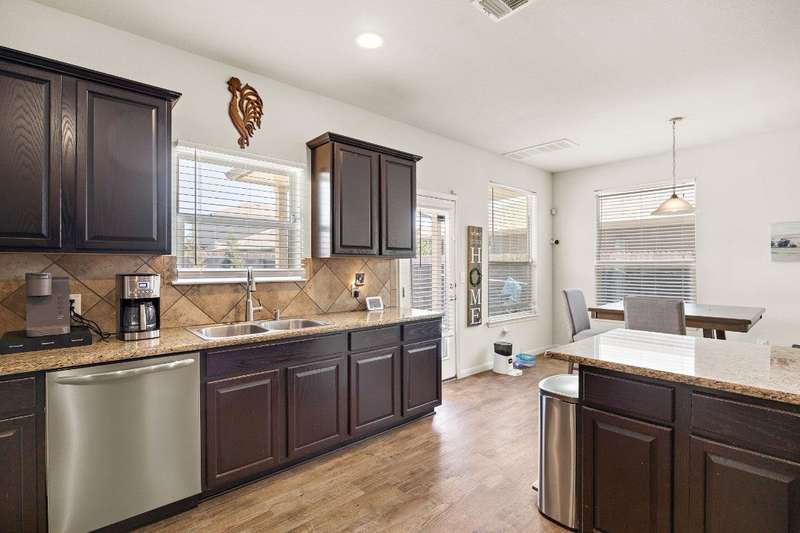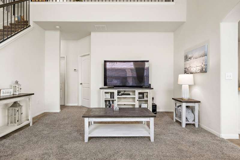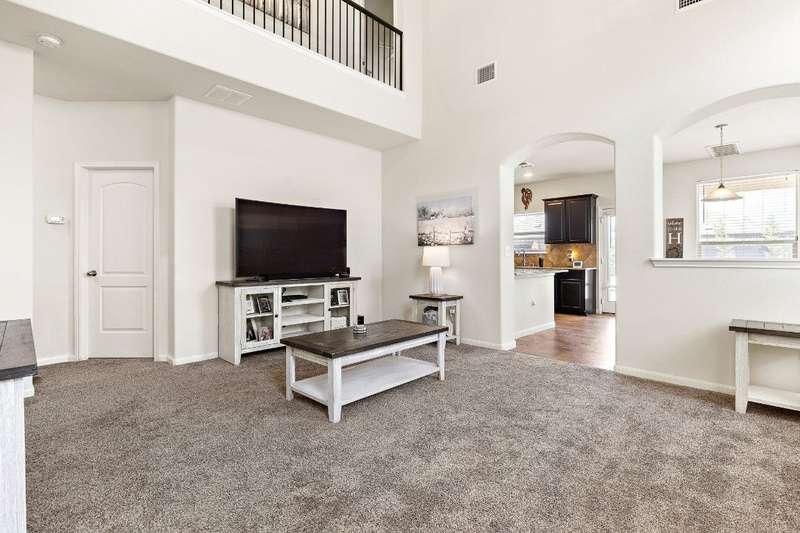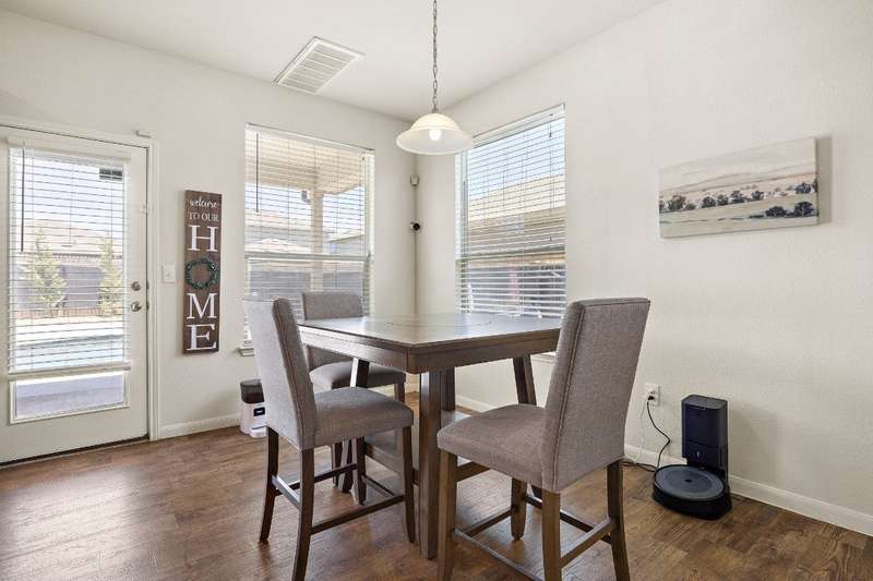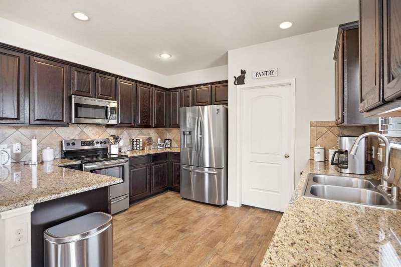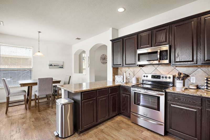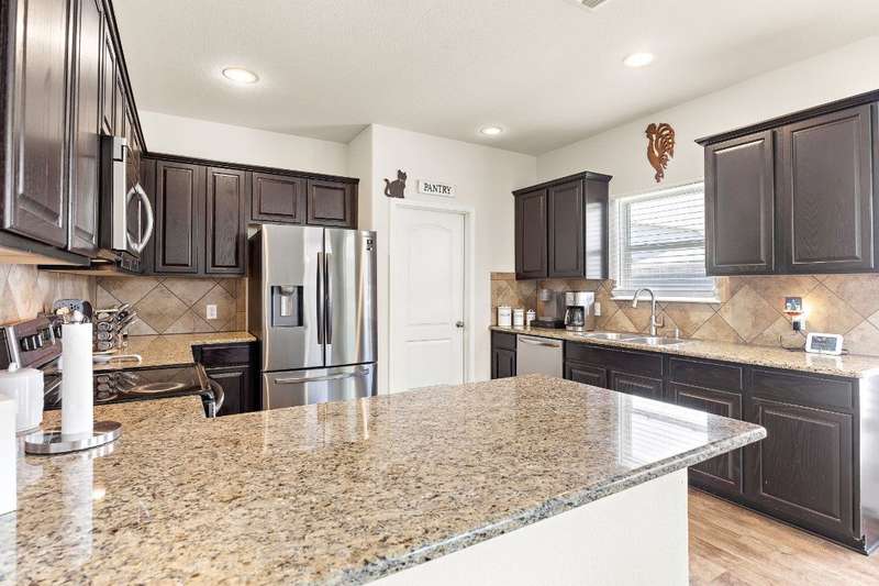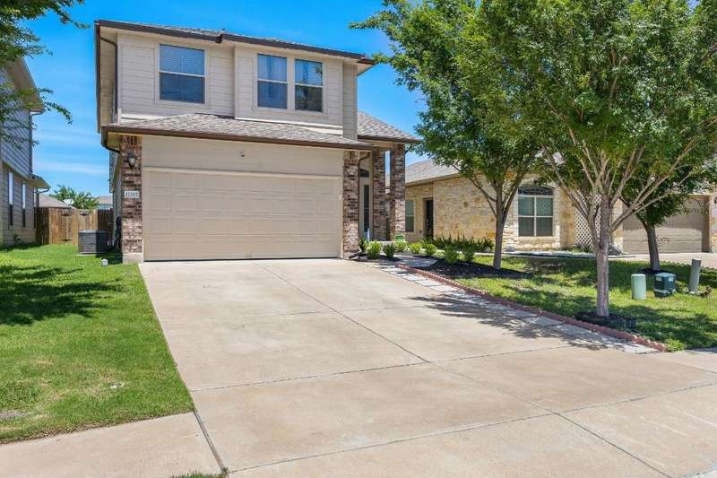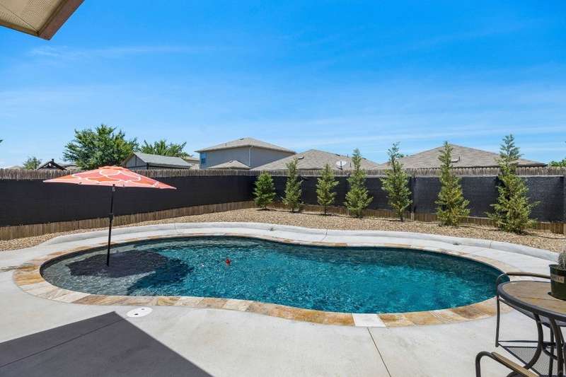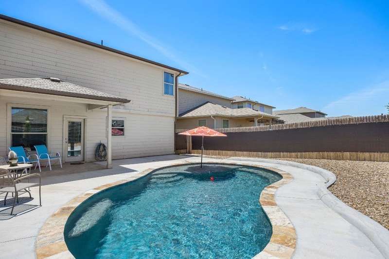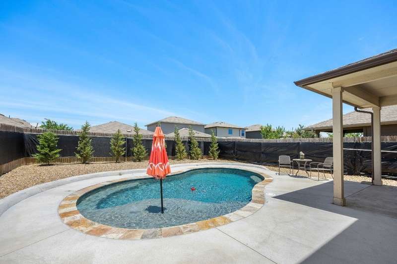 Looking for a home in Manor with a stunning, brand-new in-ground pool? This is the one! Nestled in the highly sought-after Stonewater Subdivision, this beautiful 4-bedroom home has it all—including a new roof, fresh carpet, and an exceptional custom pool. The 27x16 ft aqua-blue Pebble Tec pool features a sun shelf, an 8-ft beach entry with two soothing bubblers, and LED multi-color lighting—all controlled from your phone for ultimate convenience. The open floor plan creates a seamless flow from the living area to the kitchen, offering picturesque views of the pool, making it perfect for entertaining. Downstairs, you'll find a full bathroom and bedroom, currently used as an office. Upstairs boasts high ceilings, two guest rooms, and a spacious primary suite with an en-suite bathroom. The kitchen is a chef's dream with expansive granite countertops, stainless steel appliances, and ample 42” cabinetry. Just behind the kitchen is a large pantry and a separate laundry room, ensuring both style and practicality.