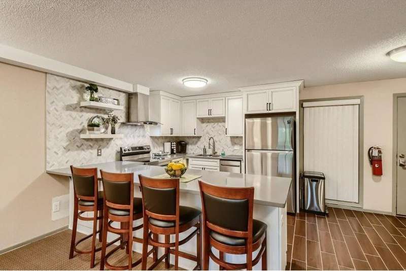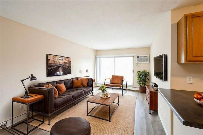 Welcome to Black Forest Condominiums! This very well-run association is situated in a quiet residential neighborhood on the Fridley/New Brighton border and is surrounded by Innsbruck Nature Center with trails leading to it! This unit is located on the top floor so there will be no noise from above you. It comes with a detached garage for parking, a reserved parking spot with an external outlet outside the building and a storage locker just down the hallway from the unit. The unit has a luxury vinyl floor installed in 2022, updated kitchen with newer cabinets, counters and appliances, an updated bathroom with white trim and fresh paint. The laundry and storage locker are very nearby and the building has a long list of amenities including underground heated pool, exercise room, renovated party room with full kitchen available for residents to rent at no cost, library, laundry rooms on each floor available 24/7, billiard & ping pong room, picnic area with grills, car wash and elevators. Dues include everything but electric, cable and internet. Location is super convenient just a couple minutes from 694 & Silver Lake Road --you're going to love living here!