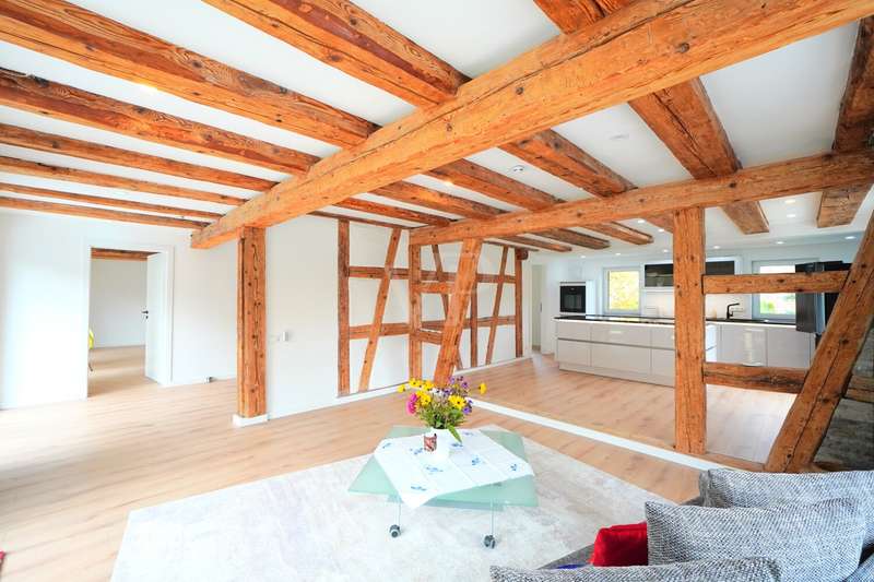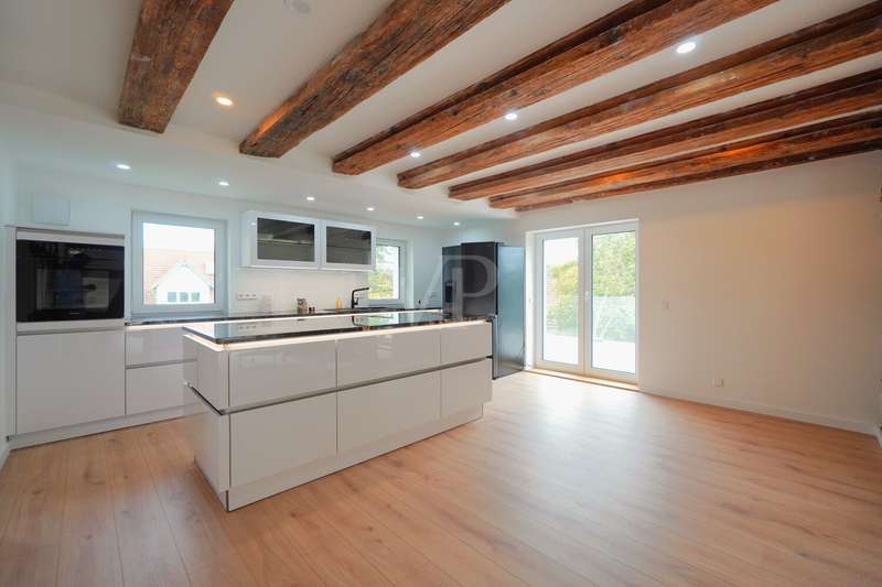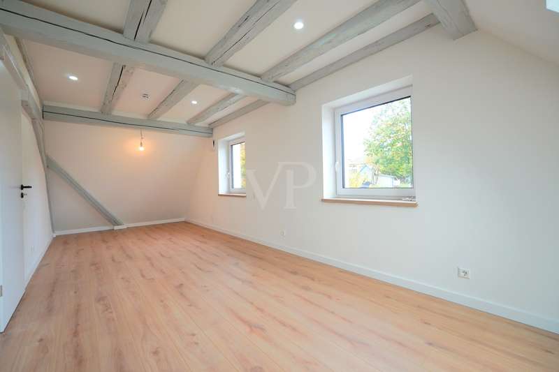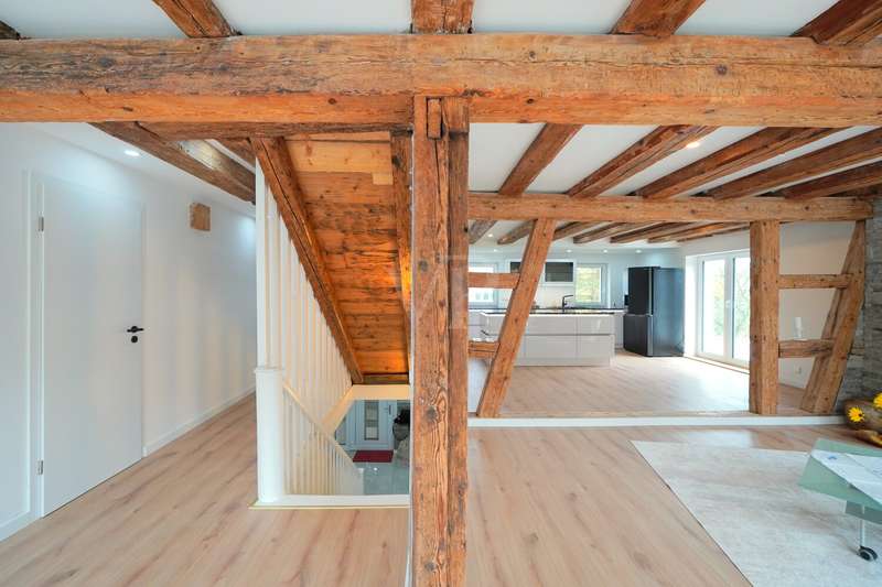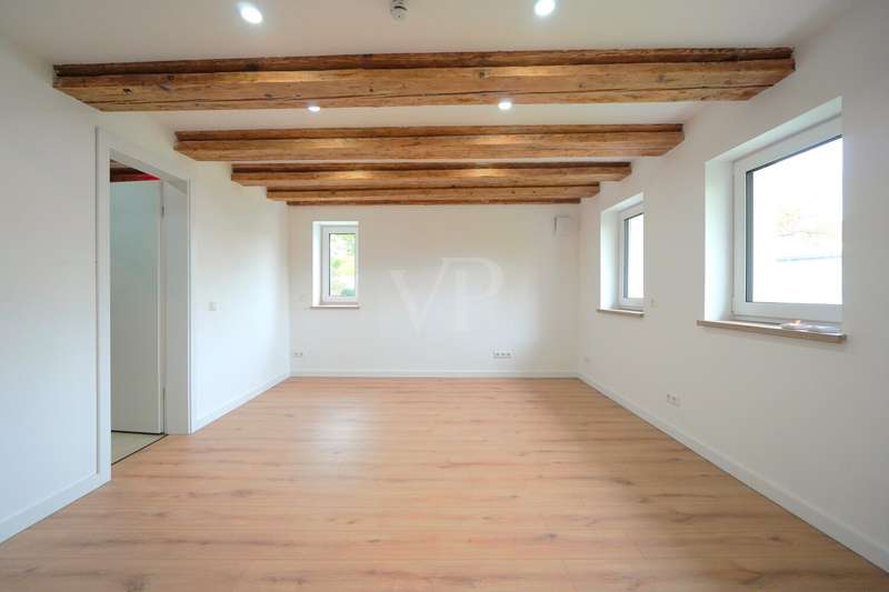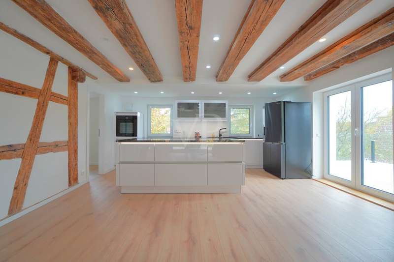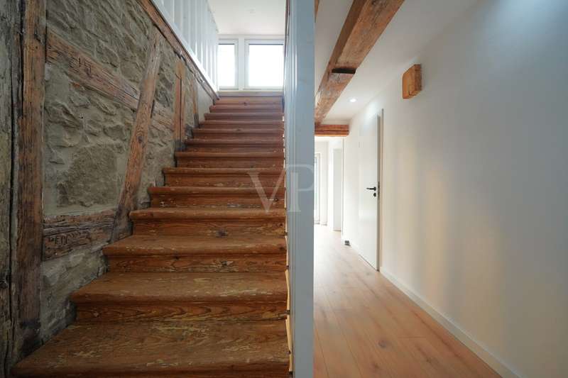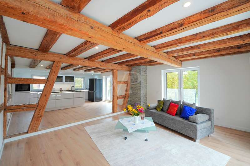 This extraordinary property, originally built in 1803, impressively combines historical charm and state-of-the-art living technology. Following a complete refurbishment in 2023/2024, the building is now a state-of-the-art low-energy house built in 2025 - a truly rare gem that perfectly combines history, style and sustainability. With a total living area of around 276 m² and a usable area of approx. 164 m², the property offers a wide range of possible uses - ideal for families, multi-generational living or living and working under one roof. The spacious plot of around 1,700 m² impresses with its well-tended garden, mature plants and sunny south-facing terrace, which invites you to linger and relax. The architectural uniqueness can be felt as soon as you enter the house: exposed beams, natural stone from the original year of construction and stylish materials create an incomparable atmosphere. Despite its historical origins, the house is technically and energetically equivalent to a new build - a symbiosis that is extremely rare to find. The complete energy refurbishment includes state-of-the-art measures: an air/water heat pump, a ventilation system with heat recovery (93%), triple-glazed plastic windows, full thermal insulation and underfloor heating in all living areas. Thanks to these features, the property meets the highest standards in terms of energy efficiency and comfort. The installed smart home control system enables convenient operation of all building technology functions - modern, secure and future-oriented. On the first floor there are two lovingly designed granny apartments (approx. 19 m² and 25 m²), each with its own entrance, kitchen and full bathroom - ideal for guests, relatives or as high-yield rental units. This level is complemented by a spacious hobby room, guest room or study, the utility room and access to the renovated vaulted cellar - a real highlight with impressive character and top condition. The upper floor is the central living area and impresses with a spacious living, dining and kitchen area that captivates with its openness and abundance of light. The exclusive NOLTE kitchen with an exquisite Brazilian marble worktop leaves nothing to be desired. An adjoining pantry provides additional convenience. On this level there is also an office/guest room, a guest WC and a spacious bedroom with en-suite bathroom - equipped with Italian tiles, double washbasin, large shower and whirlpool bath. On the top floor, three further rooms offer flexible usage options - whether as children's rooms, guest rooms or offices. A further full bathroom with shower, bathtub and WC, as well as a storage room complete this floor. A staircase leads to the fully developed attic, which offers additional space for an office, studio or play area. The ensemble is rounded off by a 5,000-liter cistern for outdoor irrigation, a fibre optic connection and the option of dividing the property into two plots if required - an ideal option for future development or expansion projects. This property is a prime example of the successful combination of tradition and innovation. The historic character of the house has been preserved with the utmost sensitivity, while the modern technical equipment ensures maximum living comfort. A home that sets standards both aesthetically and functionally - unique, energy-efficient and timelessly beautiful.