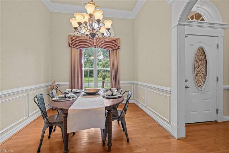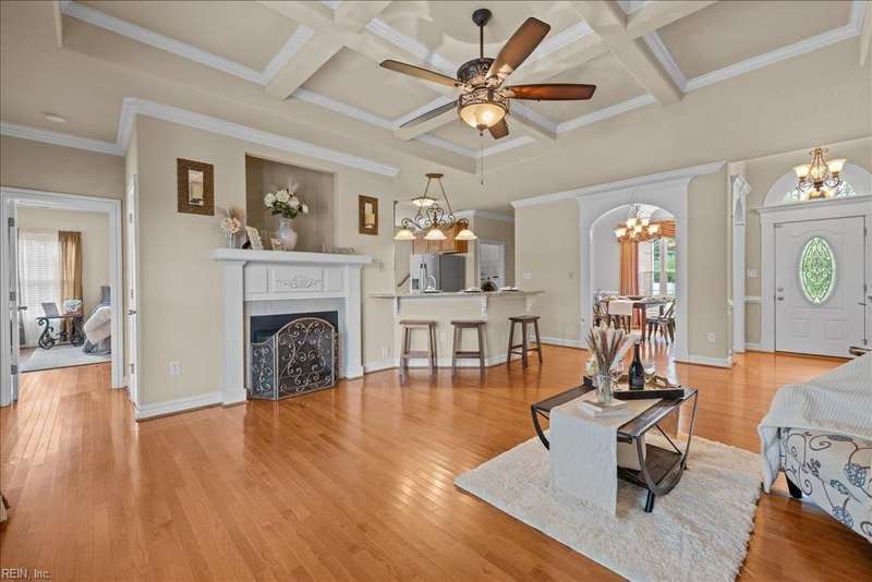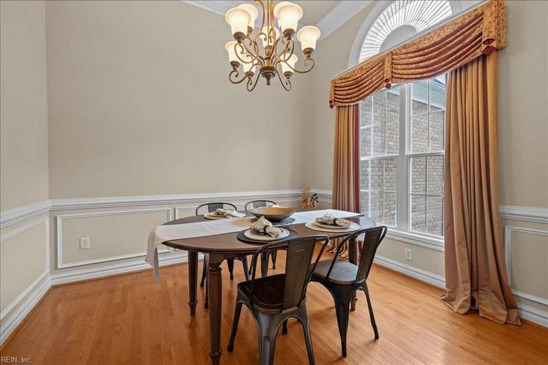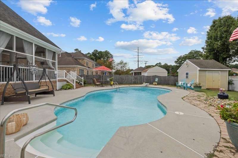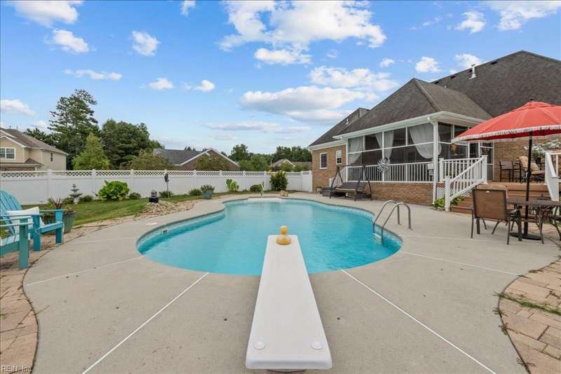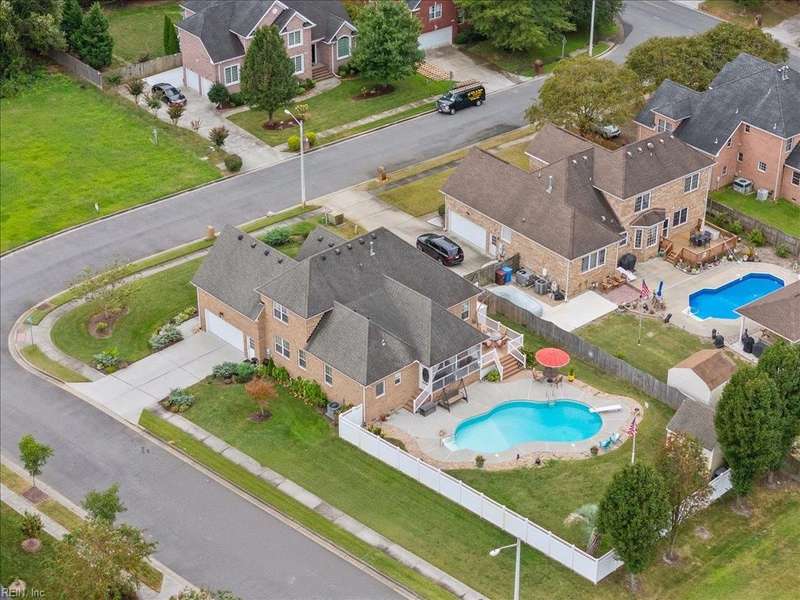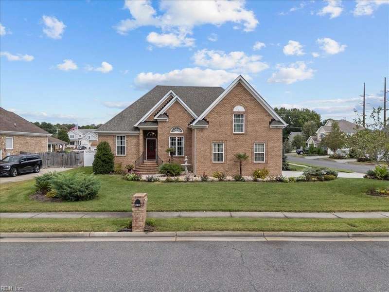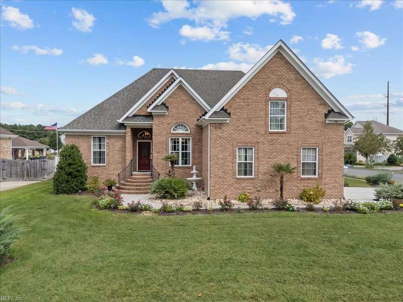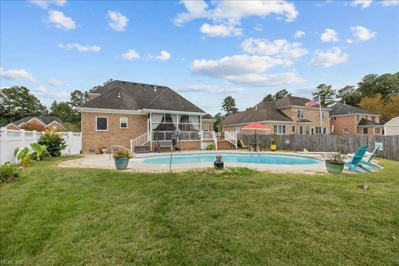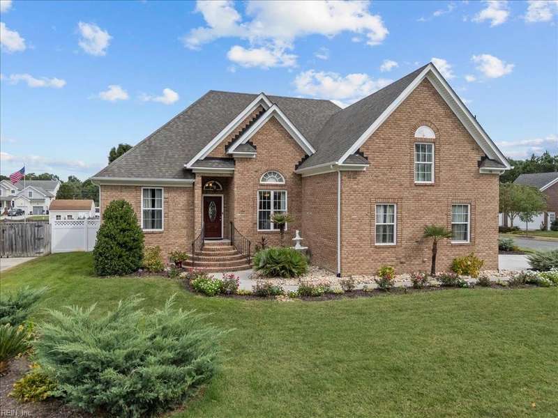 This absolutely stunning all brick, custom built home tucked away on a quiet street w/ NO HOA fees offers 4 spacious Bedrooms & 3 full Bath. You'll immediately notice the impressive architectural details throughout ie: tray ceilings & crown molding. Primary bdrm w/spa-like ensuite & add'l 2 bdrms & 1 full bath located on the 1st floor w/4th bdrm, full bath, huge 22x25 den & walk-in Attic in the ROG. Beautiful hardwood floors throughout foyer, living room, kitchen, formal dining area, primary suite. A modern kitchen w/breakfast bar-top seating & eat-in area, granite counters & ss appliances is open to the large family room w/gas fireplace. Natural light beams through family room & it overlooks large screened in porch that was made for entertaining! Enjoy time outside in your private fenced in backyard relaxing, or swimming in the saltwater pool w/ diving board. Located in the sought-after Great Bridge school district is your own piece of serenity in the heart of Chesapeake!