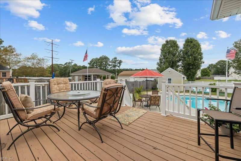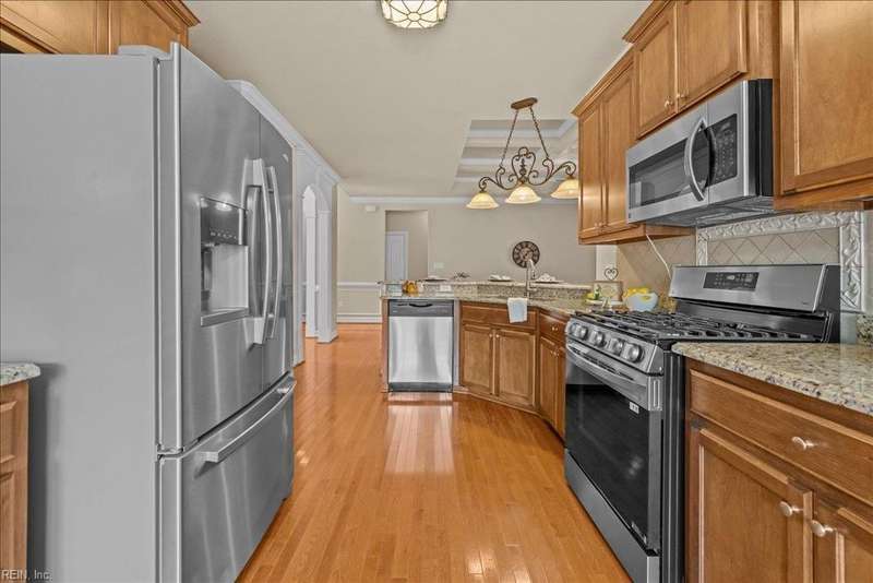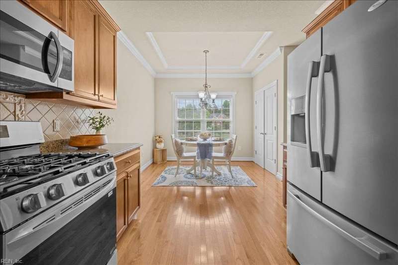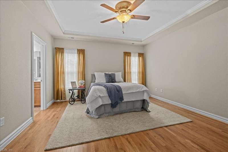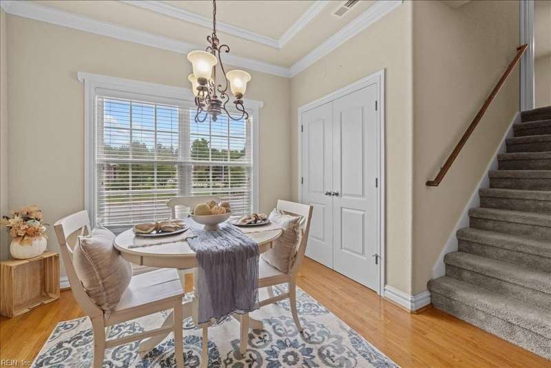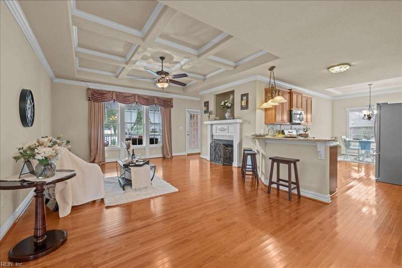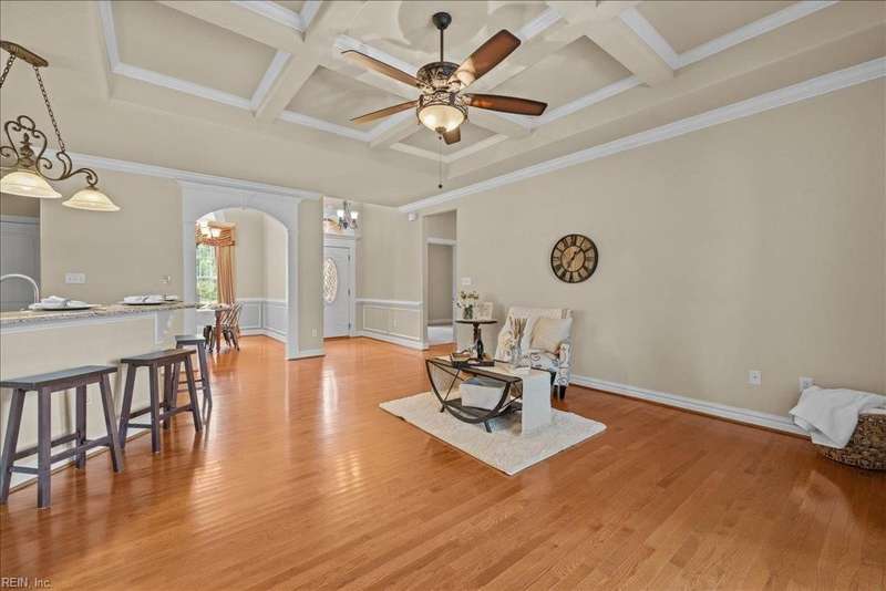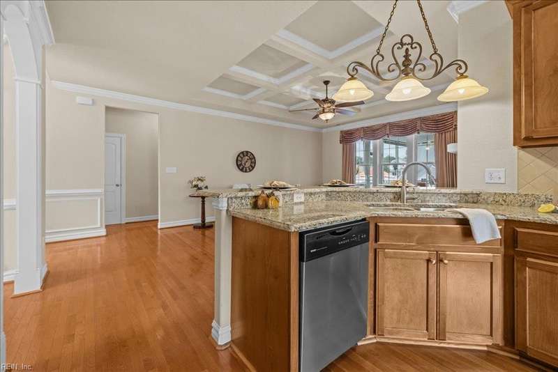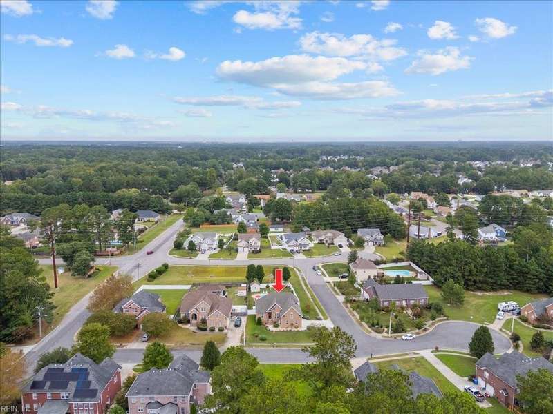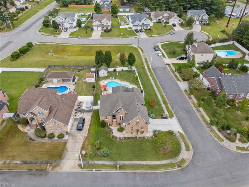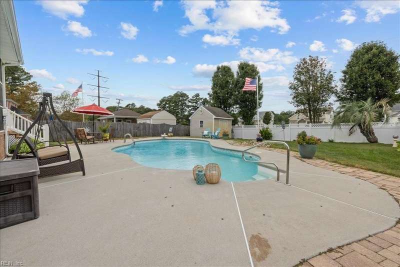 This absolutely stunning all brick, custom built home tucked away on a quiet street w/ NO HOA fees offers 4 spacious Bedrooms & 3 full Bath. You'll immediately notice the impressive architectural details throughout ie: tray ceilings & crown molding. Primary bdrm w/spa-like ensuite & add'l 2 bdrms & 1 full bath located on the 1st floor w/4th bdrm, full bath, huge 22x25 den & walk-in Attic in the ROG. Beautiful hardwood floors throughout foyer, living room, kitchen, formal dining area, primary suite. A modern kitchen w/breakfast bar-top seating & eat-in area, granite counters & ss appliances is open to the large family room w/gas fireplace. Natural light beams through family room & it overlooks large screened in porch that was made for entertaining! Enjoy time outside in your private fenced in backyard relaxing, or swimming in the saltwater pool w/ diving board. Located in the sought-after Great Bridge school district is your own piece of serenity in the heart of Chesapeake!