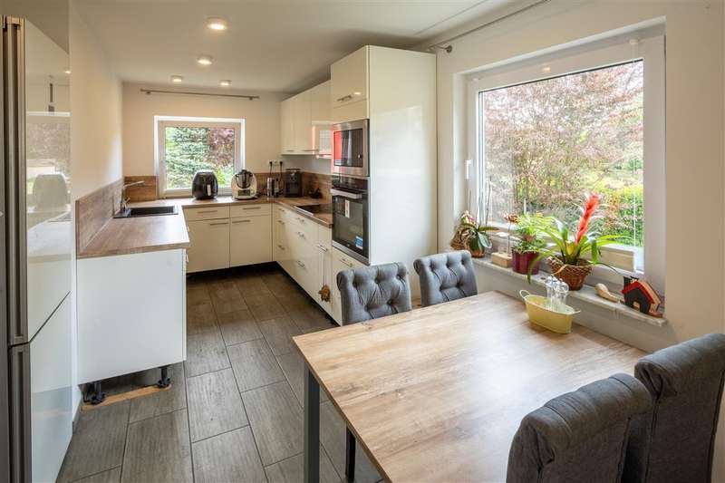 This detached house has a living space of approx. 144 m² and a plot of approx. 492 m². Built in 1974 and recently extensively modernized, the property presents itself in a well-kept and contemporary condition. The modernizations include the heating system. The house was also fitted with new triple-glazed windows and the façade was plastered and insulated. The house extends over the basement, ground floor and attic and offers a total of six rooms, including four bedrooms and three bathrooms. The inviting living and dining area is located on the first floor, where a fireplace creates a pleasant atmosphere on cooler days. Underfloor heating in the living room and kitchen provides additional comfort. There is also a bedroom, a guest room and a bathroom on the first floor. The attic, which was extensively extended in 2020, accommodates three further bedrooms and two additional bathrooms. This floor therefore offers enough space and privacy for a large family. In the basement, there are two hobby rooms with a variety of uses, an additional WC, a storage room and an ironing room. This floor is perfect for hobbies or as additional storage space. The outdoor area includes a terrace on the west side, which is ideal for relaxing outdoors. Two garden sheds offer additional storage space for garden tools and the like. A garage completes the offer. The house is heated by an oil-fired central heating system which, in combination with the triple-glazed windows, ensures a high level of energy efficiency. This property cleverly combines functionality with contemporary living comfort and is just waiting to become a new home for your family. Arrange a viewing appointment to see the benefits of this detached house for yourself.