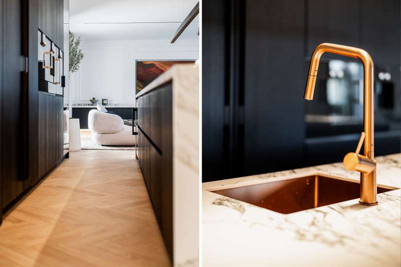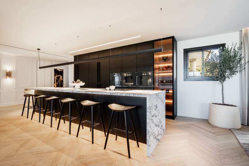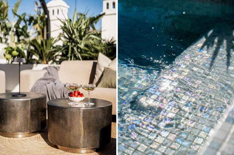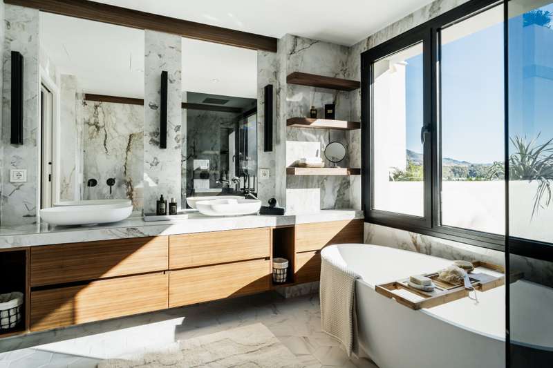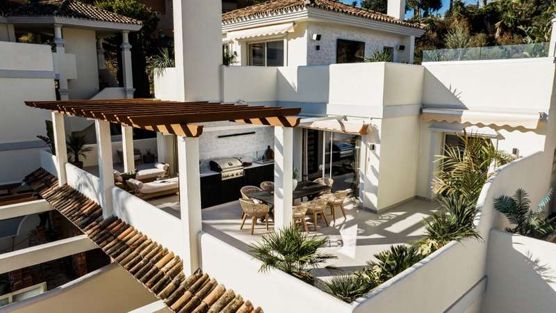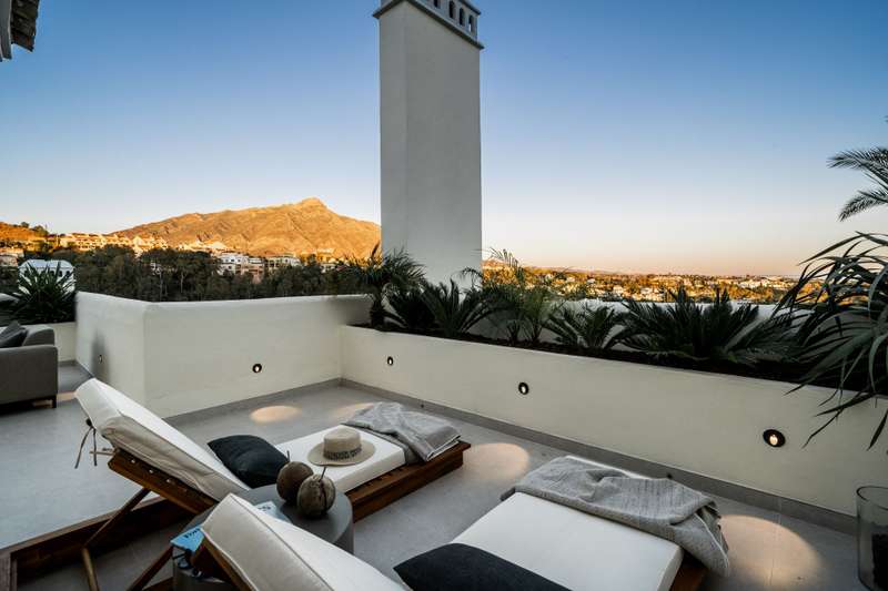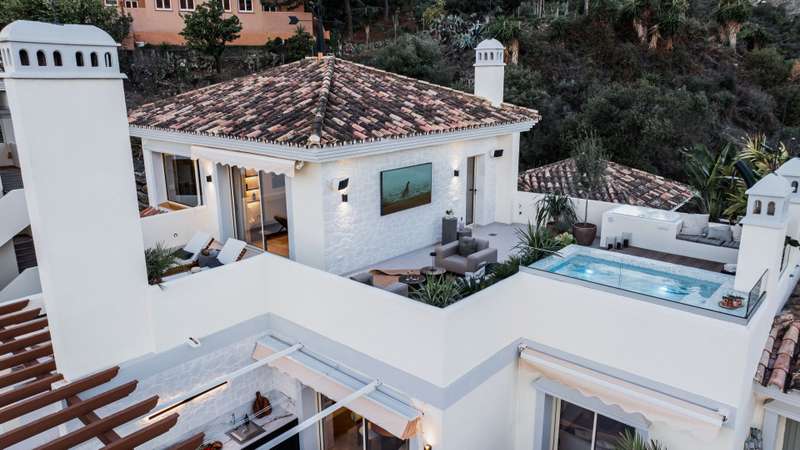 This duplex penthouse in Los Belvederes incorporates custom-made Scandinavian-style carpentry, has three bedrooms with en-suite bathrooms and panoramic views of the sea and mountains. The interior is adorned with Italian herringbone oak floors, providing a simple yet cozy atmosphere. Great attention has been paid to the details, with ultra-UV windows, triple glazing, and underfloor heating in the bathrooms, just to name a few. Step out to a private space with a jacuzzi, outdoor shower, and a cozy outdoor cinema. The penthouse is conveniently located near amenities such as schools, shops, and entertainment areas like Puerto Banus.