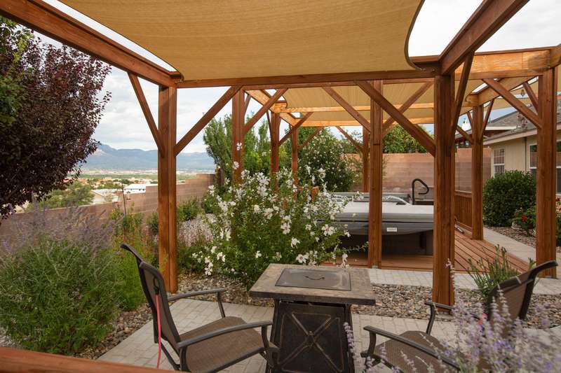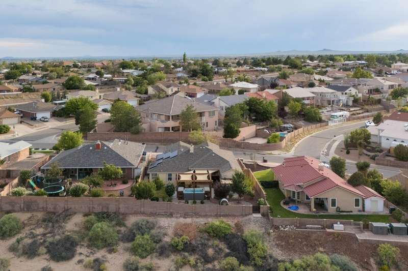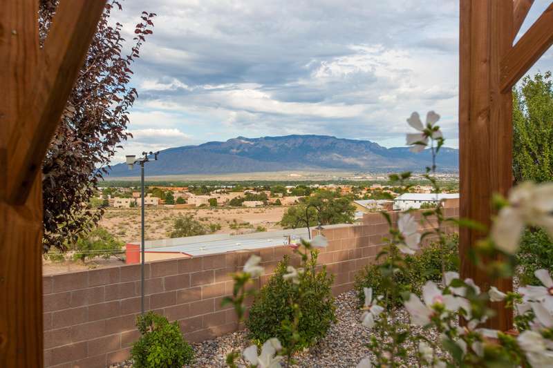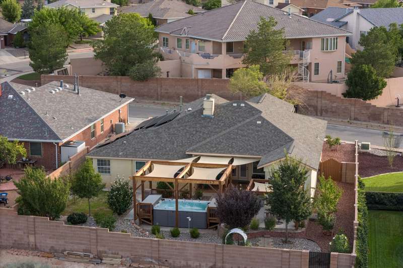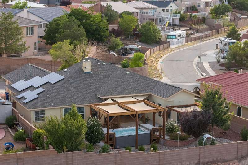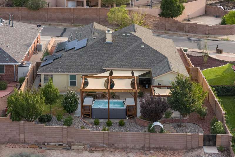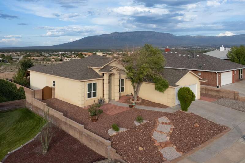 Stunning Panoramic views of the Sandia Mountains and the Bosque! Beautifully renovated single story with 3 bed plus a dedicated home office and 2 baths. Prime westside location convenient to major retailers, restaurants, grocery stores, and medical facilities. Formal dining room could be used as a flex space. Numerous updates and upgrades include New Low E Pella Windows (2020), New Water Heater (2020) Water Softner (2023), New Furnace and AC unit (2025), Replaced Roof Shingles (2022), Solar System (2022). Comfortable well designed floor plan! Phenomenal backyard is an extension of living space with patio and Cal Spa swim spa with heater, jets and cover! Garage is already set up with electric vehicle charging connection. Truly an exceptional home offering tremendous value.