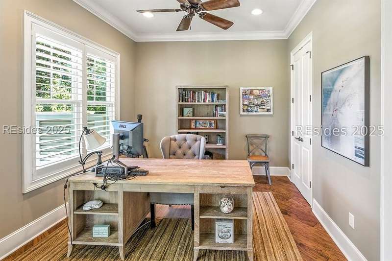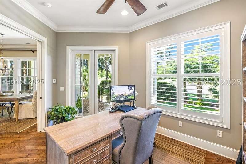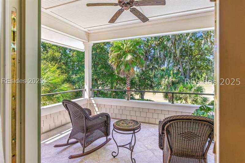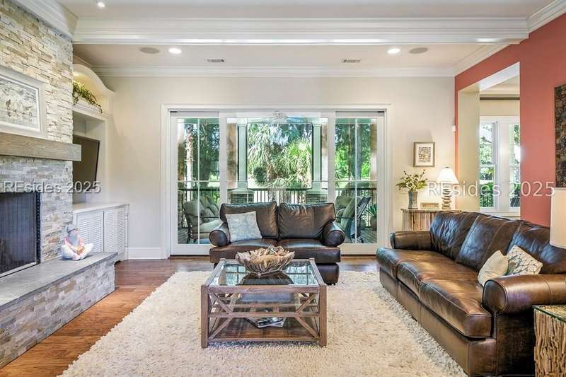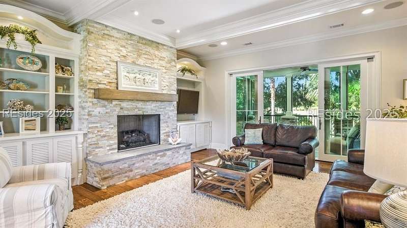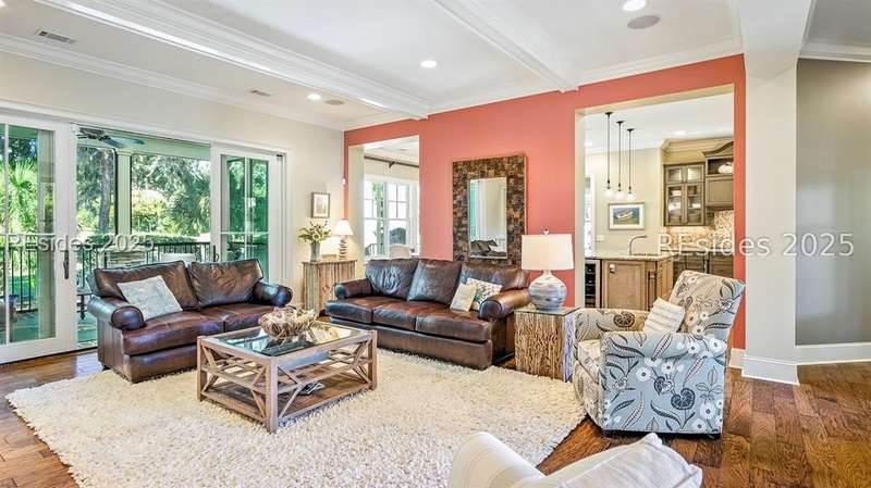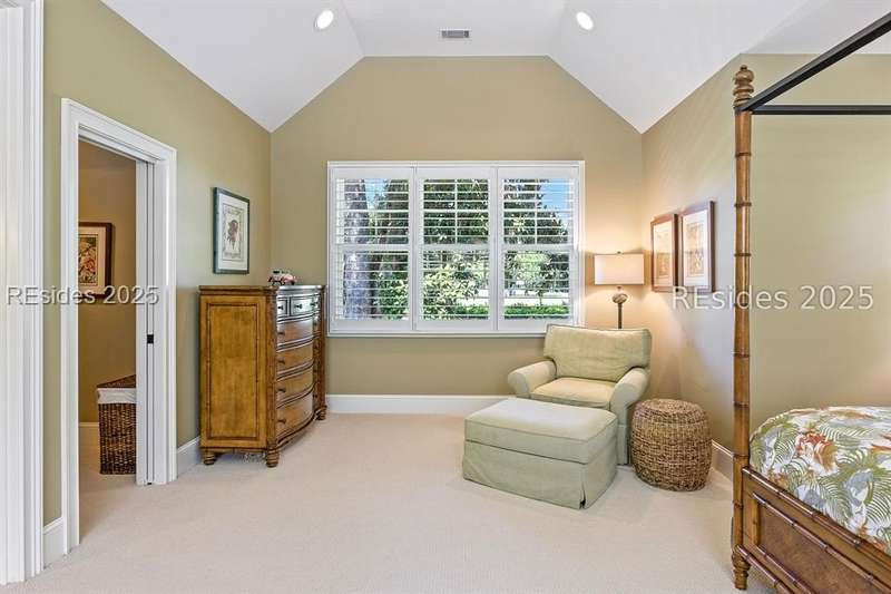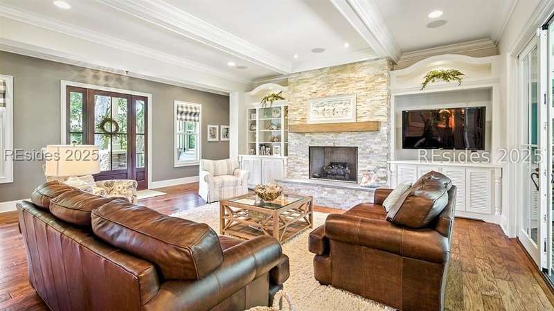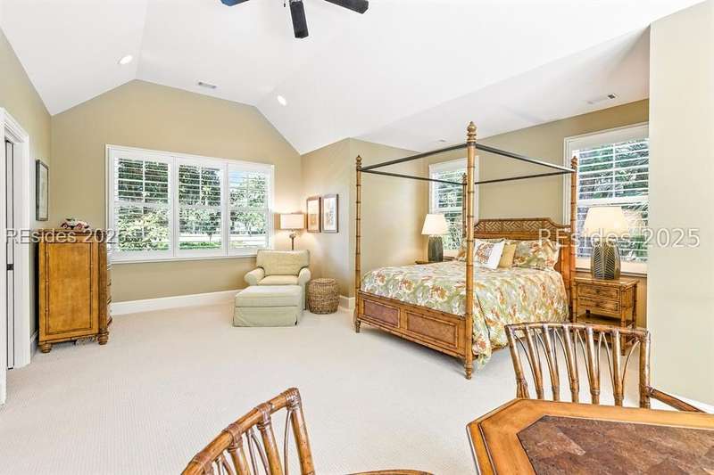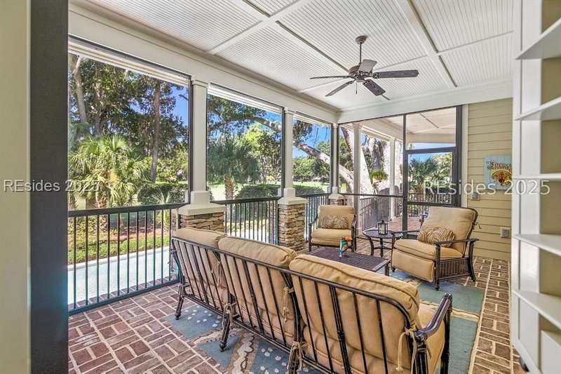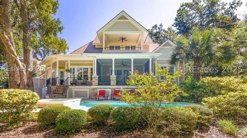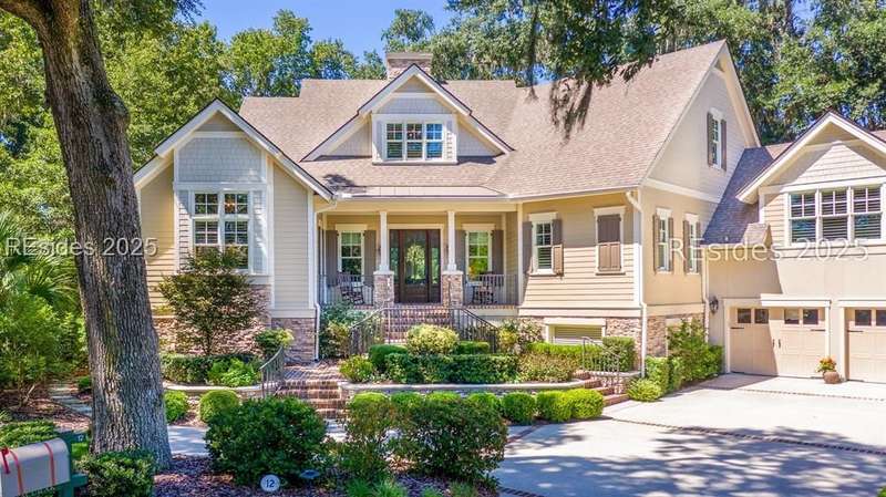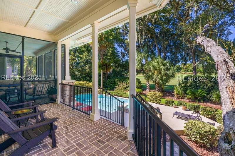 Nestled on a quiet cul-de-sac in the private Leamington community, this award-winning custom home combines timeless design, modern comforts, and a premier setting on the 13th fairway of the Arthur Hills Golf Course. With 3,618 square feet, this home has been meticulously maintained and thoughtfully crafted for both everyday living and entertaining. Inside, the family room centers around a gas fireplace and flows naturally into a custom kitchen, which features a large island, gas cooktop, stainless steel appliances, and beverage refrigerator. The first-floor primary suite offers privacy and convenience, while two upstairs ensuite bedrooms enjoy access to an upper-level covered deck with stunning golf views. A spacious fourth ensuite over the garage features a sitting area and a large walk-in closet, making it an ideal private retreat for guests or extended family. A private office provides the perfect space to work from home. Outdoor living shines with a screened porch, covered grilling deck, and saltwater pool with jacuzzi. Lush landscaping, a mosquito misting system, and panoramic fairway views create a private, resort-like setting. The backyard showcases panoramic fairway views, creating a tranquil retreat. Completing the home are an oversized 2-car garage with a golf cart bay, a spacious, walk-in attic with easy access, impact-rated windows and doors, integrated speakers, and a built-in safe.Living in Leamington means enjoying private beach access at the Leamington Beach Club, a new community pool and recreation complex, kayak launch onto the 11-mile lagoon, playground with bocce courts, golf cart-friendly streets, and 24/7 security. Few communities on Hilton Head offer this level of lifestyle, and few homes capture it as beautifully as 12 Leamington Ct.