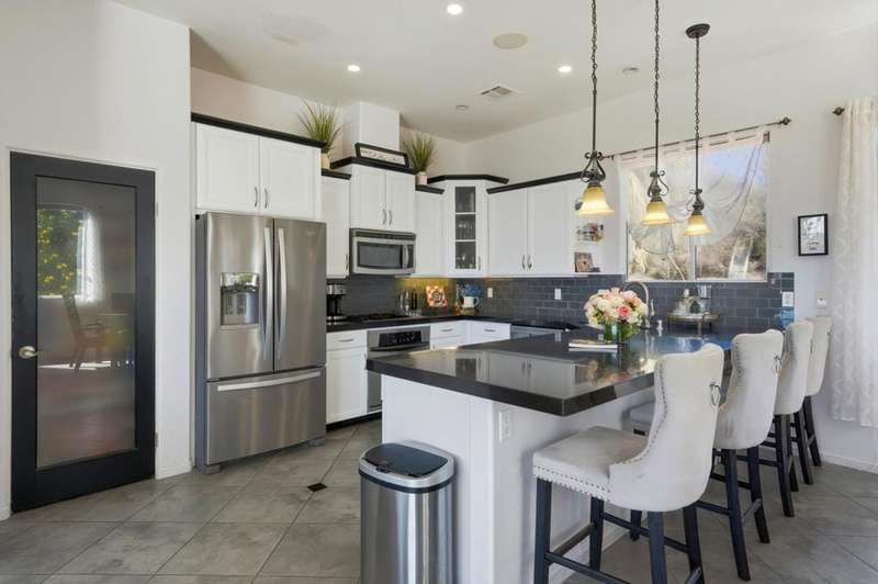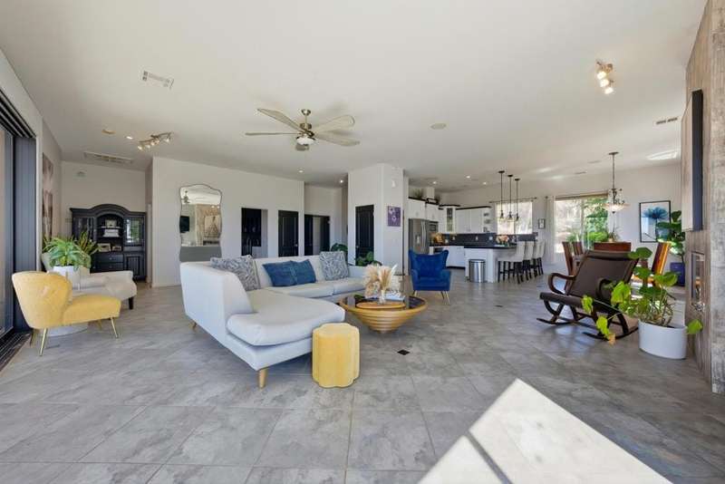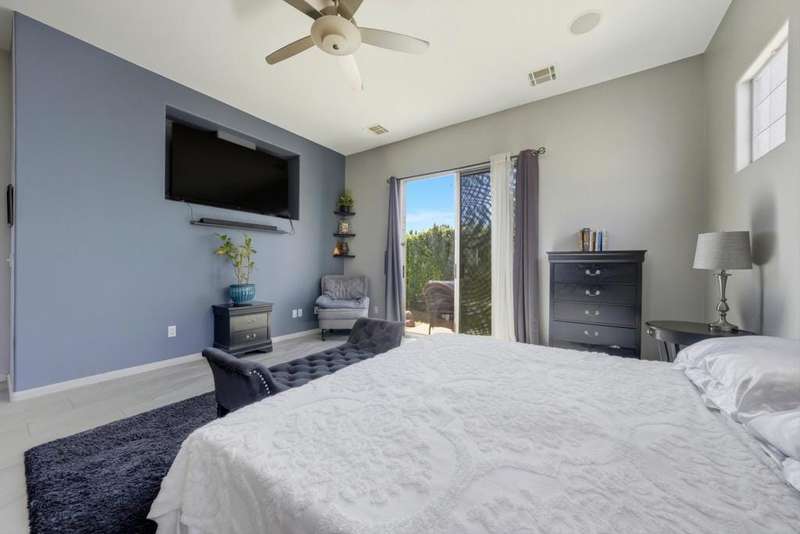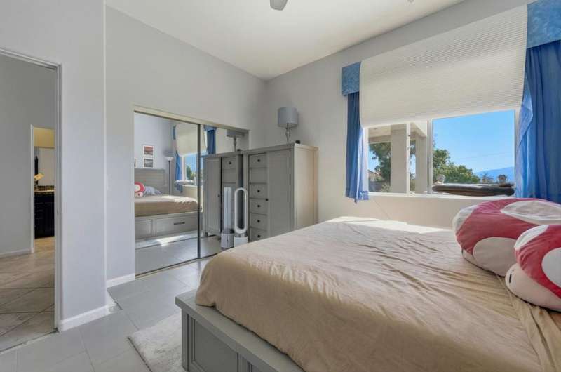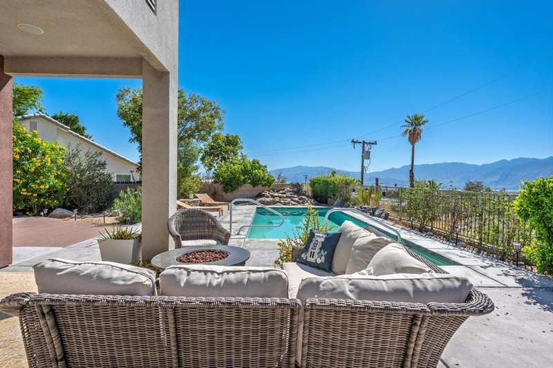 Million Dollar Mountain Views! Enjoy million dollar mountain views and an abundance of privacy from this exceptional home atop Spruce Street in this highly coveted hilltop Modern home. Contemporary designed exterior with two car attached garage with direct access from the home. This home is one of 5 homes at the end of Spruce Street in a quiet and private cul-de-sac. Exterior landscaping is desert scape for easy care and maintenance. There is a large pool and spa in addition to an outdoor fire pit and expansive pool decking with additional patio space. Inside you will immediately notice the amazing panoramic mountain views of Mount San Jacinto and surrounding mountains through the custom multi-paneled sliding glass doors. High ceilings allow you to take in the breathtaking sunsets and sunrises in this amazing open concept home. You will find four bedrooms and two bathrooms in addition there is a living room, and dining room. Enjoy lots of outdoor time in the spacious pool and spa that sits on this huge 10,454 square foot lot. The kitchen has granite slab counter tops and pendant lighting above the breakfast bar with counter seating for dining in addition to the large dining room area. The living room has a sleek fireplace and a fifth sliding door to the expansive outdoor space so you can take in all the exceptional views this home has to offer. There are porcelain tile floors for durability, easy care, and maintenance. Both bathrooms are large with dual sinks and lots of counter space. This home has lots of storage space too. There is a linen closet, separate laundry room, and pantry in the kitchen. This home has leased solar with approximately 10 years left on the lease, and the monthly lease payments are approximately $330. There is no HOA and this home is located on fee land so you own the land. Views like this are rare and hard to find. Call today to schedule your private showing to see this outstanding contemporary view home. Homes like this do not come on the market very often under a million dollars. So make this your golden opportunity to own a contemporary pool home with million dollar mountain views atop a hillside in an ideal location. Your friends and family will be wowed by these unbelievable panoramic mountain views.
