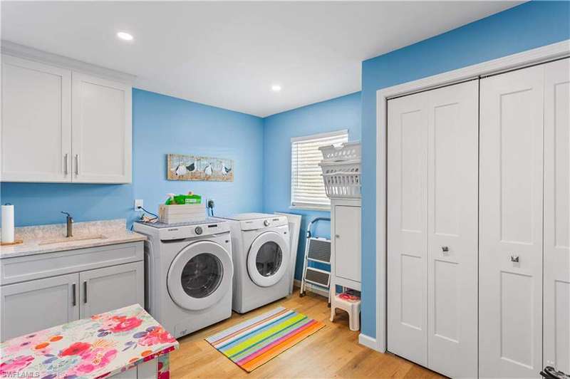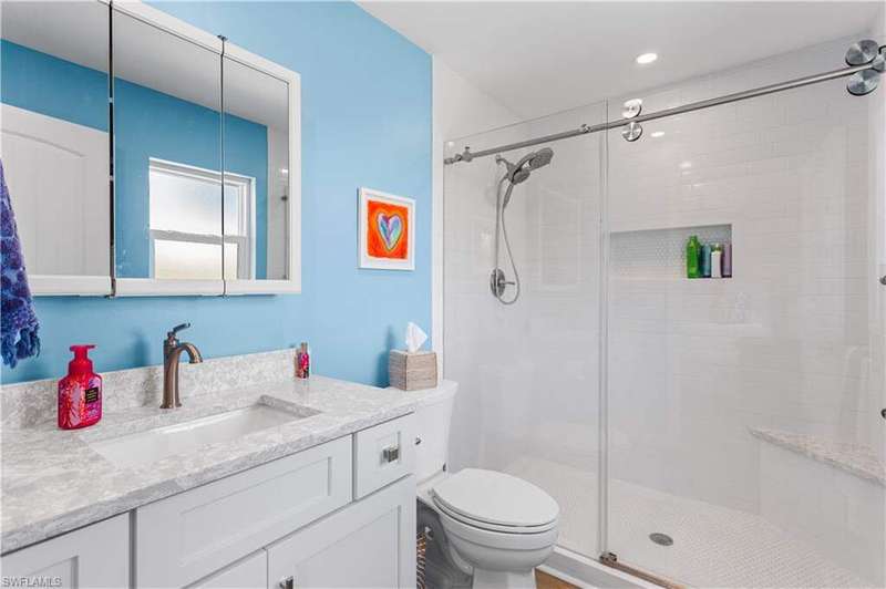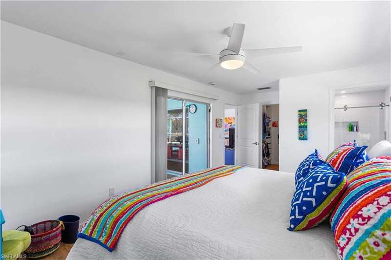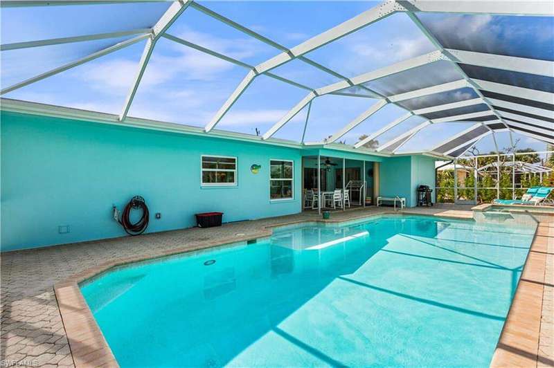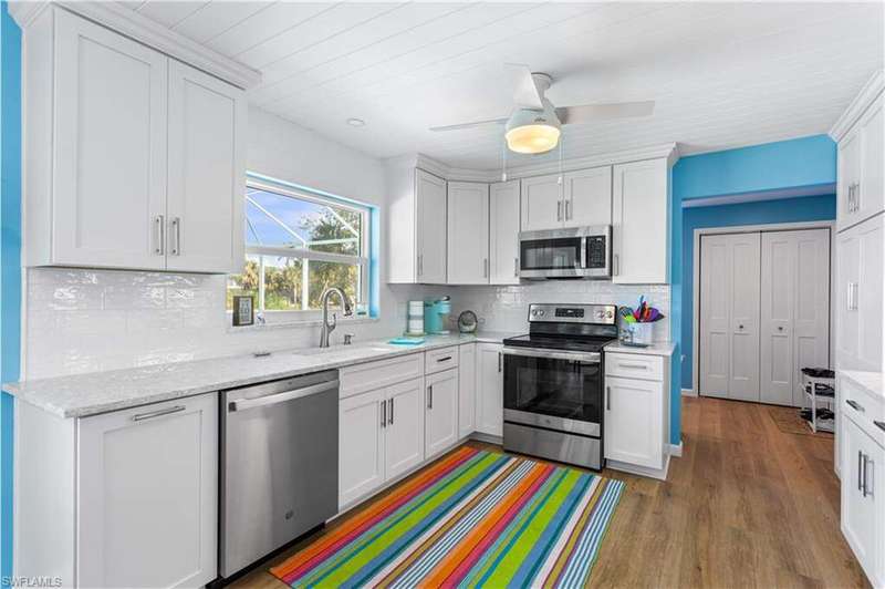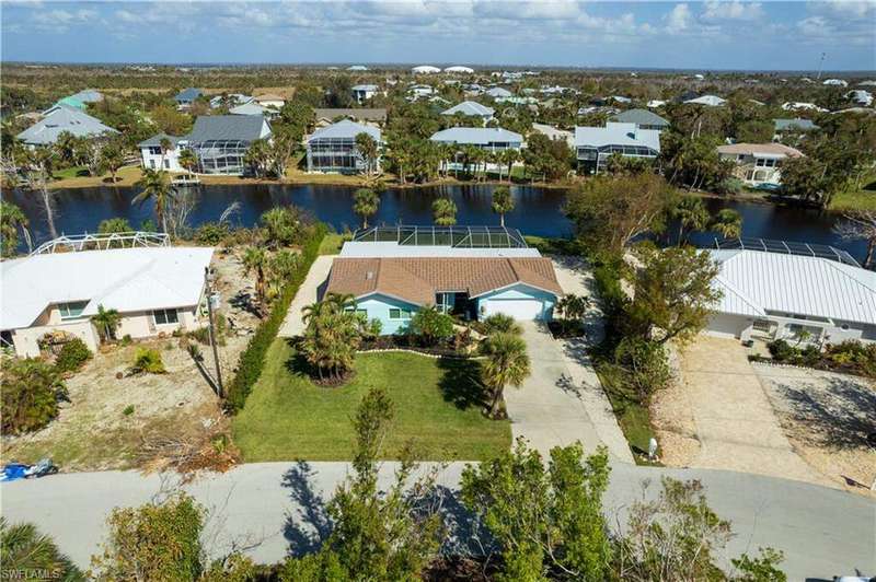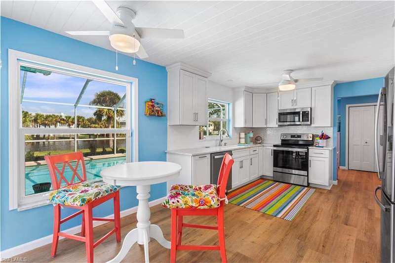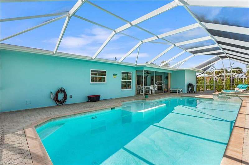 One floor living on an ELEVATED lot in East Rocks! Check out this stunning three-bedroom gem near the beach in the popular East Rocks neighborhood, comfortably distant from the bustling resort district. Ready for a quick move-in, it comes mostly furnished. Everything's new here-impact glass windows, a modern kitchen with quartz countertops, updated bathrooms, a wood plank ceiling, new appliances, new flooring, AC, water heater, and pool equipment. The pool cage is brand new, too, and the roof was replaced in 2021. Home has an outstanding rental history for those interested in using it as an investment property. This house exudes beachy vibes and boasts an amazing pool/spa area, complete with an oversized pool cage and a spacious pool deck. Enjoy fantastic sunset views over the lake and a short walk to the beach. Note: This property did NOT flood during Helene or Milton. No HOA!