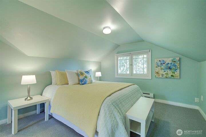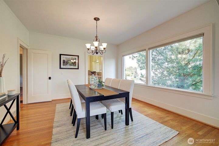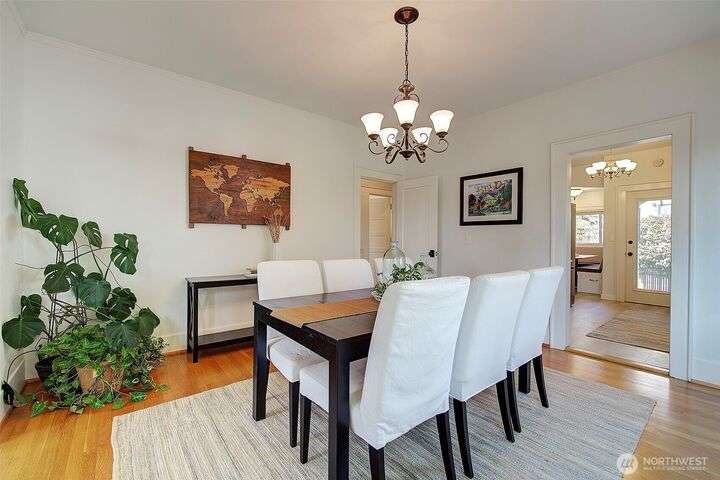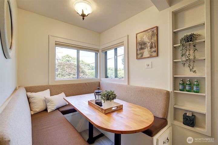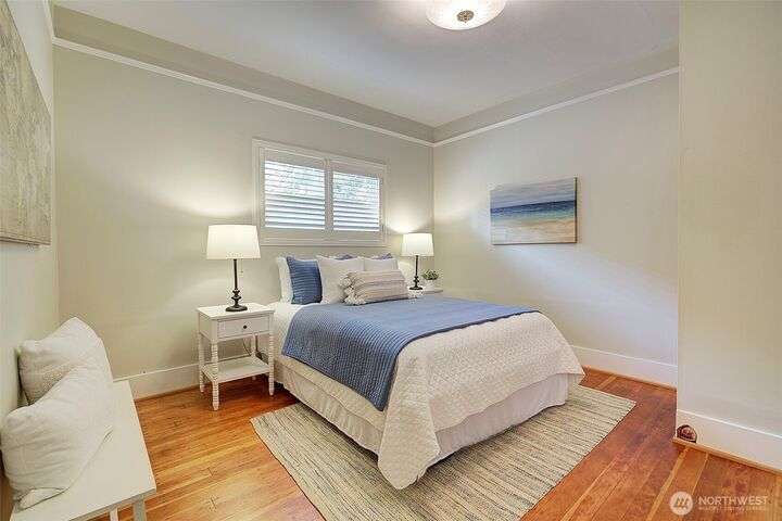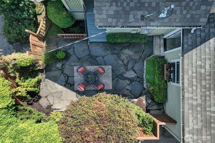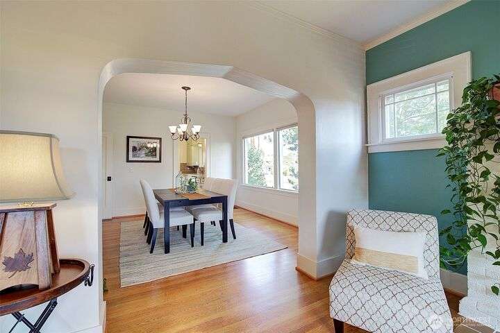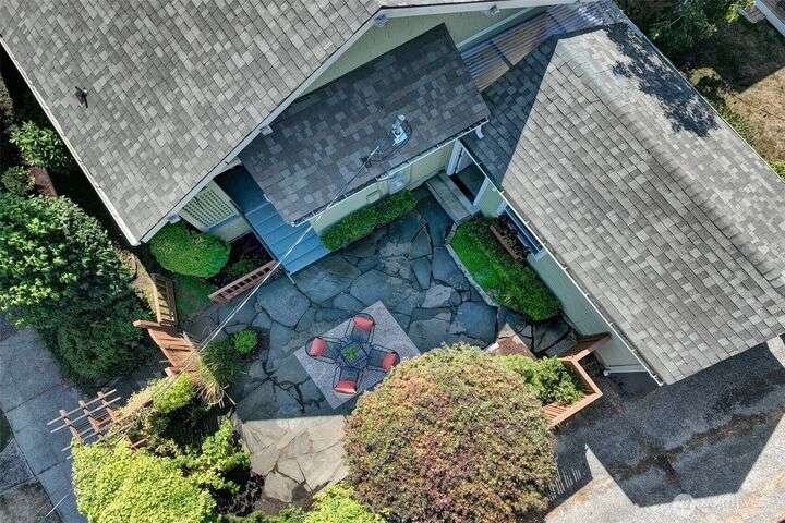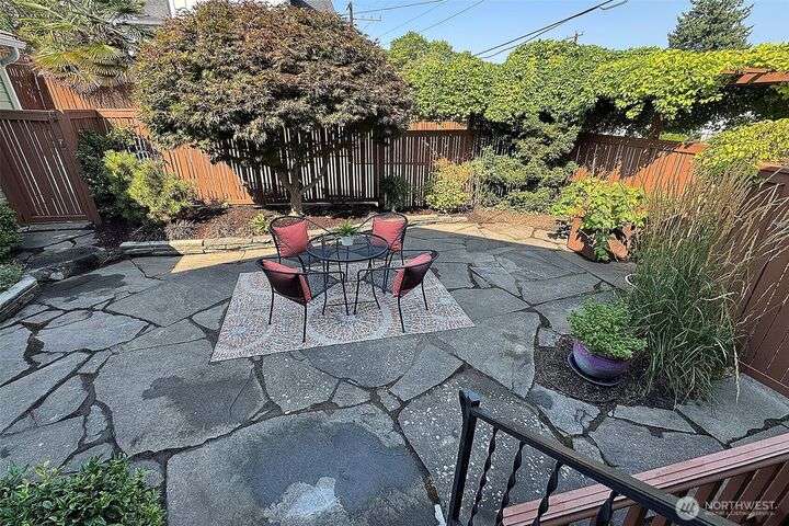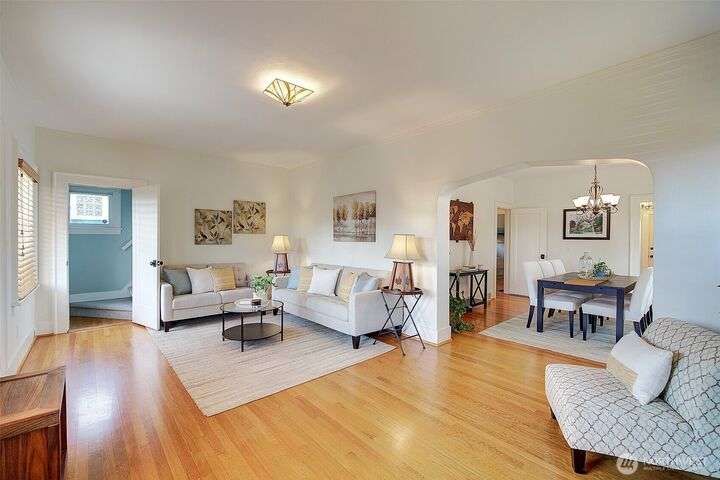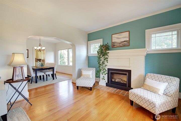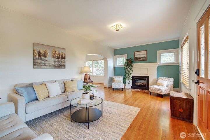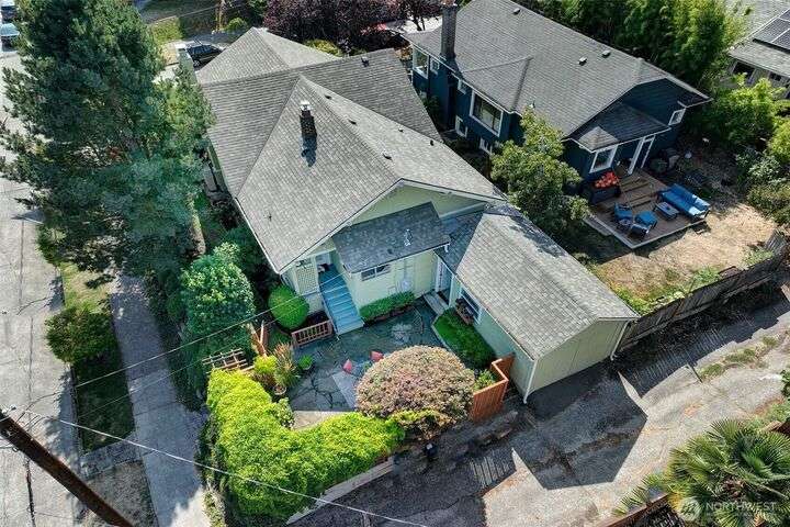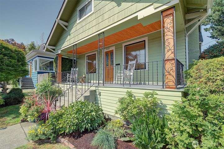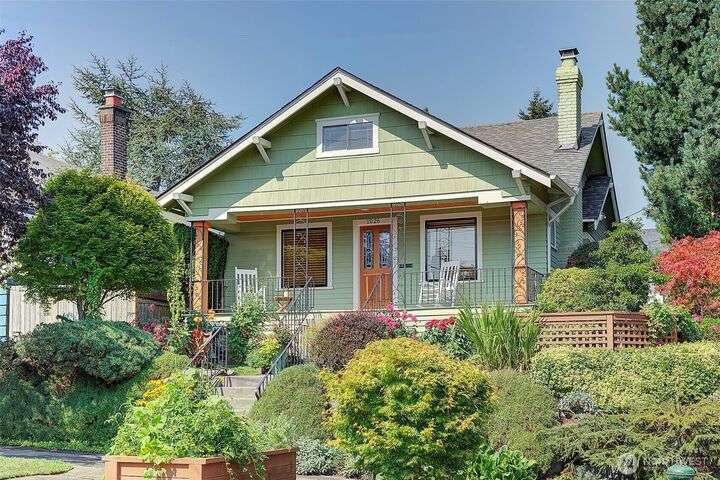 Welcome to this elevated corner-lot Craftsman, just blocks away from Green Lake & Wallingford! Charming front porch, with mountain view, welcomes you to sunlit living & dining rooms with beautiful hardwood floors & cozy fireplace. Updated kitchen with quartz countertops, new appliances & sweet breakfast nook. Private flagstone patio is perfect for summer dining! Two bedrooms & full bath complete the main floor. Upstairs, a spacious retreat w/2 walk-in closets (one is plumbed for future bath addition). Lower level offers private entry, full kitchen, living/dining, two bedrms & ¾ bath…ideal for guests, or multi-gen living. Enjoy the lush gardens, updated systems (HVAC, A/C, plumbing, electric, EV charger, new roof) just blocks from Zoo+ more!