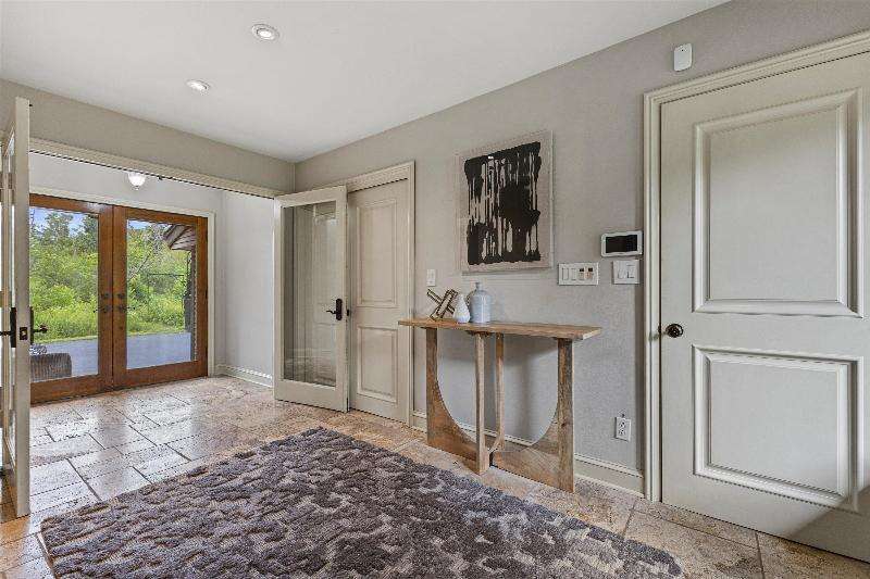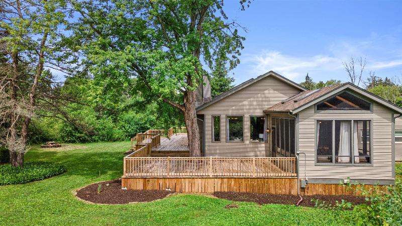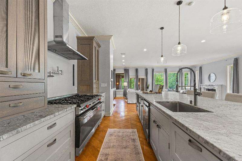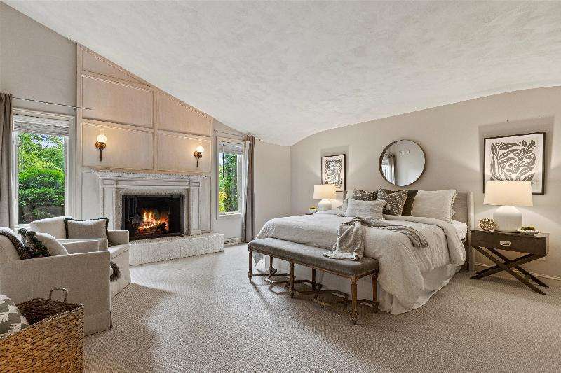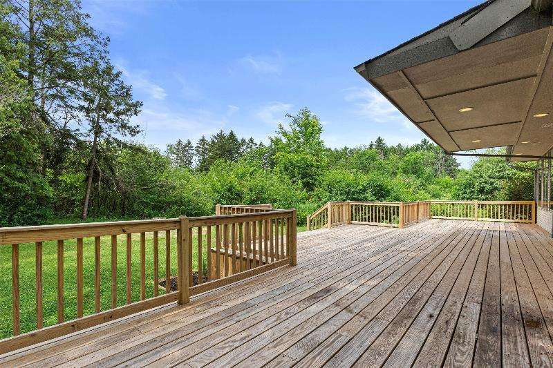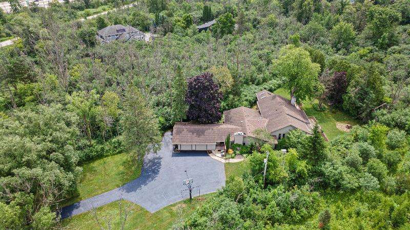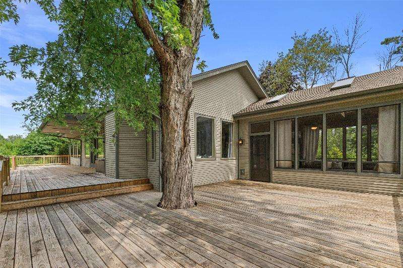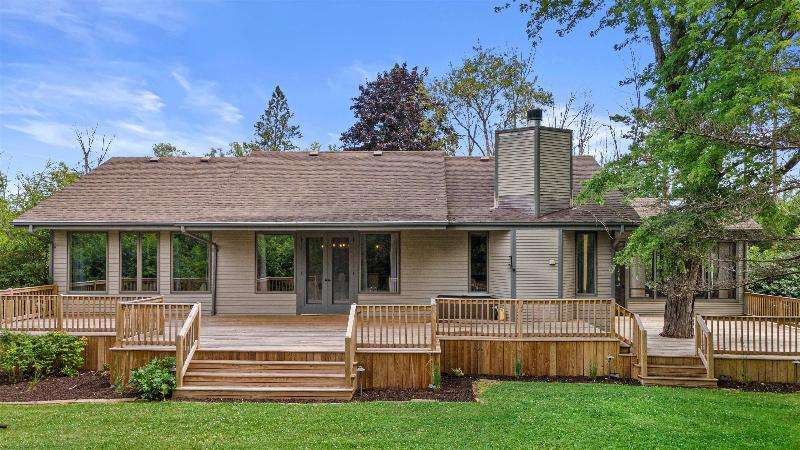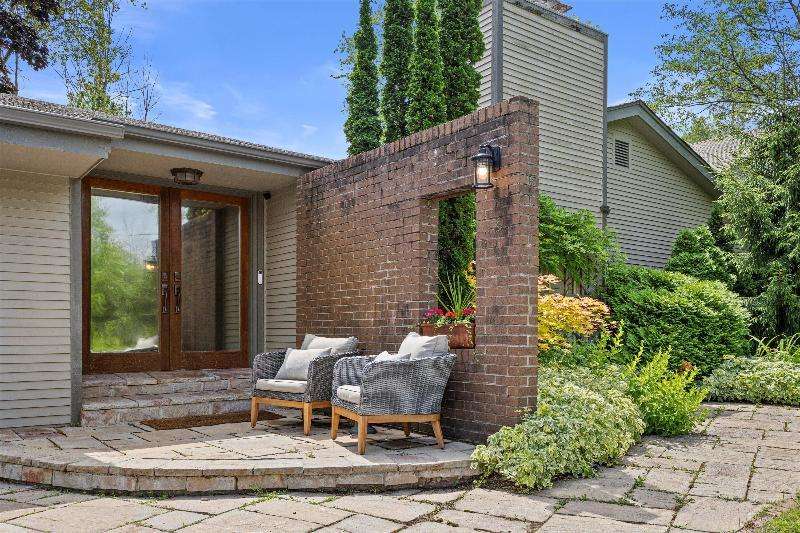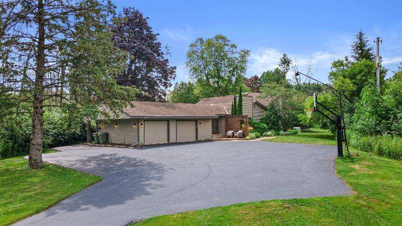 This peaceful River Hills oasis combines unique architecture and thoughtful updates on 2.5 private acres. Upon entering the spacious foyer, a gallery hallway leads to an expansive Great Room. Take in the floor to ceiling windows, two seating areas including an Italian marble fireplace, dry bar, and a chef's kitchen with 10 burner range, double ovens, honed granite counters, oversized island and a tucked away pantry. You'll find this space to be an entertainer's dream with new 75 foot deck and three seasons room with vaulted ceiling and skylights. Retreat to your primary suite including fireplace, walk in closet, laundry, and updated bath with heated floors and soaking tub. Finished basement includes screening room and designated workout space. Whole house generator offers peace of mind.