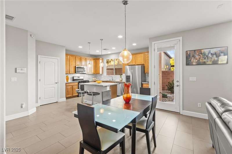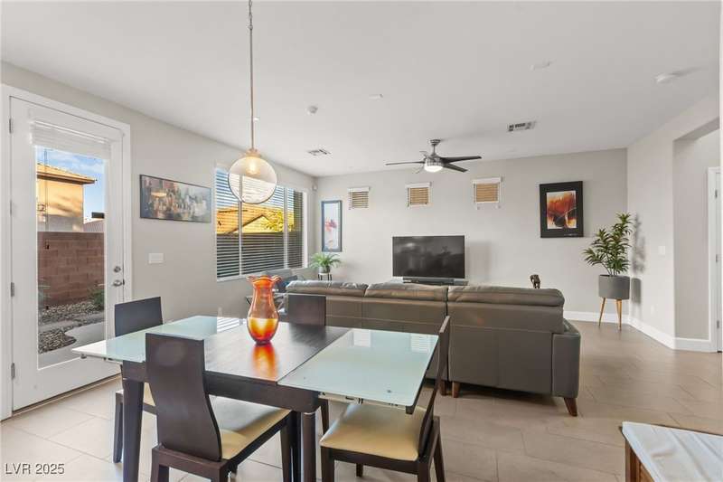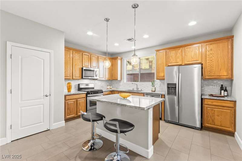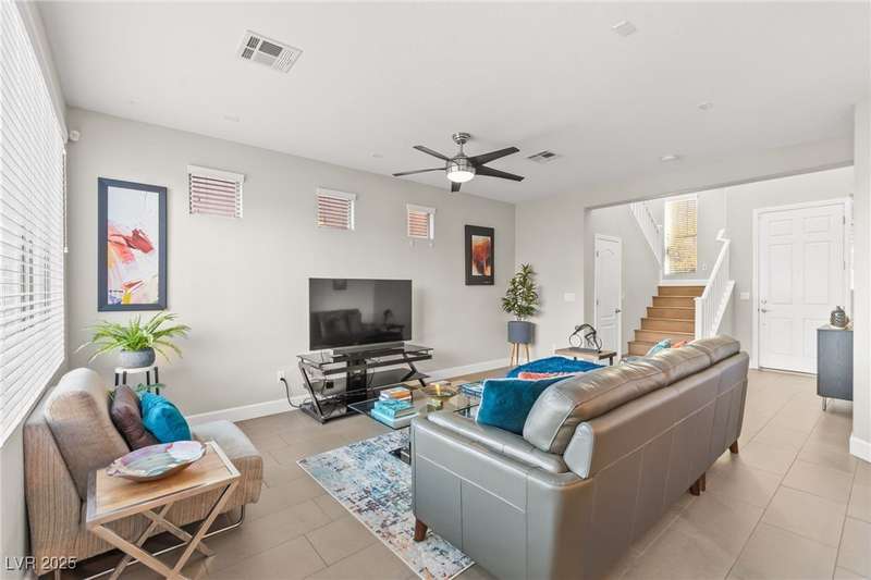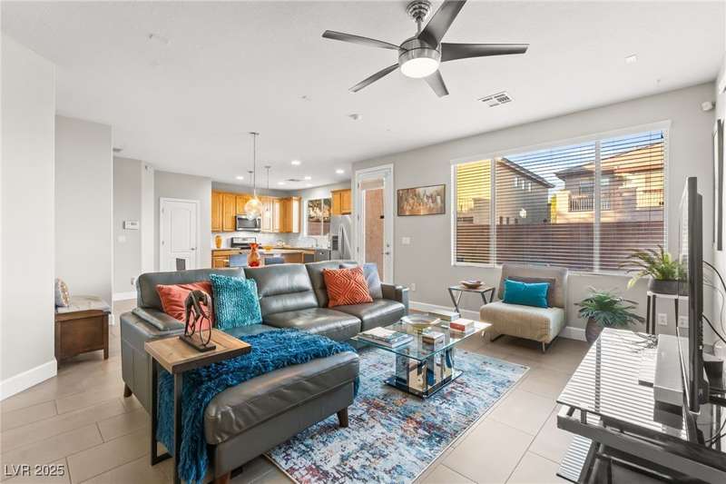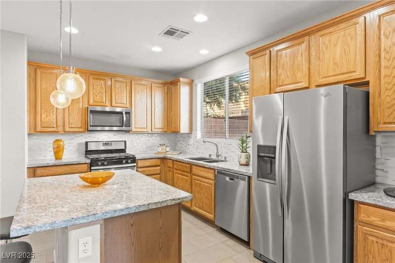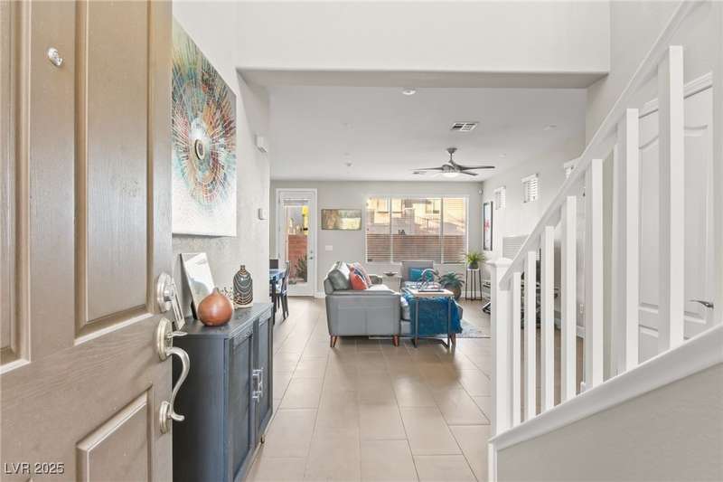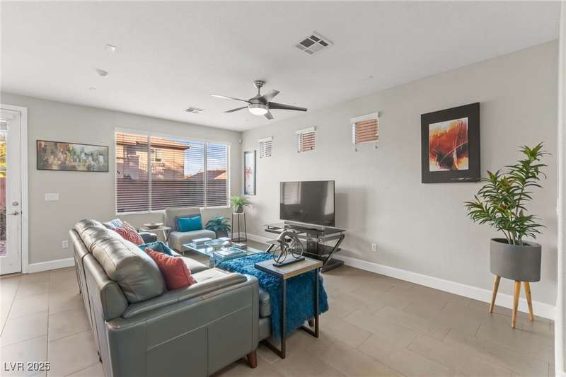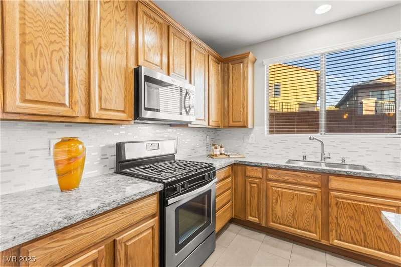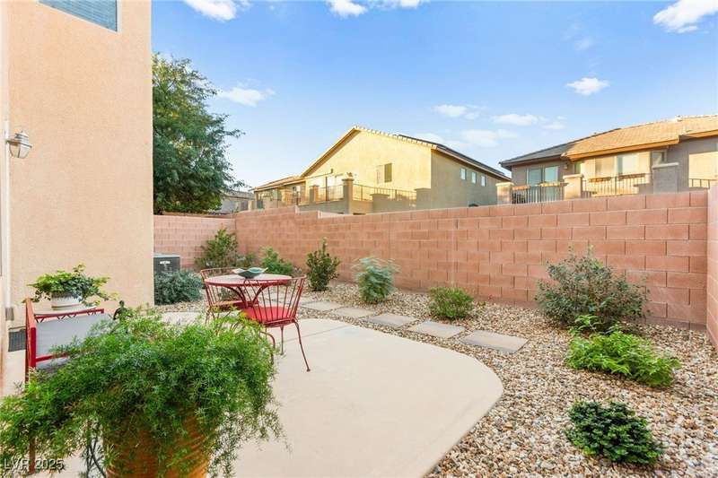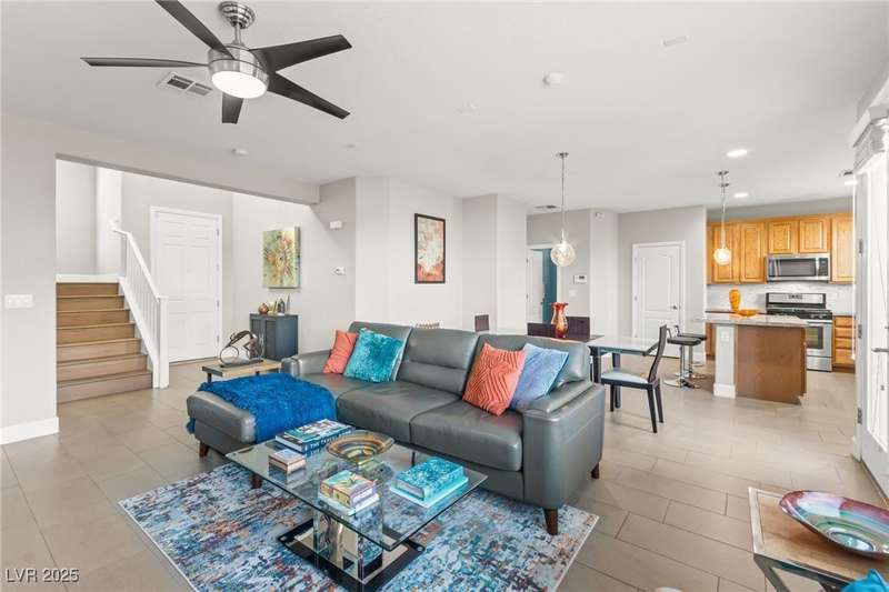 This immaculately maintained, and beautifully updated single-family home features a spacious floor plan with a kitchen and dining area, and a comfortable living room—perfect for everyday living and entertaining. The kitchen offers ample cabinet space. The home includes 3 bedrooms and boasts upgraded finishes throughout, including large porcelain tile flooring, maple engineered stairs, upgraded carpet, new baseboards, granite countertops, a modern backsplash, new sink and faucet, contemporary pendant and bathroom lighting, ceiling fans in all bedrooms, and a neutral paint palette throughout. Step outside to a beautifully landscaped backyard, perfect for relaxing or entertaining. Located in a gated community in the Providence master plan with a fantastic playground and park, this home is also just a short drive from Centennial Hills Shopping Center, and freeways, combining comfort, convenience, and style.