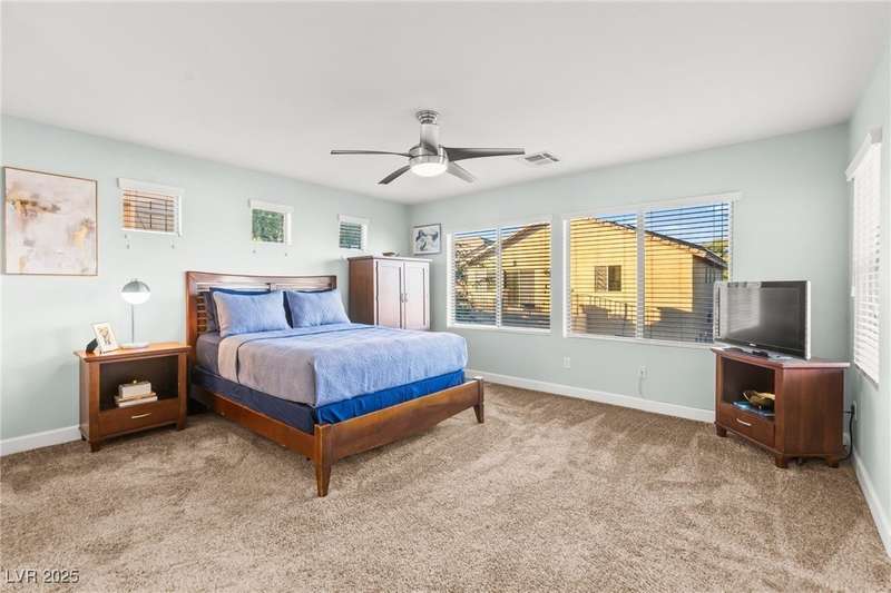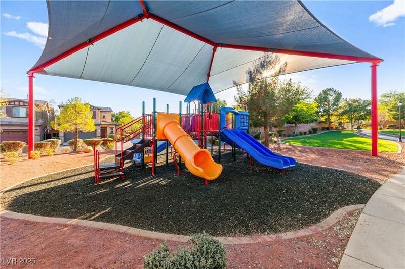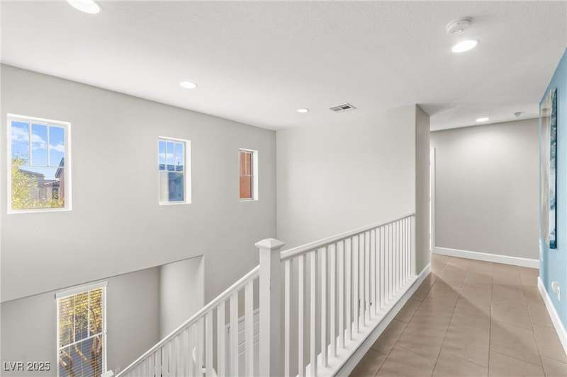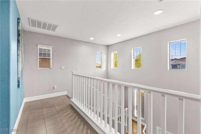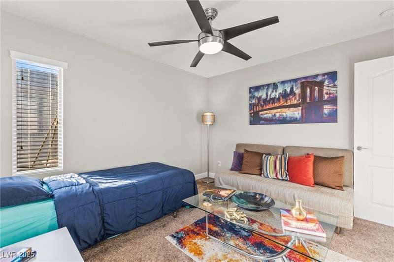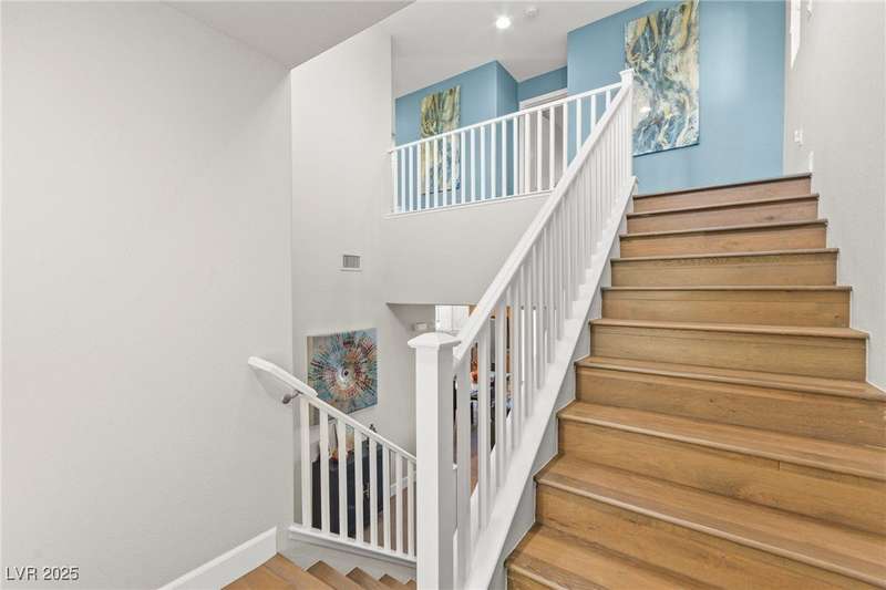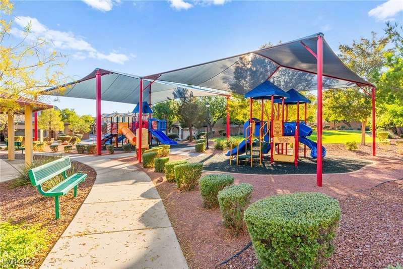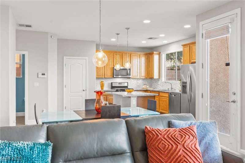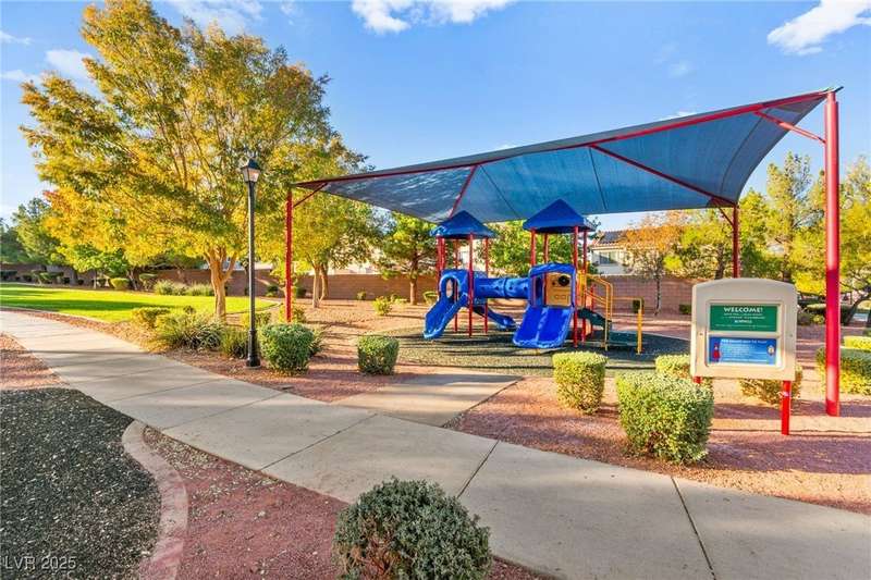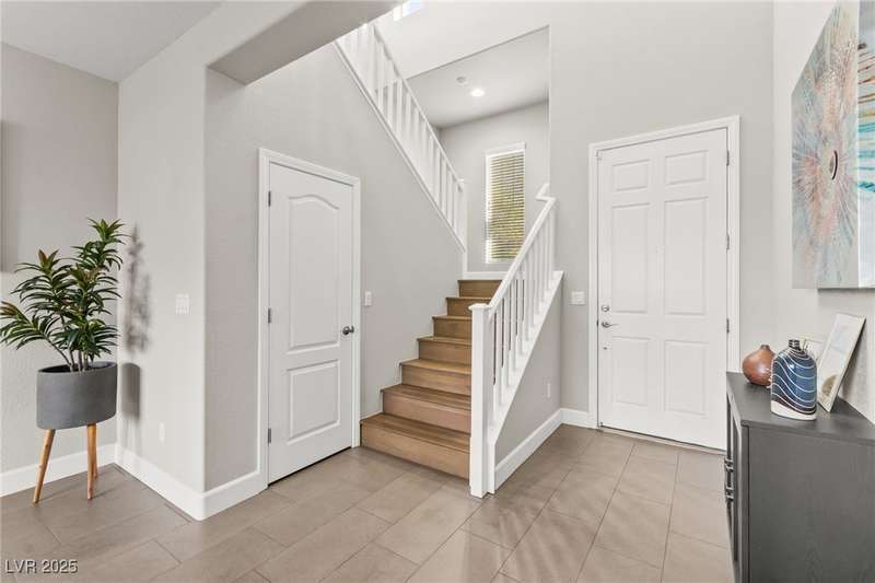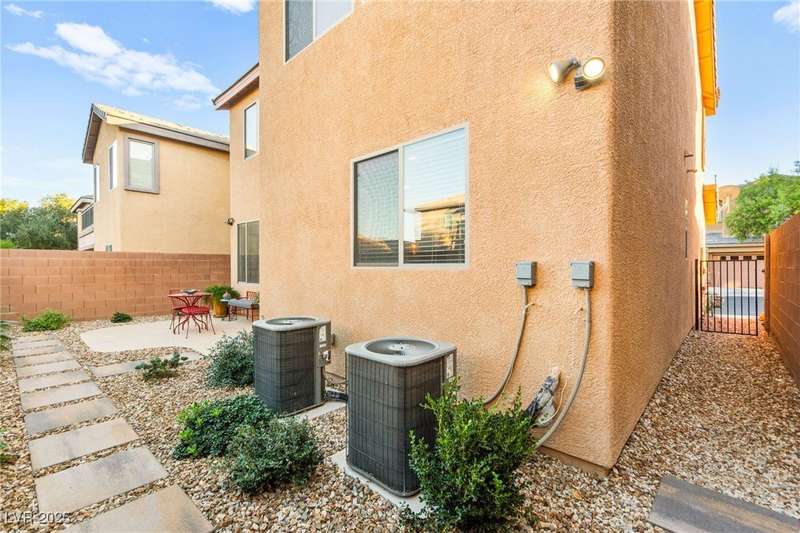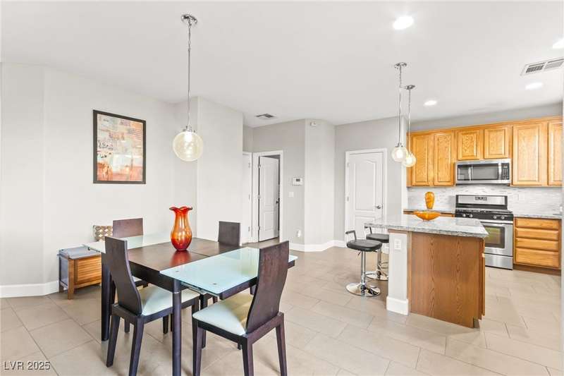 This immaculately maintained, and beautifully updated single-family home features a spacious floor plan with a kitchen and dining area, and a comfortable living room—perfect for everyday living and entertaining. The kitchen offers ample cabinet space. The home includes 3 bedrooms and boasts upgraded finishes throughout, including large porcelain tile flooring, maple engineered stairs, upgraded carpet, new baseboards, granite countertops, a modern backsplash, new sink and faucet, contemporary pendant and bathroom lighting, ceiling fans in all bedrooms, and a neutral paint palette throughout. Step outside to a beautifully landscaped backyard, perfect for relaxing or entertaining. Located in a gated community in the Providence master plan with a fantastic playground and park, this home is also just a short drive from Centennial Hills Shopping Center, and freeways, combining comfort, convenience, and style.