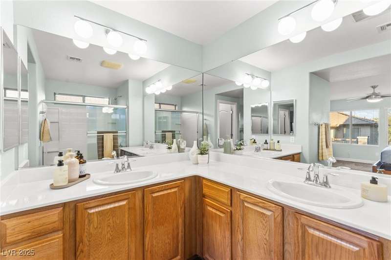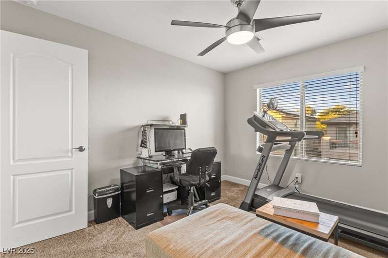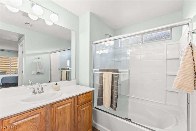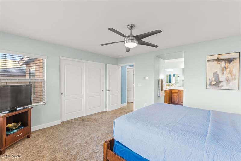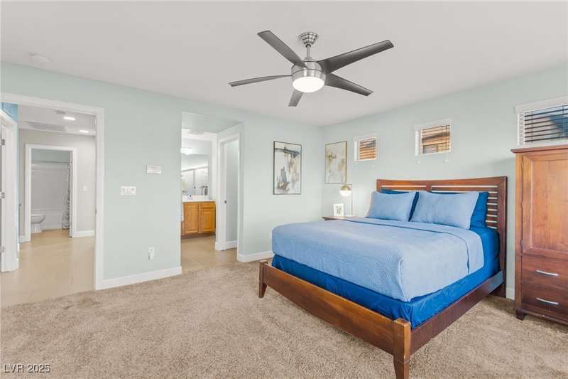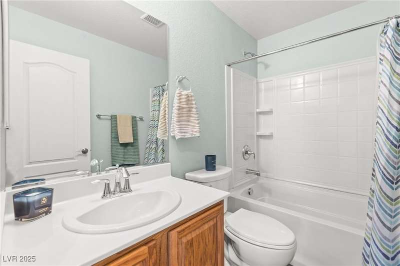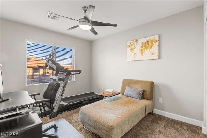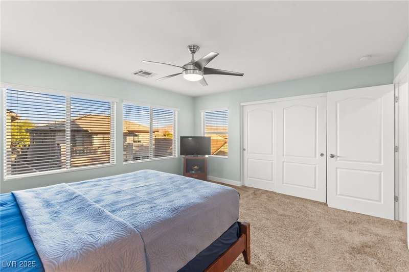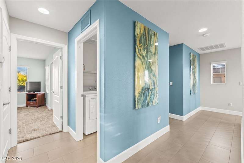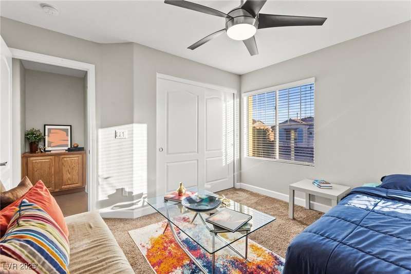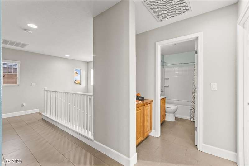 This immaculately maintained, and beautifully updated single-family home features a spacious floor plan with a kitchen and dining area, and a comfortable living room—perfect for everyday living and entertaining. The kitchen offers ample cabinet space. The home includes 3 bedrooms and boasts upgraded finishes throughout, including large porcelain tile flooring, maple engineered stairs, upgraded carpet, new baseboards, granite countertops, a modern backsplash, new sink and faucet, contemporary pendant and bathroom lighting, ceiling fans in all bedrooms, and a neutral paint palette throughout. Step outside to a beautifully landscaped backyard, perfect for relaxing or entertaining. Located in a gated community in the Providence master plan with a fantastic playground and park, this home is also just a short drive from Centennial Hills Shopping Center, and freeways, combining comfort, convenience, and style.