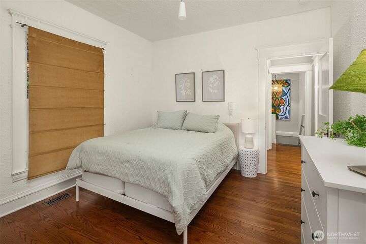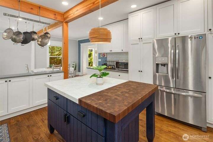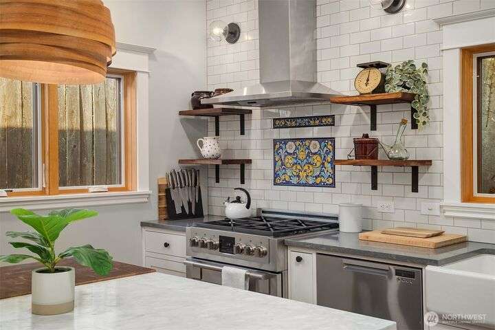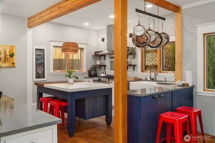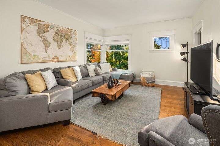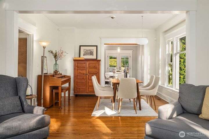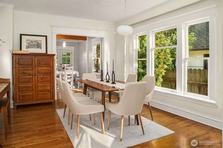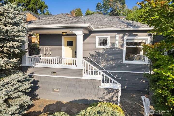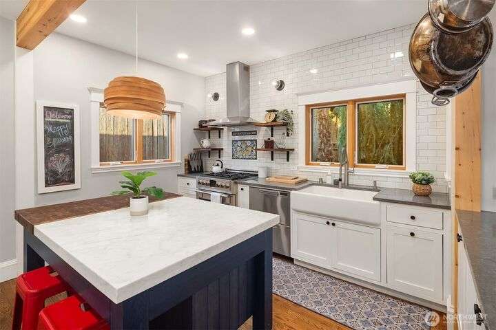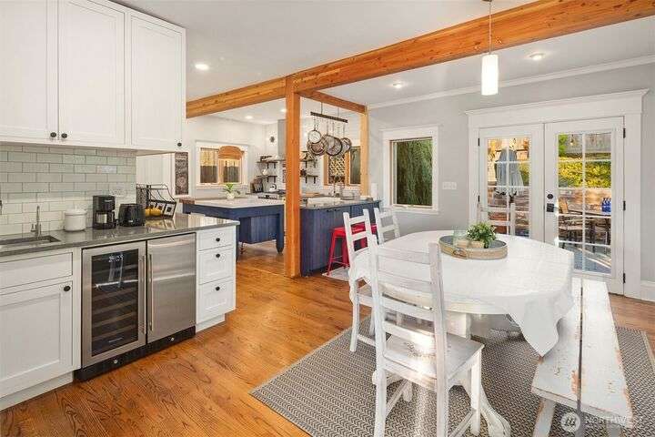 Queen Anne Craftsman w/ timeless charm, this 4-bed home blends historic character w/ stylish & modern updates. Hardwoods throughout. Entertainer’s kitchen features white shaker cabinetry, farmhouse sink, subway tile backsplash, & chef-grade SS appliances: Fulgor, Fisher & Paykel. Spacious gathering island & built-in wet bar w/ beverage cooler create the perfect conversational hub. French doors from dining area open to fully fenced patio for seamless indoor-outdoor living. Lower level includes laundry room w/ utility sink & storage. Easy commute to Amazon & close to everything to love on Queen Anne. Perched above the street for abundant light & privacy.