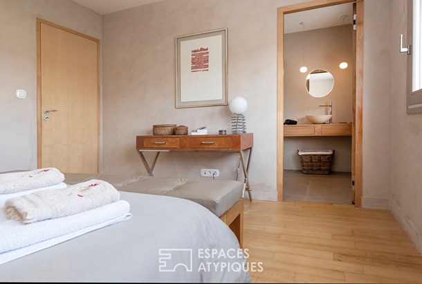 The upper floor leads to two bedrooms with dressing rooms, a family bathroom with a shower and bathtub, a separate toilet, and a master suite with a private shower room and large custom-made dressing room. The features are in keeping with its design: solid chestnut parquet flooring, fine wood storage, handcrafted zelliges in the bathrooms, and a craftsman-style kitchen. The house also benefits from private parking for two vehicles on the plot, secured by an electric gate.