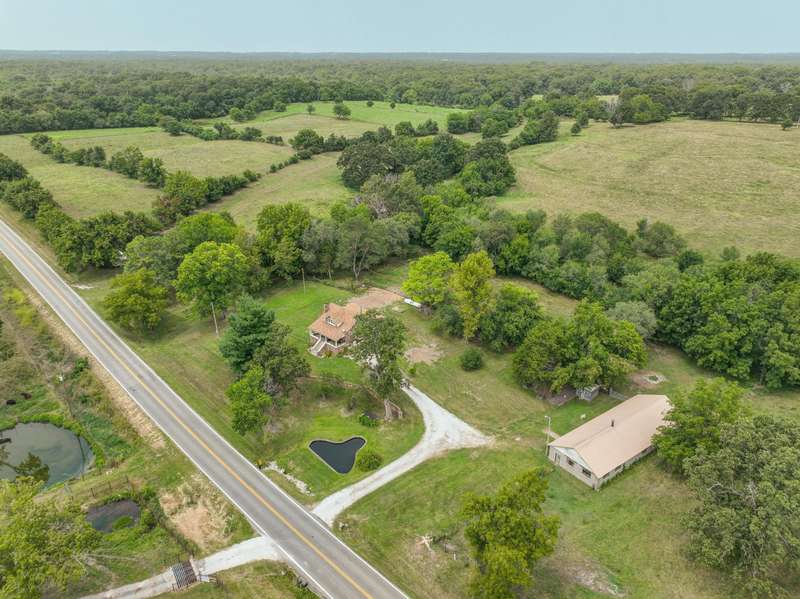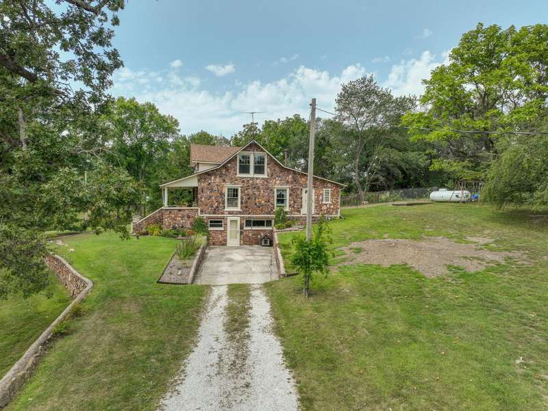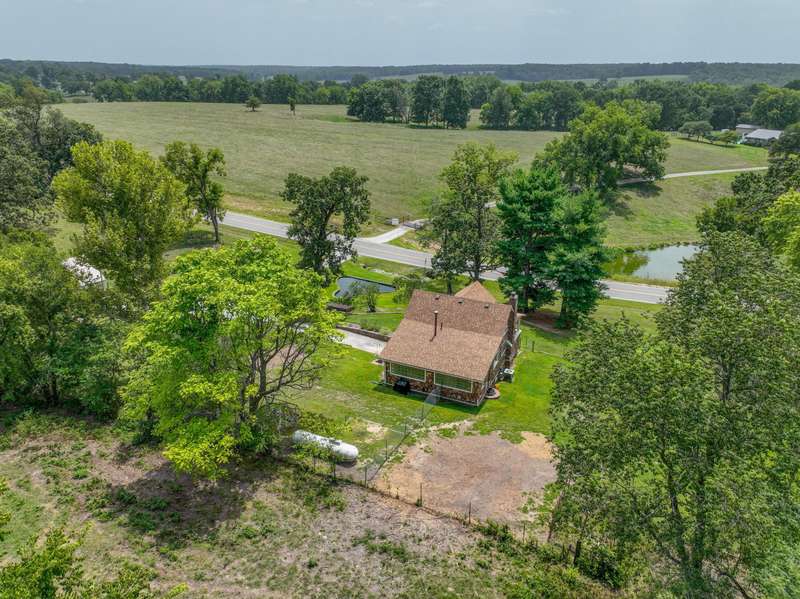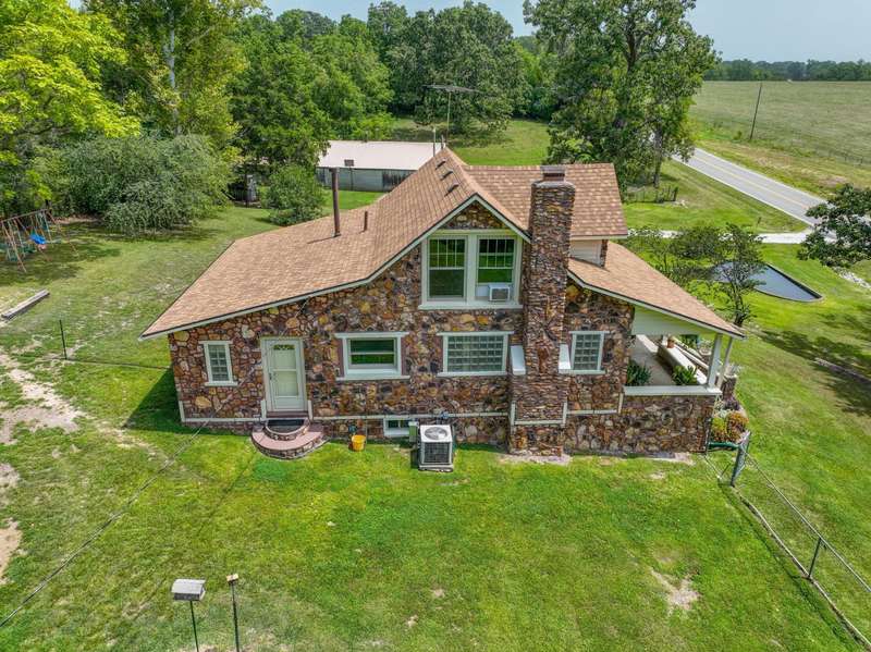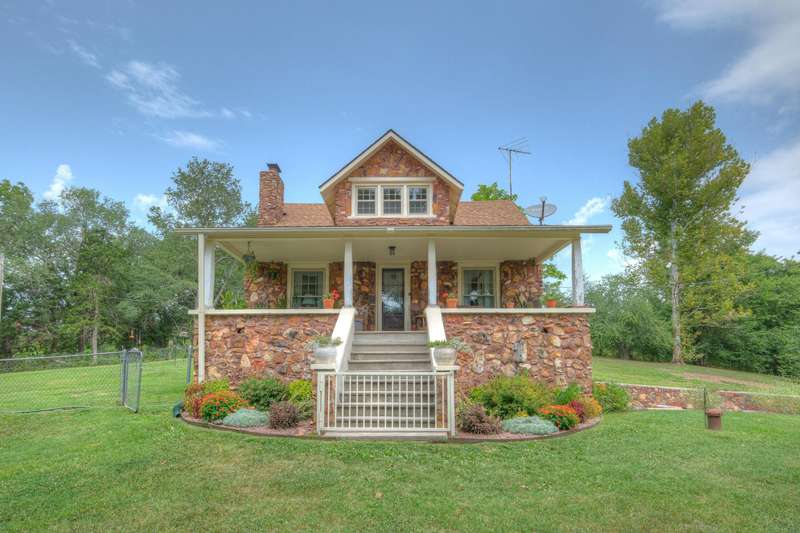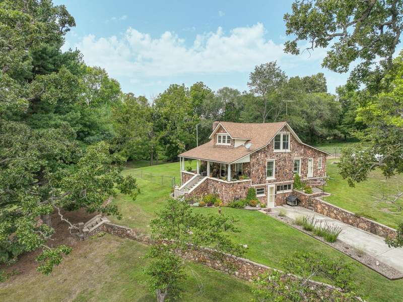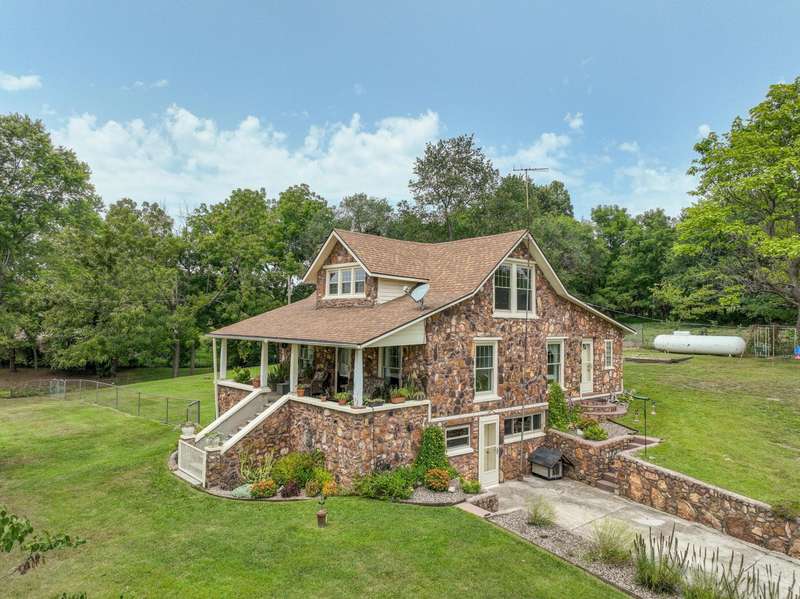 SELF-SUFFICIENT, 21.65 +/- ACRE, CROSS FENCED, HOBBY FARM WITH TWO WORKING WELLS, LIVE SPRING FED POND PLUS MANMADE POND! It's a perfect retreat for a quiet, self-sustained lifestyle! Enjoy life on your own Hobby Farm featuring Charming Rock House with peaceful front porch and great valley views of sunrises & sunsets! This Southwest Missouri Acreage is perfect for cattle, horses or other livestock. The second well is located in the west pasture and handy for watering the animals. The two story home is 1433 sqft on first and second floors; features main floor primary bedroom and two second floor bedrooms. The large living room is the perfect location to visit and relax. Dining room is highlighted by refinished hardwood floors and large picture window. Barn/shop to east of house is 2400sf total (30' x 80') with full electric power access; 900sf features concrete floor, wood heat, and electricity; remainder of barn has dirt floor and open access for livestock.Back inside the lovely stone home: Seller loves that all the windows are large, and home has plenty of natural light. Walk-out basement adds another 1043 sf of space (708.54 sf of bsmt is heated & cooled), perfect for family room, extra guests, or craft/hobby room. Basement Utility room doubles as storm room with concrete ceiling overhead and a 2nd bathroom. This Farmhouse has been lovingly preserved by the current owners and is very livable with updated, double hung & double paned windows, whole house water filtration reverse osmosis system, 6-year-old roofs on house and barn/shop Life out on the land is great too: Seller has seen lots of deer and other wildlife and especially enjoys the established garden, lovely flower beds, and mature trees. The chicken coop is a bonus for fresh eggs, etc. They say, 'having the natural spring water that never runs dry gives them peace of mind.' North and East side of house with barn is fenced for livestock. West side of house has chain link fenced yard. They also love the location, neighbors, and being close to I-49. Property has easy access to jobs, schools, and nearby cities or towns. It's a perfect place that will make your heart leap with joy as you imagine the quiet life you will live here.(Alternate option: House, Barn/Shop, Live Spring, Chicken Coop and 3 acres available see listing #60280542)