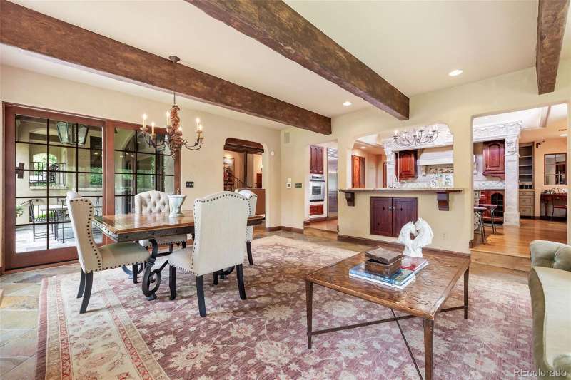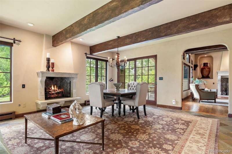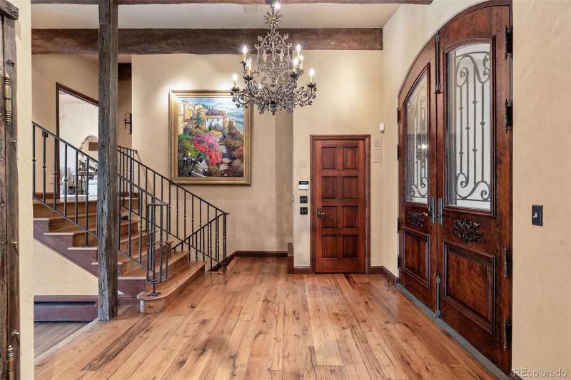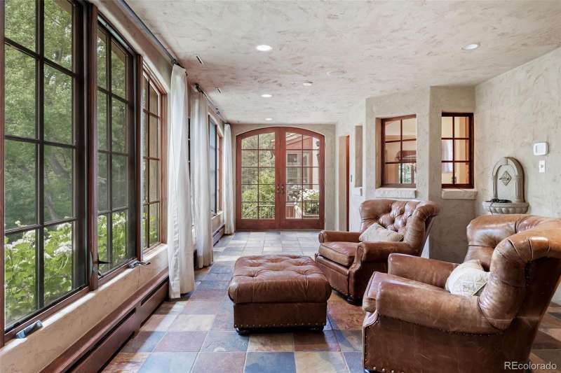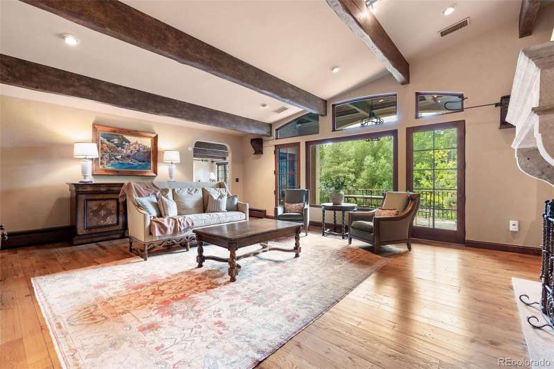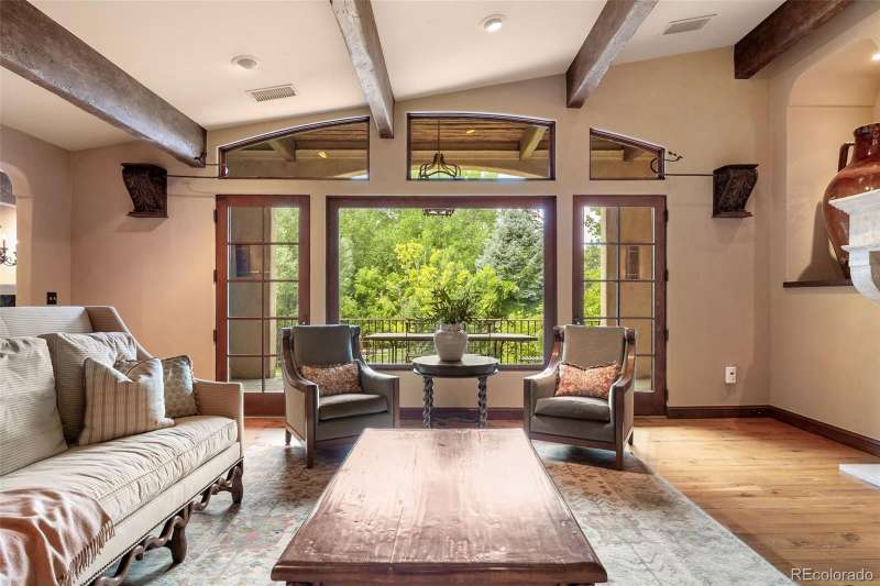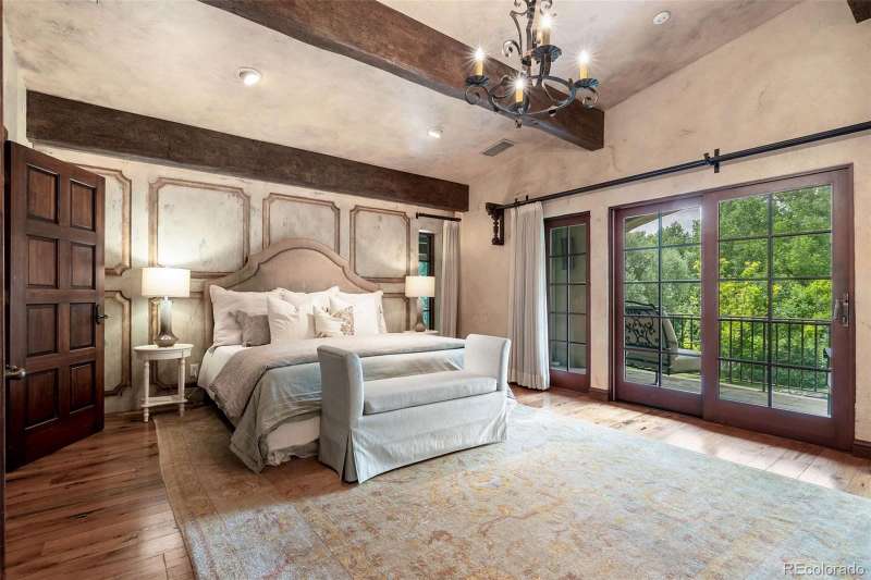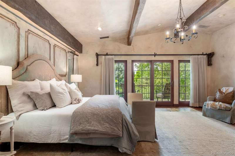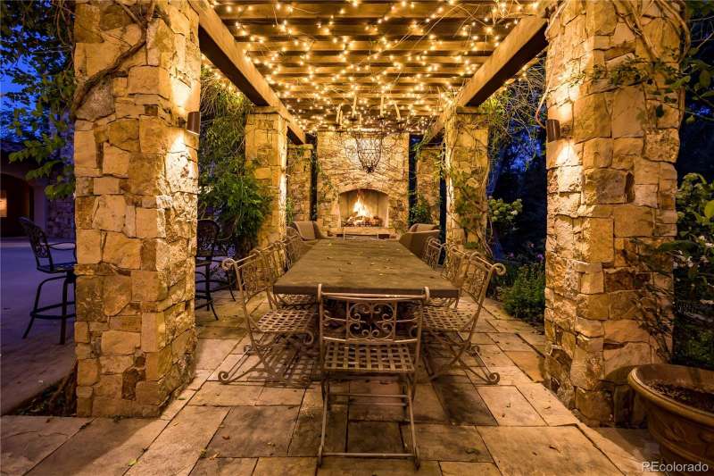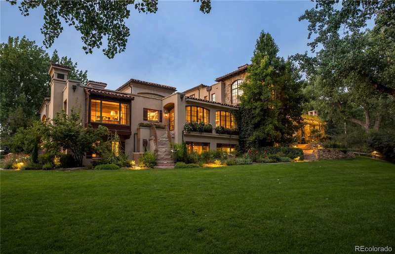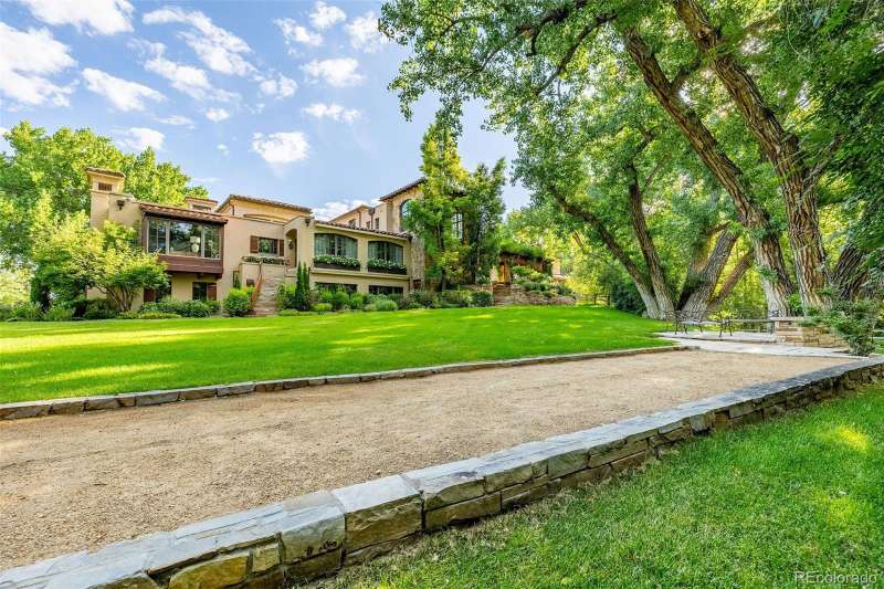 Residing at the end of a private lane and backing to Little Dry Creek, this magnificent property spans nearly 2 acres. Gated circular drive & porte-cochre invite you to this European style residence, incorporating uncompromising architecture, outstanding craftsmanship, customized details + stunning natural surroundings. Remarkable park-like grounds are comprised of multiple patios including an incredible space featuring outdoor fireplace & expansive vine-covered arbor, perfect for al fresco dining. Garages accommodating 4 cars feature epoxy floor coating + snow melt at the car court, courtyard & north walkway. Amazing flex space in the 650sf garage attic + a Martha Stewart potting shed. Enjoy gathering with friends at the bocce ball court, and watching sunsets over the exquisite pond, the epitome of outdoor activity & relaxation. Dramatic entry brings you into the thoughtfully designed dining & living rooms overlooking the impressive backyard with doors leading to the balcony. Well-equipped kitchen features attractive hand-painted tile, an original Scott Yablonski, signed by the artist; and accented by a colorful butlers serving area. Sumptuous primary boasts illuminating sunlight with patio, 6pc bath & walk-in closets + adjacent guest en suite. Vast lower level includes 2 en suites, family/game room, wine room, study, gym, laundry + storage. Richly accented with reclaimed hardwood floor, plastered walls, artistic wrought iron, custom carved European stone fireplaces & exquisite lighting fixtures. Handsome stone staircase leads you to a private suite with 4pc bath, coffee bar & patio elevated above the courtyard. A landmark property - a perfect private sanctuary or wonderful place to entertain on a small or grand scale. High ceilings + expansive doors & windows invite lively interplays of light & color. One of the most revered locations in Old Cherry Hills, this exceptional property offers an unmatched combination of privacy & proximity to so many amenities.