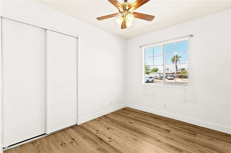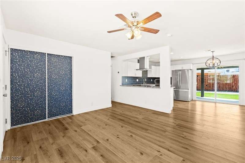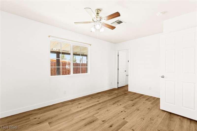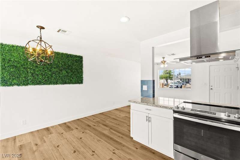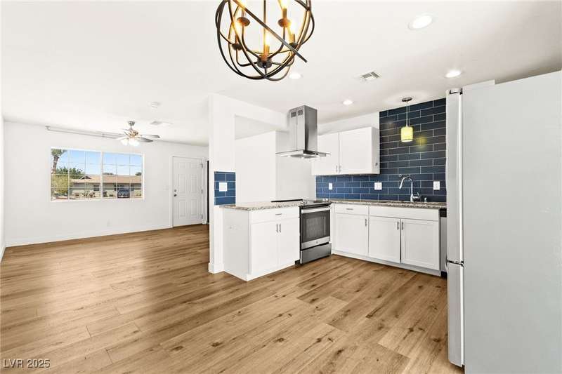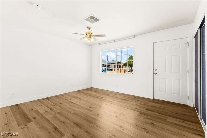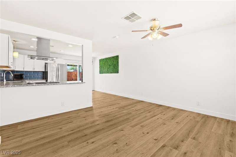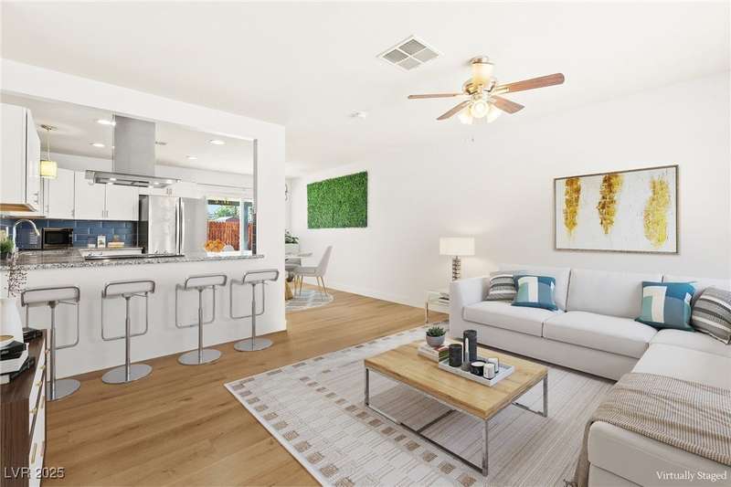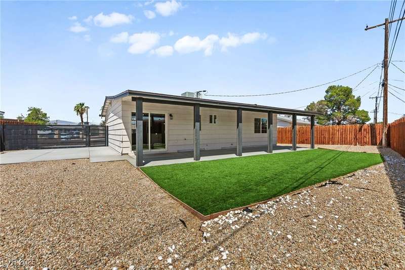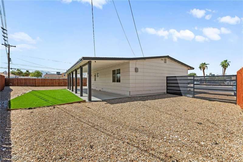 Tucked away on a peaceful cul-de-sac, this fully renovated home with a 3% VA assumable loan sits on a spacious pie-shaped lot offering ample parking and convenient RV gate access to the backyard. The outdoor space is perfect for entertaining, with a covered patio and plenty of room for a pool. Inside, the open-concept kitchen, dining, and living area flows effortlessly, highlighted by luxury vinyl plank flooring and modern finishes. The kitchen features granite counters, stainless steel appliances, white cabinetry, and a stylish backsplash. Three well-appointed bedrooms and upgraded bathrooms provide comfort, while ceiling fans throughout add convenience and style. The renovation also included a new roof, AC, electrical, and plumbing. Ideally located within walking distance to shopping and with easy freeway access for a short commute to Downtown and Summerlin, this turnkey home offers both comfort and convenience.