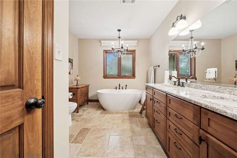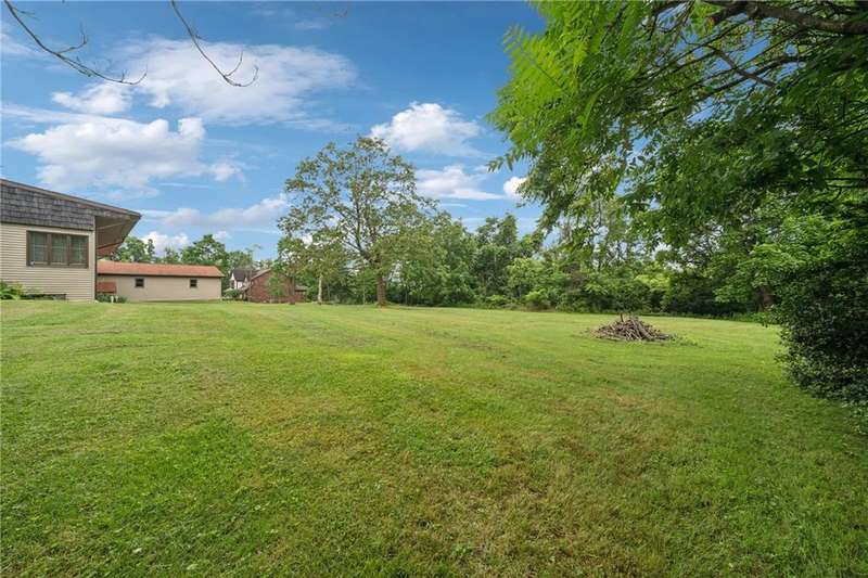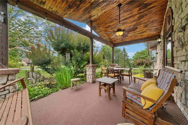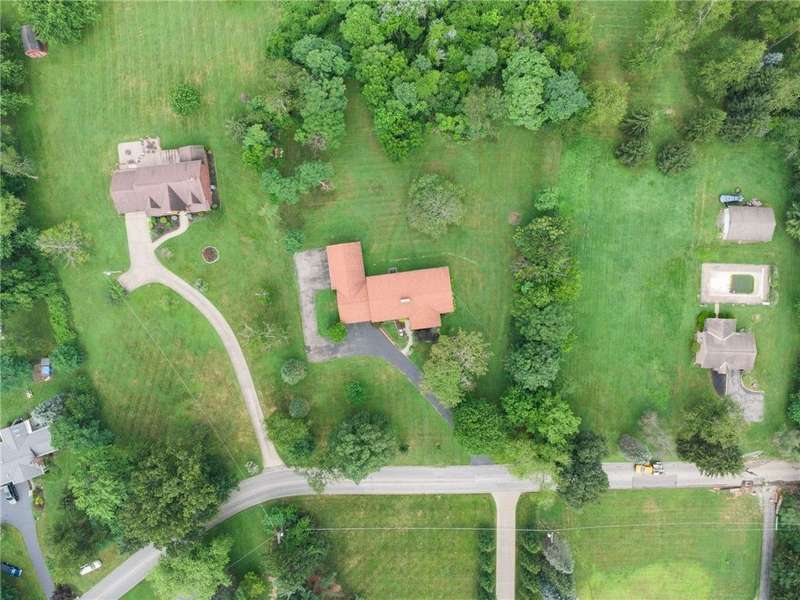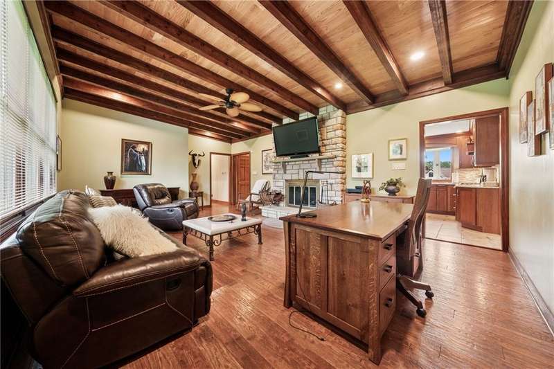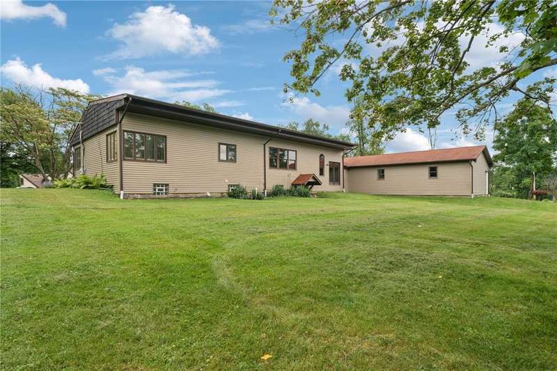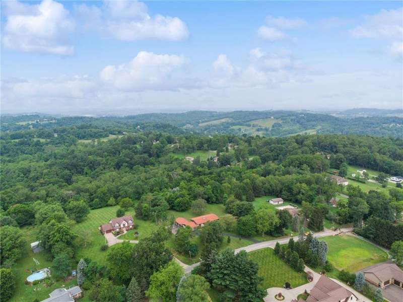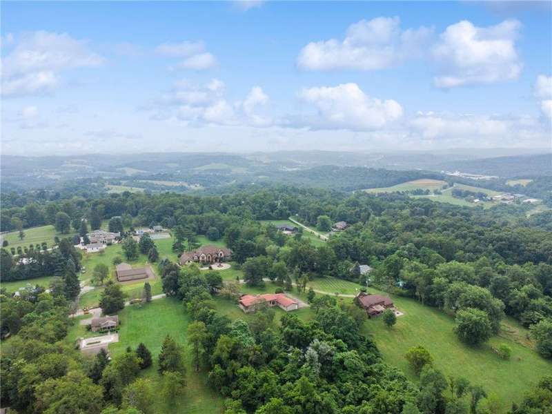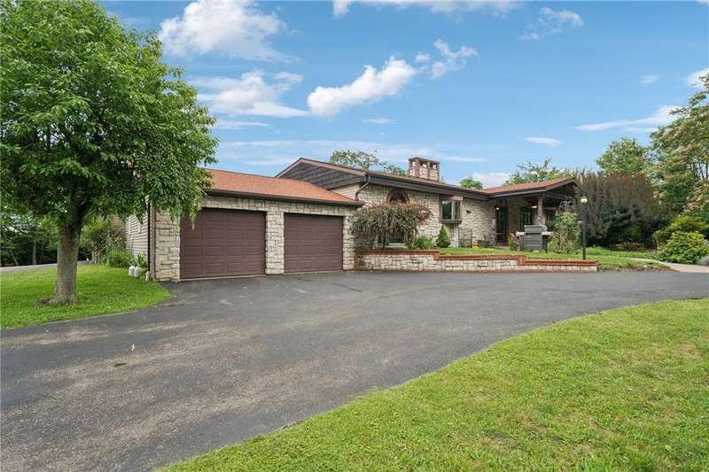 This beautiful stone ranch home offers first floor living in a park-like setting atop 2.3 idyllic acres. Move-in ready with renovated kitchen featuring granite countertops, custom cabinetry, stainless appliances including gas cooktop and double ovens, backsplash and exposed brick. Updated master bathroom has double granite sinks and standalone tub. Brimming with rustic charm, this home features hardwood flooring throughout, wood ceilings with decorative beams and three fireplaces. Finished basement with tons of storage, 5 car garage. Third bedroom is on the lower level. Gorgeous front patio boasts handsome wood ceiling, fan and porch swing: the perfect place to relax. Peace and privacy in prime location in the heart of Washington County; close to Route 19, Meadows and I-79.