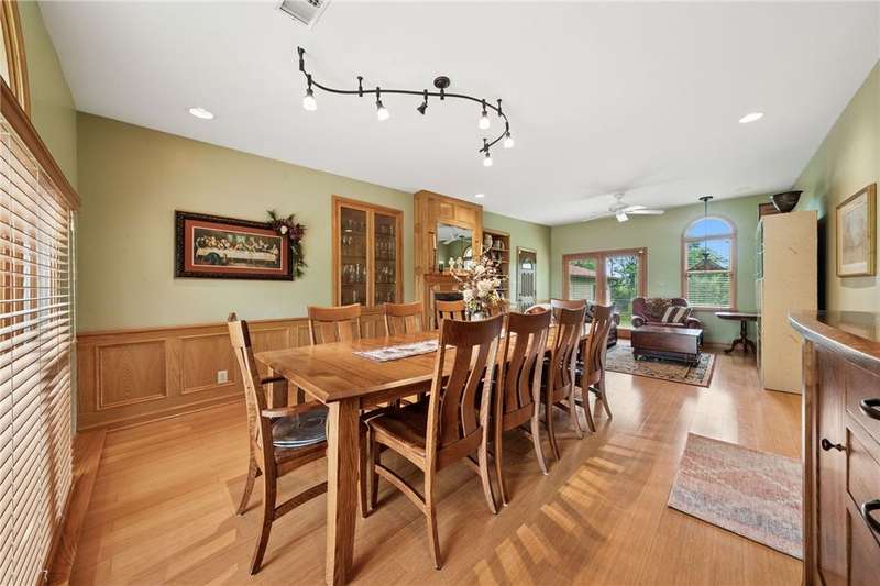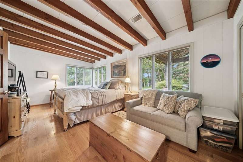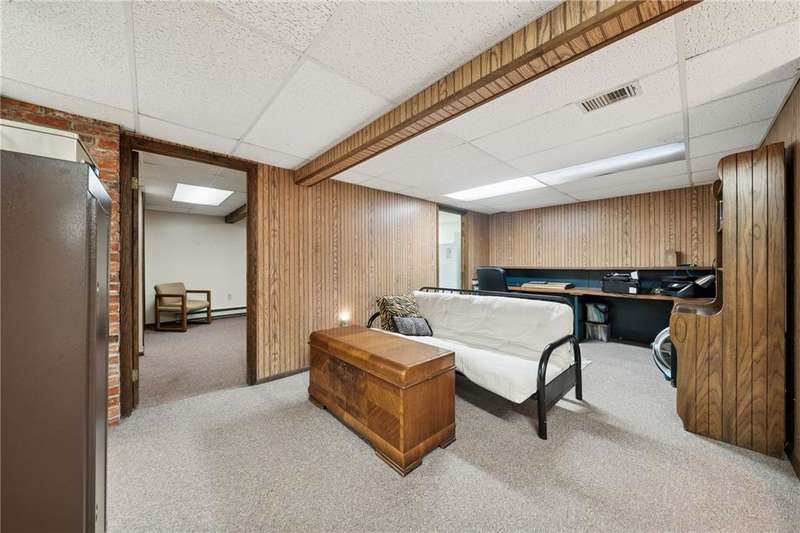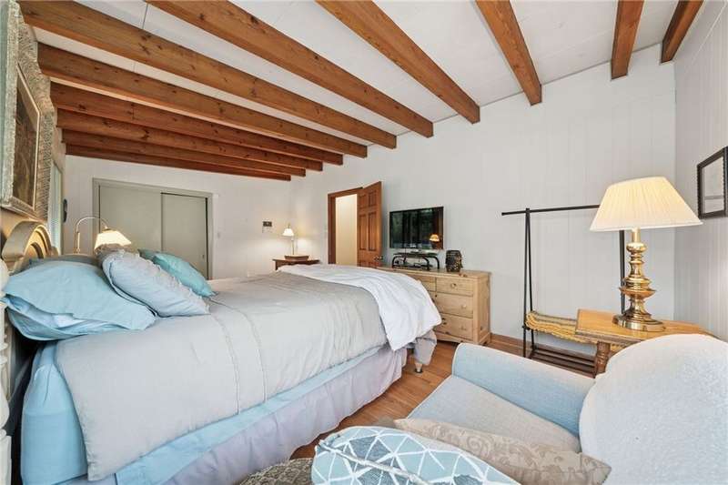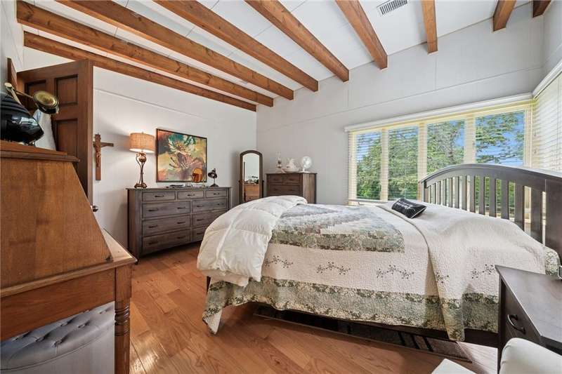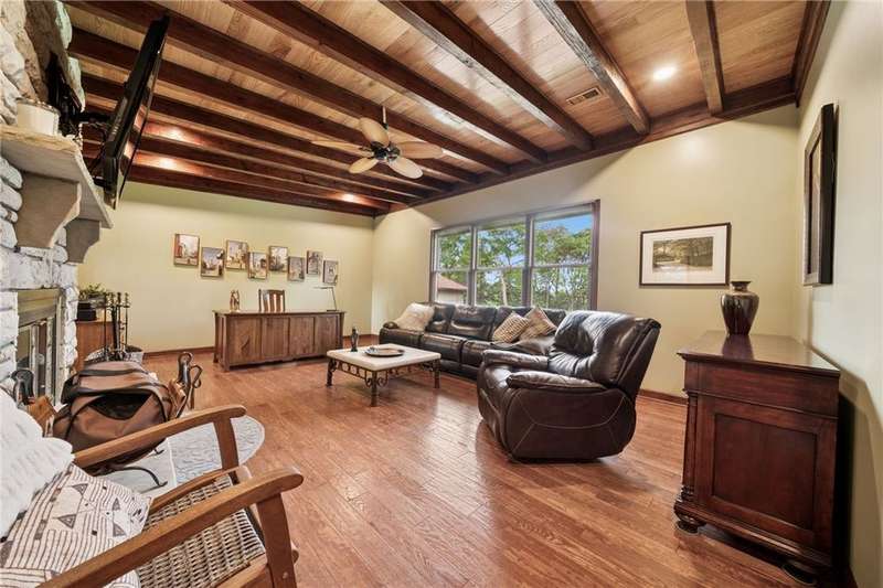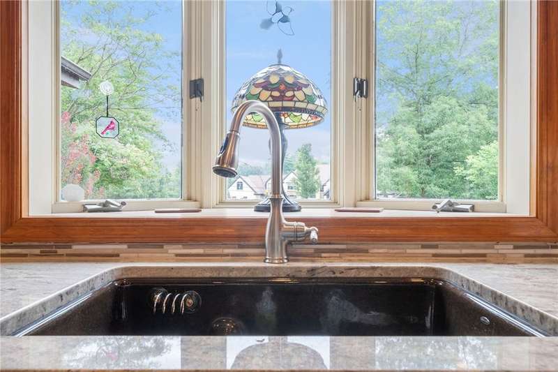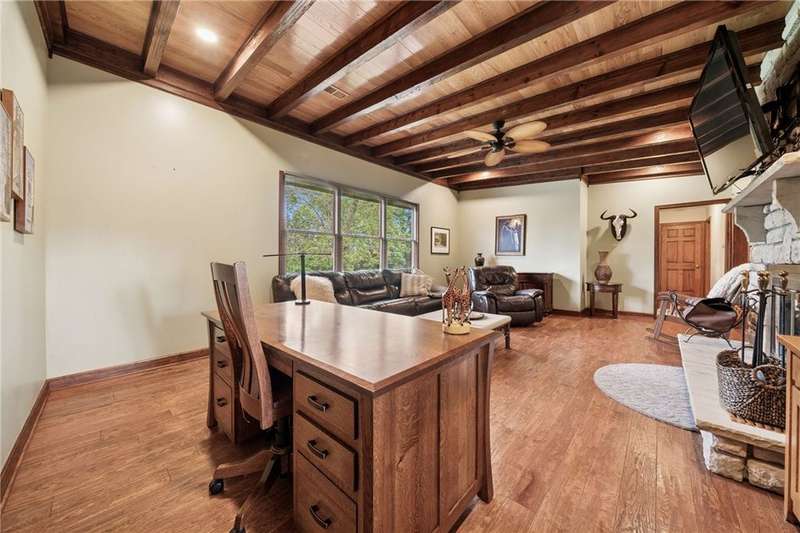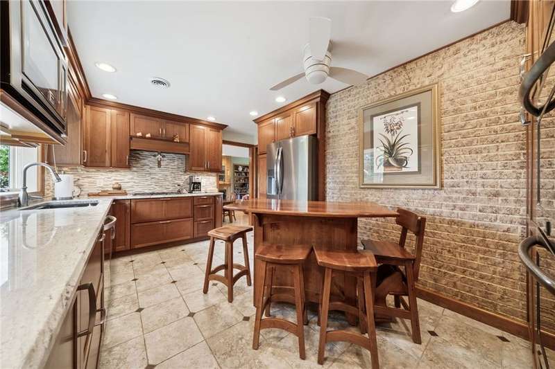 This beautiful stone ranch home offers first floor living in a park-like setting atop 2.3 idyllic acres. Move-in ready with renovated kitchen featuring granite countertops, custom cabinetry, stainless appliances including gas cooktop and double ovens, backsplash and exposed brick. Updated master bathroom has double granite sinks and standalone tub. Brimming with rustic charm, this home features hardwood flooring throughout, wood ceilings with decorative beams and three fireplaces. Finished basement with tons of storage, 5 car garage. Third bedroom is on the lower level. Gorgeous front patio boasts handsome wood ceiling, fan and porch swing: the perfect place to relax. Peace and privacy in prime location in the heart of Washington County; close to Route 19, Meadows and I-79.
