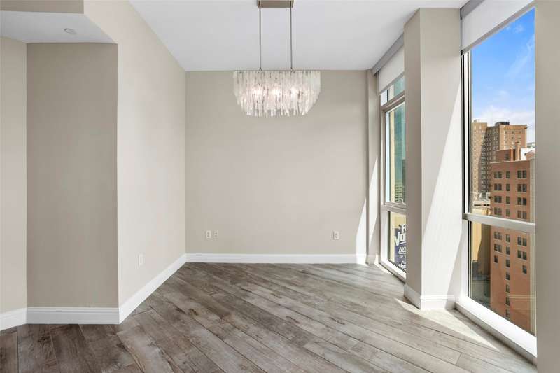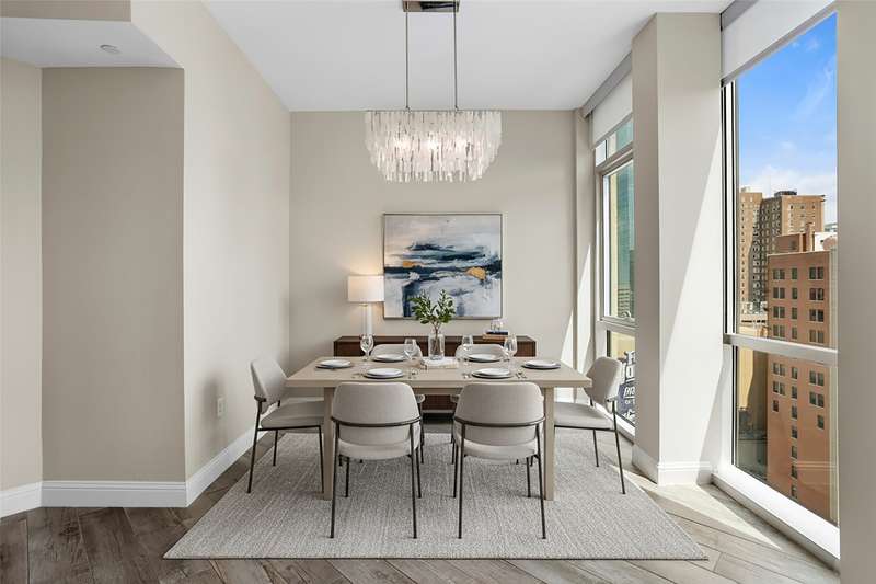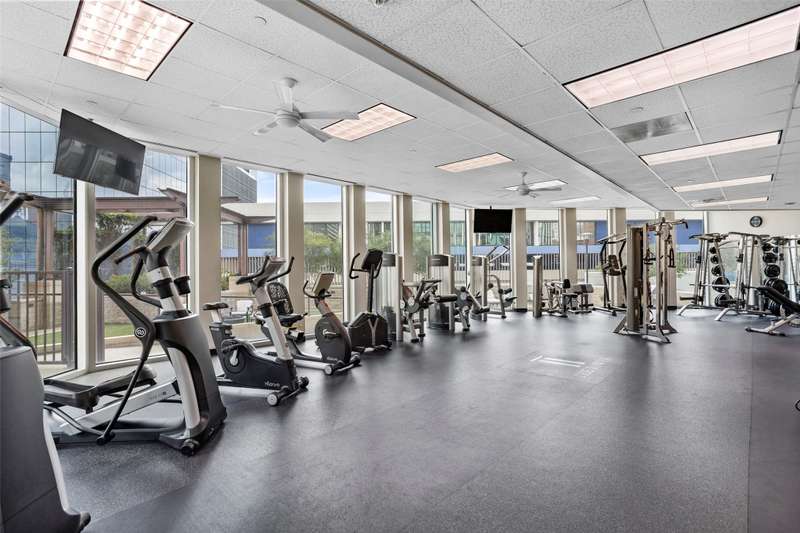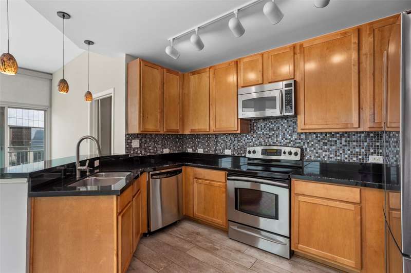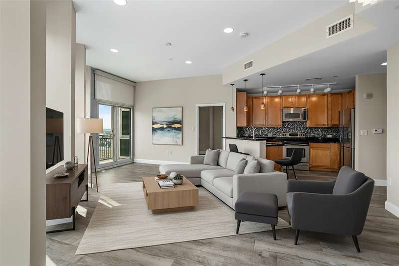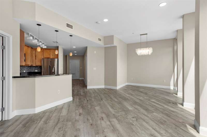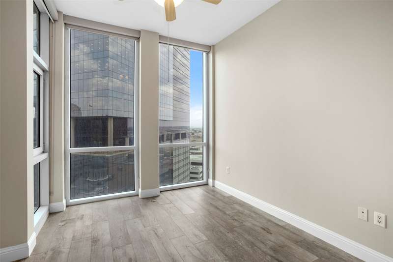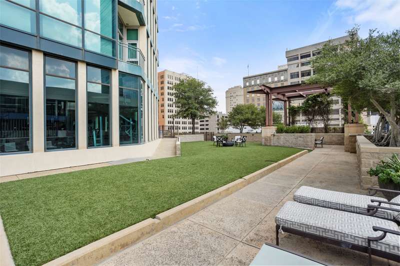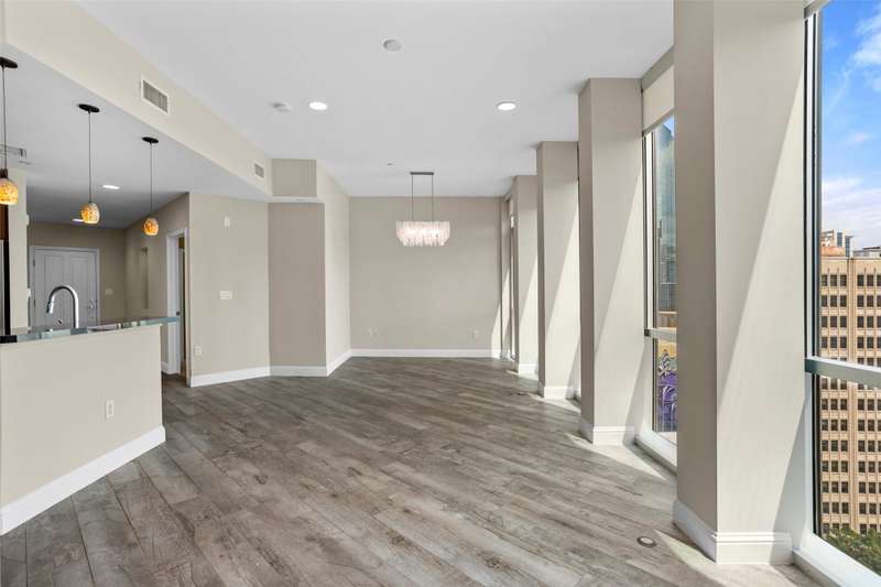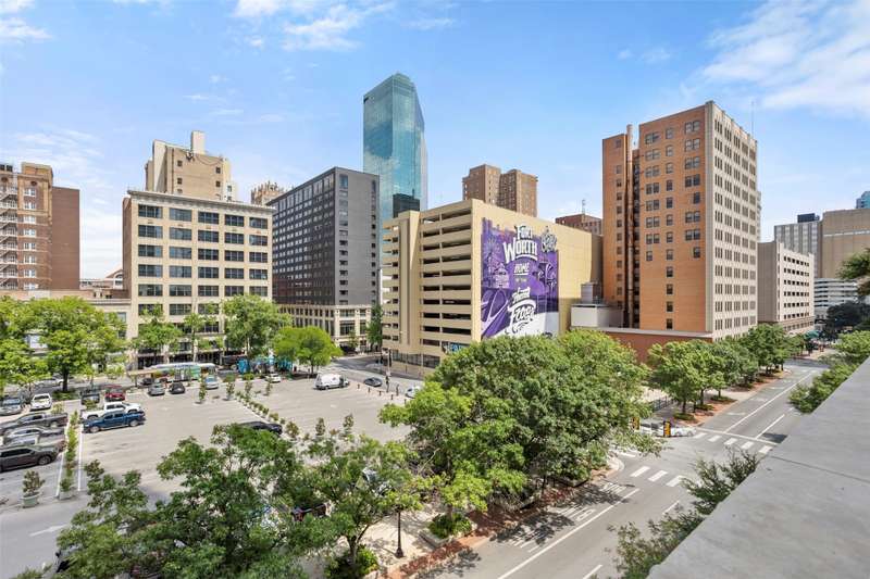 Beautifully updated and freshly painted, this 1-bedroom, 2-bath, den, living room, dining area, and 2 deeded parking space residence offers 1,124 sq. ft. of light-filled living space and spectacular skyline views from floor to ceiling windows. A unique floor plan with reconfigured walls to expand and enlarge the den and main living area, adding over 65 sq. ft. for a seamless open-concept flow. Gorgeous porcelain tile flooring with sound-deadening underlayment, private balcony overlooking downtown, perfect for enjoying Branch & Birds live music, Custom art nook with spotlight feature, Granite kitchen countertops, newer refrigerator, imported Murano glass pendants, floor-to-ceiling windows with electric sunshades + new bedroom privacy shades, Spacious primary suite with ensuite bath + full guest bath, Community Amenities: Resort-style pool & spa, grilling stations with cabanas, golf tee, firepit, fitness center, and resident lounge. Live in the heart of downtown Fort Worth with unmatched style, comfort, and convenience.